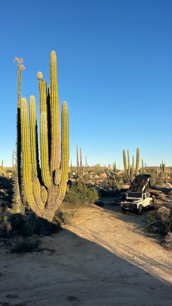 Dann ging es ins Valle de los Cirios, eine der faszinierendsten Wüstenlandschaften der Baja California. Hier wachsen einige der größten Kakteen der Welt, darunter die bis zu 20 Meter hohen Cardón-Kakteen, die nur auf der Baja vorkommen. Das Gebiet steht unter Naturschutz und wirkt fast außerirdisch: karge Ebenen, bizarre Pflanzenformen und eine unglaubliche Stille. 🌵