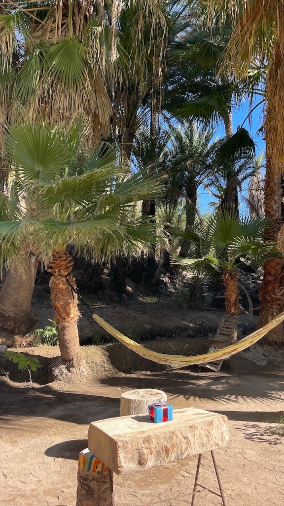 Wir checkten auf einem wunderschönen Campingplatz unter Palmen ein – mit Blick auf einen von Kakteen übersäten Bergrücken.