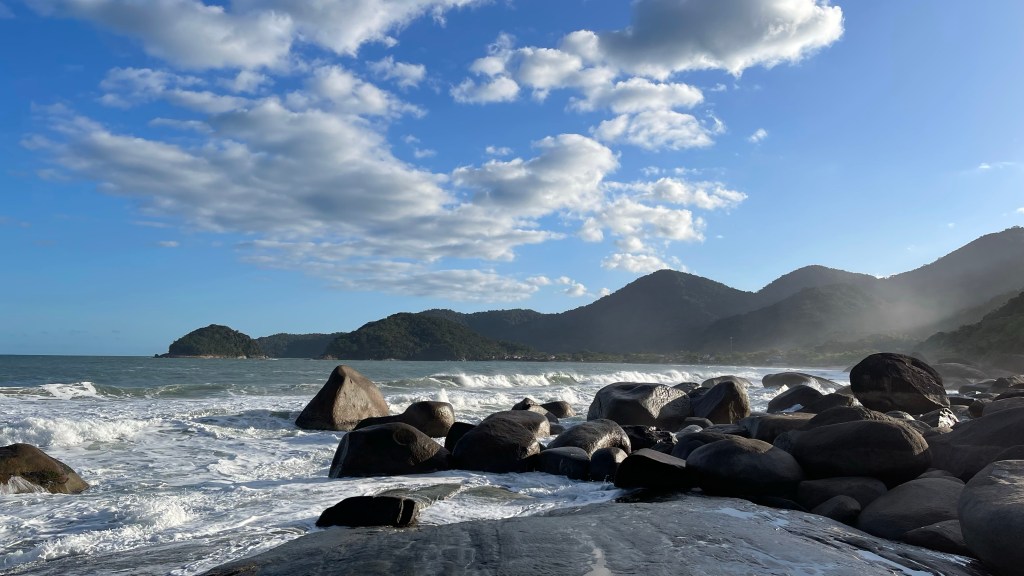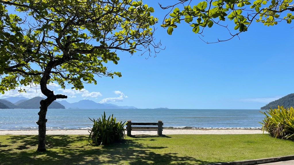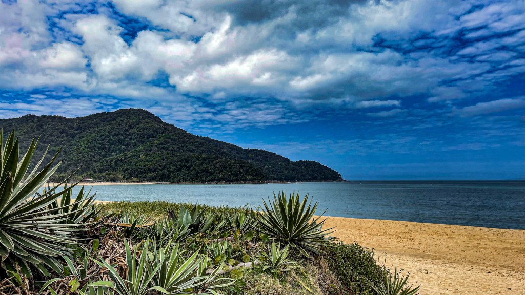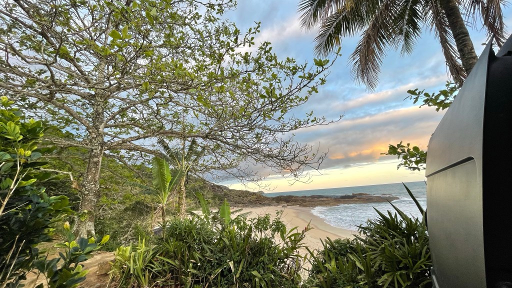 Am Morgen parkten wir unseren Van um, einige hundert Meter näher ans Zentrum und die Promenade. Von dort aus machten wir uns zu Fuß auf die Suche nach einer Bäckerei, weil es in Ubatuba gute traditionelle Bäcker geben sollte und wir wurden tatsächlich schnell fündig. 😃 Also ging es erst einmal wieder zurück zum Auto, um dort unsere soeben erstandenen Brötchen zu verspeisen. Unsere von Zuhause mitgebrachte Marmelade war leider schon leer und hier kostet ein kleines 250 ml Glas tatsächlich zwischen 4 und 5 €. 😮 Deshalb begnügen wir uns im Moment mit süßer „dulce de leche“ Karamell und Schoko bzw. Käse und Schinken. Frisch gestärkt machten wir uns wieder auf in Richtung Zentrum, diesmal am Strand entlang. Ubatuba liegt wirklich sehr malerisch, wie aus dem Reisekatalog. Breiter Sandstrand, ruhiger Atlantik, im Hintergrund sowie mit Blick übers Meer auf den Horizont überall tropische Berge. Wir fühlten uns hier tatsächlich etwas an Krabi in Thailand erinnert, nicht zuletzt auch wegen der bunten Fischerboote. 🥰 Das Zentrum ist recht überschaubar und sehr schön angelegt. An den vielen Restaurants ist deutlich zu erkennen, dass hier im Sommer wohl Hochbetrieb herrscht. Die Stadt liegt übrigens am Wendekreis des Steinbocks und begrüßt somit als Erste in Südamerika am 21./22. Dezember jeden Jahres den Sommer. Passender Weise ist mein Sternzeichen der Steinbock und ich war nun sowohl schon in Australien als auch in Südamerika am Wendekreis des Steinbocks. 😛 Nach unserem Stadtrundgang fuhren wir in Richtung Trindade, wo es angeblich die schönsten Strände von ganz Brasilien geben soll. An einem davon schlugen wir unser Nachtlager auf und der Atlantik zeigte sich hier mal wieder von seiner raueren Seite: Die Wellen tosten die ganze Nacht über recht laut und hörbar. Vermutlich auch deshalb, weil rund um den Strand große Felsen liegen. Ähnlich wie auf den Seychellen. 🏝 Abends durften wir den Sonnenuntergang und morgens früh gegen 6:30 Uhr auch noch den Sonnenaufgang bestaunen. 🌅