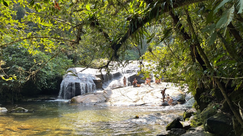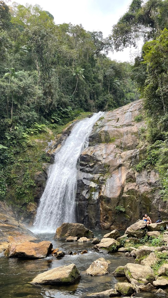 Er gab uns auch noch ein paar gute Tipps für die nähere Umgebung und so verließen wir am Sonntag, den 28.08.22 unseren Stellplatz am Strand und fuhren auf einen nahegelegenen Parkplatz am Waldrand. Der war zwar Wider seiner Aussage nicht kostenfrei, aber der ideale Ausgangspunkt für eine etwa zweistündige Wanderung durch den dicht bewachsenen, grünen atlantischen Regenwald. Der Weg führte zu insgesamt drei schönen Wasserfällen, alle mit Bademöglichkeit. Allerdings war das Wasser extrem frisch und lediglich Simon nahm ein ganz kurzes, reinigendes Bad. 😃🛁 Ich zog die Dusche am Parkplatz vor, wenn gleich diese vermutlich nicht minder kalt war. Aber zumindest konnte ich dort auch gleich noch meine Haare waschen und Simon rasierte mir zuvor noch meinen undercut nach. Was man auf Parkplätzen nicht so alles machen kann! 🤣 Nachmittags zog sich der Himmel zu und es begann leicht zu nieseln. Wir fuhren noch einige wenige Kilometer in Richtung Sao Sebastiao bis zu einem Parkplatz in direkter Strandnähe, an dem sich auch ein kleiner Kiosk (mit WLAN) sowie ein Restaurant (mit Toilette) befand und verbrachten dort die Nacht.