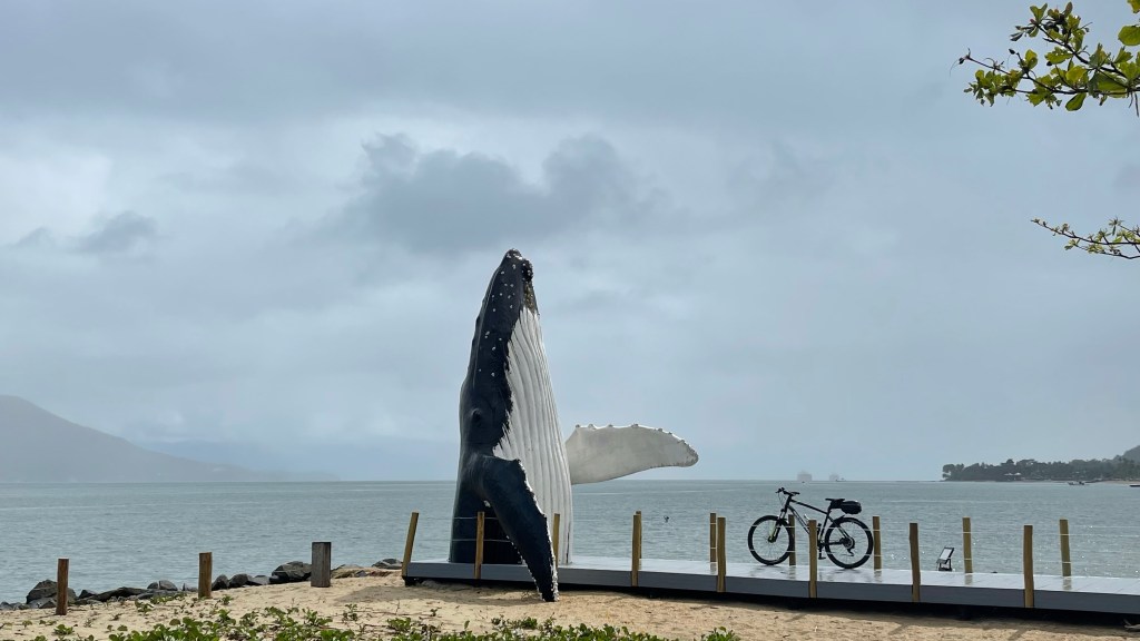 Am folgenden Morgen war es zwar trocken, aber zum Teil immer noch stark bewölkt und ab und an nieselte es auch mal ganz kurz. Trotz allem nahmen wir mal die Räder vom Auto und fetteten erst einmal die Ketten, die bereits nach knapp drei Wochen Reise durch die Ausfahrten am Strand und die feuchte Luft schon stark rostig waren. 😮 Wir frühstückten gemütlich und beobachteten derweil das Wetter. Als es über der Ilha Bela etwas heller wurde packten wir dann doch den Rucksack und machten uns auf zur Fähre. Für Fußgänger und Radfahrer war die 15minütige Überfahrt zur Insel sogar kostenfrei. 👍 Dort angekommen folgten wir dem gut ausgebauten Radweg immer an der Küste entlang bis zu dem kleinen Örtchen „Vila“ mit historischem Ortskern. Der Radweg bog hier wohl irgendwo von der Küste ab und so entschieden wir kehrt zu machen und fuhren in Richtung Fähre zurück. Auf dem Rückweg kauften wir bei einem Fischer noch vier schöne, große Langustinen für das Garnelen-Risotto am Abend. 😛 Die Ilha Bela heißt auch Insel der Wasserfälle, weil es dort insgesamt 360 davon gibt. Also kann man in einem Jahr quasi jeden Tag einen anderen besuchen. Da wir jedoch die Räder dabeihatten und diese zum Wandern nicht einfach irgendwo abstellen wollten, traten wir wieder den Rückweg mit der Fähre an. Gerade rechtzeitig wie sich herausstellte! Wieder am Van angekommen schlug das Wetter erneut um und die Insel hing wieder in dichten Wolken. So konnten wir getrost die Weiterfahrt nach Ubatuba antreten (ca. 70 km), wo wir auch relativ schnell einen schönen Stellplatz für die Nacht fanden. Erneut direkt am Wasser mit Blick auf die bunten Fischerboote. 🚤