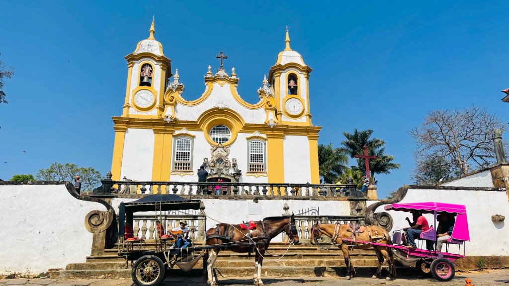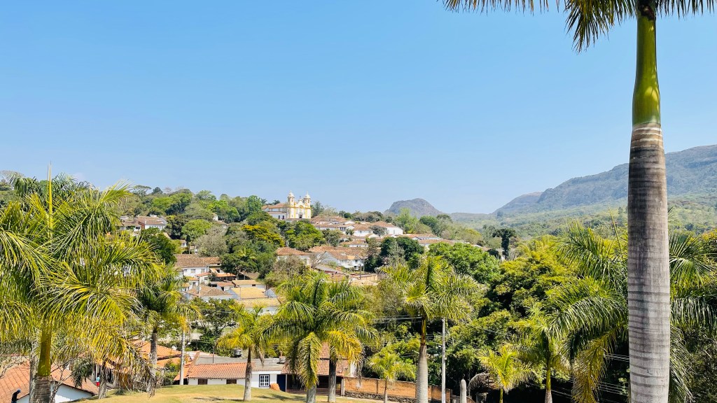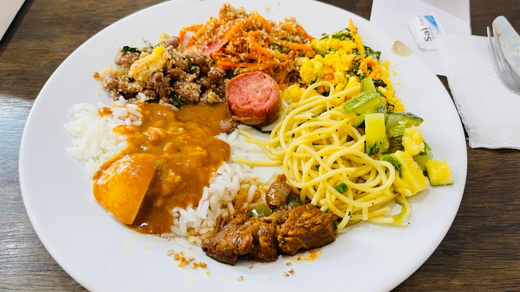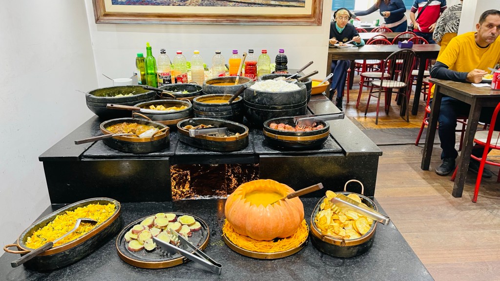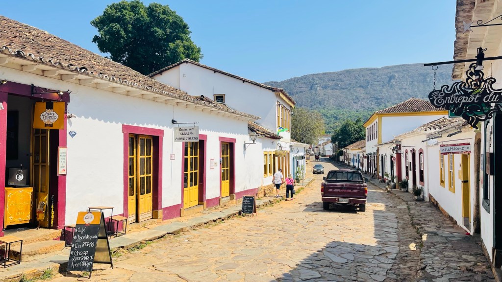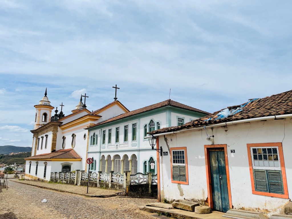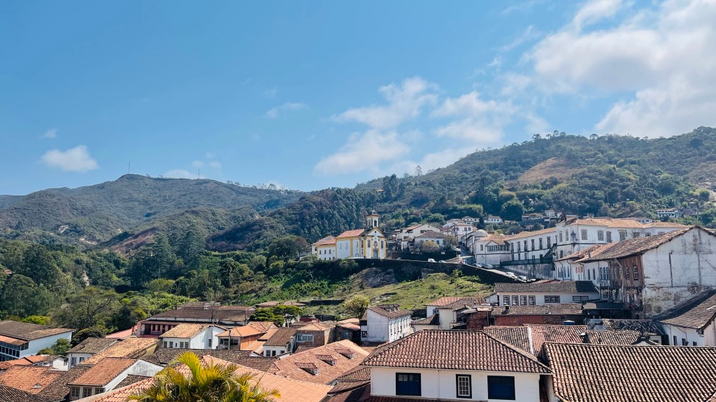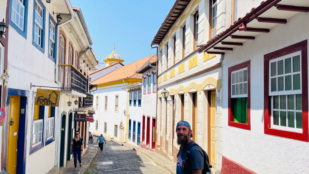 In dieser Nacht schlief ich richtig gut und nach dem morgendlichen Kaffee machten wir uns direkt auf den Weg ins ca. 15 km entfernte „Ouro Preto“. Die Stadt gilt als das „Kronjuwel“ unter den brasilianischen Barockstädten, weil hier keinerlei Neubauten in der gesamten weitläufigen Altstadt zu finden sind. Das durch den Goldabbau eingenommene Geld wurde damals zum Großteil in die Architektur der Stadt investiert. Die Gassen sind zum Teil sehr eng und steil und man bewegt sich durchweg auf Kopfsteinpflaster. Zum Glück konnten wir unseren Van beim nahegelegenen Busbahnhof abstellen und von dort aus zu Fuß die Stadt der 23! Kirchen erkunden. Wir haben die Kirchen nicht gezählt aber definitiv sahen wir nicht alle – für unseren Geschmack jedoch genug davon. 😂 Um die Mittagszeit suchten wir das im Reiseführer als gut und günstig beschriebene Restaurant „Tiradentes“ auf. Dort gab es typische Küche aus der Region „Minas Gerais“ in welcher die Stadt „Ouro Preto“ liegt. Typisch für diese Küche ist mitunter, dass in Töpfen und Pfannen aus Stein auf Feuer gekocht wird. Das Mittagsbüffet kostete schlappe 6! € pro Person (vor Corona waren es wohl sogar nur 3 € pro Kopf) und wir konnten uns bei allem bedienen: Es gab eine Auswahl an Salaten & Rohkost, diverse Beilagen wie Reis, Polenta und selbst gemachte Chips, verschiedene Fleischsorten wie dünne Schweinschnitzel, geschmortes Rindfleisch sowie Hühnchen und natürlich reichlich Gemüse und Spaghetti. Nach dem üppigen Mahl entschieden wir direkt, das Abendessen heute zu streichen. Stattdessen machten wir uns am frühen Nachmittag auf die Fahrt bis nach „Tiradentes“. Hier kamen wir mit Einbruch der Dunkelheit um kurz nach 18 Uhr an und durften freundlicherweise auf einem großen, wenn auch nicht bewachten, Parkplatz eines Hotels übernachten.