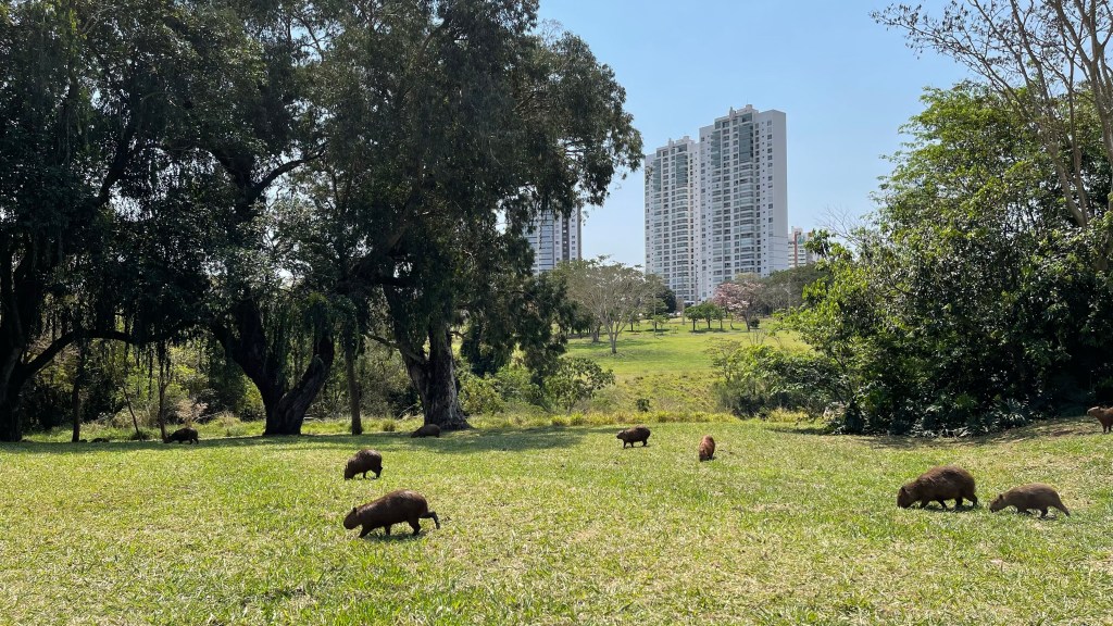 Am Sonntag hatten wir es nicht mehr weit bis „Campo Grande“. Wir waren total erstaunt, wie ruhig es in der 850k Einwohner Stadt war. Es gab kaum Verkehr auf den Straßen und das Stadtbild war, wie mittlerweile gewohnt, sehr sauber und ordentlich. Eigentlich nicht von einer europäischen Stadt zu unterscheiden. Wir steuerten direkt den sehr weitläufigen Stadtpark im Zentrum an, um uns nach den zahlreichen Fahrtagen endlich mal wieder die Füße zu vertreten. Es war relativ warm an diesem Mittag, die Temperatur lag knapp über 30 Grad und so war es auch nicht verwunderlich, dass wir einige der wenigen Besucher waren. Wir konnten sehr viele „Capybaras“ (= Wasserschweine) sehen, welche sich an dem aufgestauten Bachlauf sowie an dem großen künstlich angelegten See sicherlich sehr wohl fühlen. Neben dem Spazier- und Fahrradweg durch den Park gab es auf den Grünflächen viele schattenspendende Bäume. 🌳 Wir konnten auch einige ausladende Mangobäume entdecken welche bereits übervoll mit Früchten waren. 😮 Schade, dass die Erntezeit erst im Dezember/Januar ist! Auch den üppig gelb bzw. rosa blühenden Nationalbaum „Ipê“ konnten wir bewundern. Da diese Bäume keine Blätter, sondern nur Blüten, tragen sind sie umso schöner. 😍 Nach unserem langen Spaziergang machten wir es uns noch im Schatten auf unserer Picknick-Decke gemütlich und genossen vor der Weiterfahrt noch Kaffee und Kuchen. ☕🍰 Durch die Zeitverschiebung wird es jetzt leider auch eine Stunde eher dunkel. Eigentlich vermeiden wir es zwecks Wildwechsel und Schlaglöchern im Dunkeln zu fahren aber diesmal war es nicht ganz zu verhindern. Wir durften während der abendlichen Fahrt einen herrlichen Sonnenuntergang über der Savanne und den Bergen des „Pantanal“ genießen. 💕 Genauso haben wir es uns vorgestellt! Ein Himmel in den schönsten Lila, Orange und Rot Tönen in welchem sich die Konturen der Bäume abzeichnen. Wir kamen gut an einem der wenigen, größeren Postos auf dieser Strecke an und hatten eine mehr oder minder gute Nacht. Dank der hohen Temperaturen war es in unserem Van, trotz Ventilation des Lüfters in der Dachluke und der Standheizung, ziemlich warm und entsprechend unruhig schliefen wir.