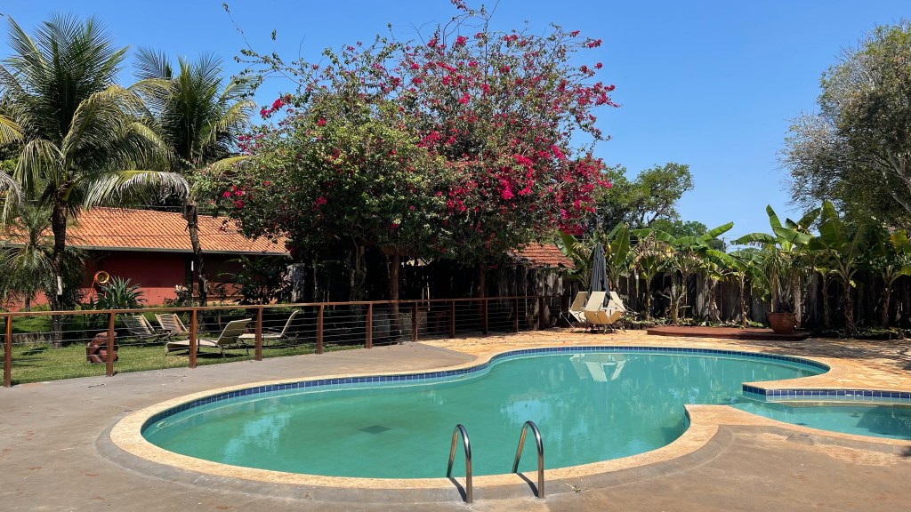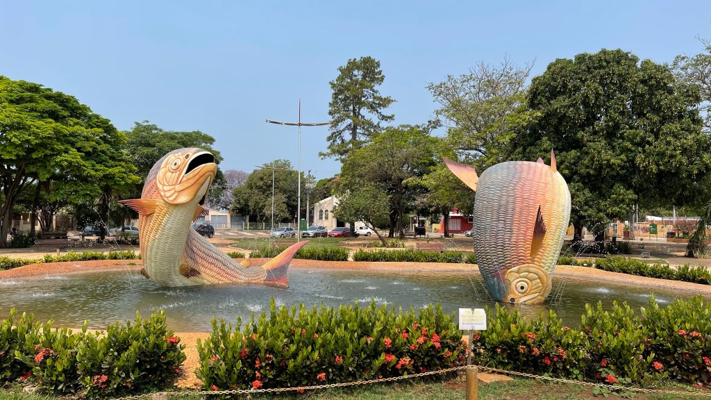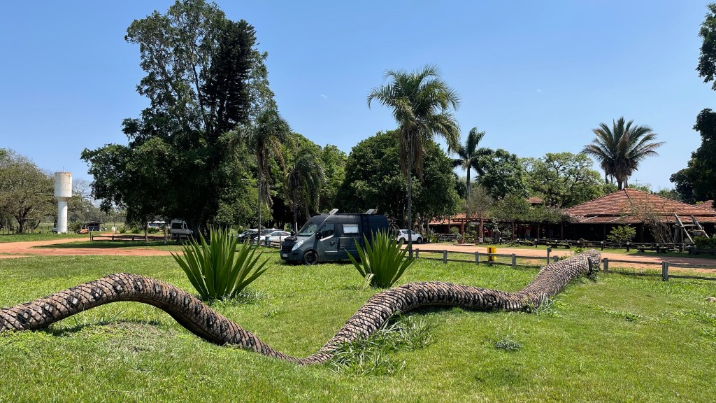 Wir hatten auf dem Parkplatz eine sehr ruhige und angenehme Nacht. Nach dem wir in aller Ruhe gefrühstückt hatten, machten wir uns zu Fuß auf in Richtung Zentrum. Der Ort ist nicht wirklich schön und eigentlich konzentriert sich alles Wesentliche auf die 3 km lange Hauptstraße. Hier befinden sich diverse Einkaufsläden, einige wenige Restaurants sowie Eisdielen und am oberen Ende die beiden Supermärkte. Wir schlenderten die Straße auf der einen Seite hoch und auf der anderen wieder zurück zum Van. Dort angekommen schnappten wir unsere Badesachen und nahmen die Fahrräder, um mit diesen bis zum „Balneário Municipal“ (dem städtischen Naturfreibad) zu fahren. Von unserem Guide Max hatten wir den Tipp bekommen, dass sich direkt nebenan ein schöner Campingplatz mit Zugang zum Wasser des „Rio Formoso“ befindet. An diesem angekommen erkundigten wir uns zuerst nach den Preisen. 60 Real (12 €) müssten wir pro Tag und Person berappen um hier zu stehen 😮. Ab drei Tagen bekämen wir einen Rabatt in Höhe von 10 Real. Das wären aber umgerechnet immer noch rund 10 € pro Kopf und Tag. Wir schauten uns auf dem weitläufigen Gelände um und der Badebereich war wirklich sehr idyllisch. Von zwei Plattformen aus könnte man in den Fluss einsteigen und dort in den natürlichen Becken und sogar unter einem kleinen Wasserfall baden. Aber so viel Geld bezahlen, nur um letztendlich auf einem Rasenplatz zu stehen?! Klar hätten wir dort auch einen Wasseranschluss und sogar eine kleine Außenküche mit Grill und auch die Sanitäranlagen wären natürlich im Preis inbegriffen. Aber an und für sich brauchen wir nichts davon, weil wir mit unserem Van komplett autark stehen können. Die Tankstelle gegenüber von unserem aktuellen Stellplatz bietet ebenfalls Toiletten und sogar Duschen. Beides noch dazu kostenlos. Der zweite Campingplatz nebenan war sogar noch schöner und hatte noch mehr Zugänge zum Fluss um dort zu baden. Dafür war der Preis auch noch einmal um 5 Real höher. So entschieden wir vorerst bei unserem kostenfreien Stellplatz zu bleiben. Eventuell würden wir einen der Campingplätze an einem schönen Tag zum Baden nutzen, weil der Eintritt in die Schwimmbäder fast genauso teuer ist wie dort zu übernachten. Oder wir gehen nur in eines der Bäder. Mal sehen… Wir schafften es gerade noch vor dem Gewitterschauer wieder zurück ans Auto. Abends gab es noch einmal selbst geangelten Fisch, einen „Piau“. Dieser war geschmacklich etwas fad aber mit der leckeren Pasta dazu dennoch ein Genuss. Der Regen hielt dann auch die ganze Nacht über an, mal mehr und mal weniger stark. Wobei wir bisher bis auf ein oder zwei kurze Schauer noch keinen nennenswerten Regen während unserer gesamten Reise hatten. Und im „Pantanal“ war es in den vergangenen Jahren in der Regenzeit auch stets eher zu trocken und die Bewohner hoffen daher dieses Jahr sehnlichst auf größere Wassermengen. Die Gewitter, die für die kommenden Tage gemeldet sind, künden langsam aber sicher das Ende der Trockenzeit an.
