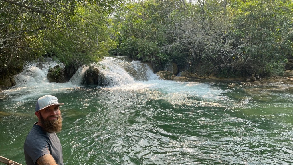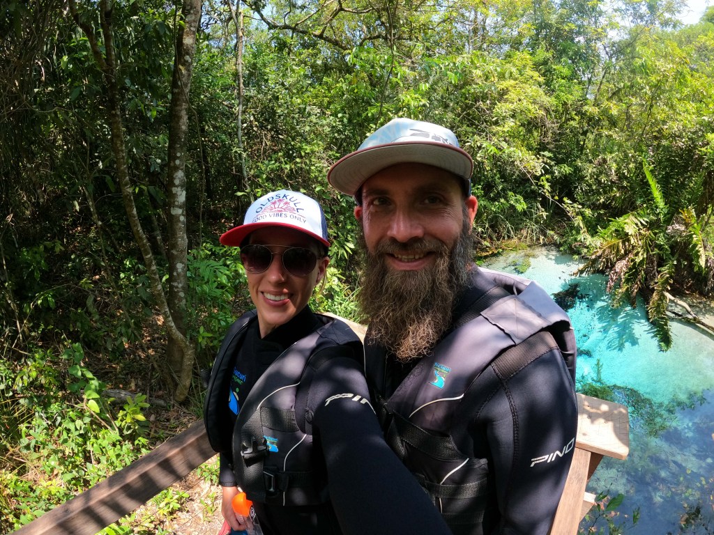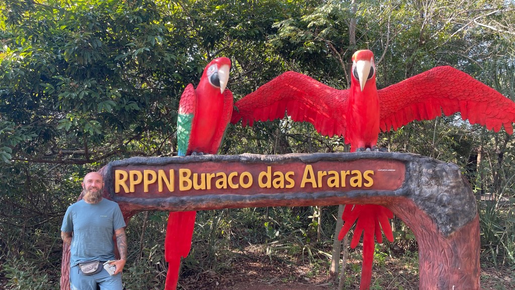 Am Morgen wurden wir von strahlendem Sonnenschein und einem leicht irritierten Guide empfangen. Dieser erkundigte sich leicht säuerlich, ob wir denn hier übernachtet hätten obwohl doch alles geschlossen war. Ich bejahte dies und erklärte ihm, dass wir am Vortag in dem Freibad ganz in der Nähe waren und für heute um 11 Uhr hier einen Schnorchel-Trip gebucht hatten und wir schlicht weg nicht den ganzen Weg bis in die Stadt zurückfahren wollten und hier leider niemanden angetroffen hätten. Die Erklärung war ihm dann auch schon genug und er lud uns freundlich ein, den gesamten Bereich sowohl vor als auch nach unserer Tour zu nutzen. Er bat mich lediglich darum, direkt an der Rezeption einzuchecken was ich dann auch umgehend tat. Wir hatten noch genug Zeit bis zum Start der Tour, um gemütlich im Van zu frühstücken und uns auf dem schön angelegten Gelände umzusehen. Um 11 Uhr wurden wir dann von unserem, leider nur portugiesisch sprechenden Guide, empfangen und mit Neoprenanzug, Schwimmweste sowie Wasserschuhen ausgerüstet. Schnorchel und Brille mussten wir uns nicht leiden, da wir unsere eigenen full-face Masken mit auf die große Reise genommen haben. 😉 Insgesamt zu acht plus Guide ging es dann auf die Pritsche eines kleinen Pick-Ups, welcher uns auf das nahegelegene Gelände der Fazenda brachte auf welchem sich ein Teil des Flusses sowie der Einstieg in selbiges Gewässer befand. Es ging über ein Stück Wanderweg durch den schattigen Wald, vorbei an der unglaublich klaren Quelle bis zum Steg und dessen Plattform. Dort konnten wir in den Fluss hüpfen und uns dank der Schwimmwesten immer mit der Strömung rund 1.800 Meter hinuntertreiben lassen. Das Wasser war wie versprochen kristallklar. Man konnte jedes Kieselsteinchen auf dem Bodengrund sowie jede Blattader der Wasserpflanzen gestochen scharf erkennen und den Fischen beim Fressen zusehen. Es fühlte sich an, als würde man in einem frisch angelegten Aquarium schnorcheln. 😍 Fische gab es zwar nicht so viele, dafür aber wieder schöne große wie auch schon am Tag zuvor im Freibad: Wir konnten Pacus, Doraden, Piaus, Piraputangas und kleine Welse sehen. Am Ende des Floatings angelangt konnten wir den Fluss über eine weitere Plattform verlassen und wurden mit dem Pick-Up wieder zurück zum Ausgangspunkt und somit auch unserem Stellplatz gebracht. Den Nachmittag verbrachten wir noch auf dem Gelände und ließen uns die Gelegenheit, dort kostenlos heiß zu duschen, natürlich nicht entgehen. Mit auf unserer Tour waren zwei sehr nette, englischsprechende Brasilianer die uns freundlicherweise auch ihre Unterwasseraufnahmen zur Verfügung stellten. Danke an Ronaldo an dieser Stelle! Ansonsten könnten wir euch hier gar keine Fotos zeigen. Am frühen Abend machten wir uns dann über einen weiteren Erdweg auf in Richtung „Jardim“, wo wir für den kommenden Morgen um 7 Uhr Tickets für das „Buraco das Araras“ erworben hatten. Auf der rund 65 km langen Fahrt konnten wir noch einmal ganz viele tolle Tiere entdecken: Einige Ameisenbären auf Nahrungssuche, ein wunderschönes rot-blaues Ara-Paar und sogar ein Gürteltier am Straßenrand. 🥰 Wir hatten eigentlich gehofft, direkt am Eingang zum Ara-Krater übernachten zu können. Dies war jedoch leider nicht möglich, weil das Einfahrtstor über Nacht geschlossen wurde. So übernachteten wir einfach direkt davor, mit Einverständnis einer der Mitarbeiterinnen. 😃