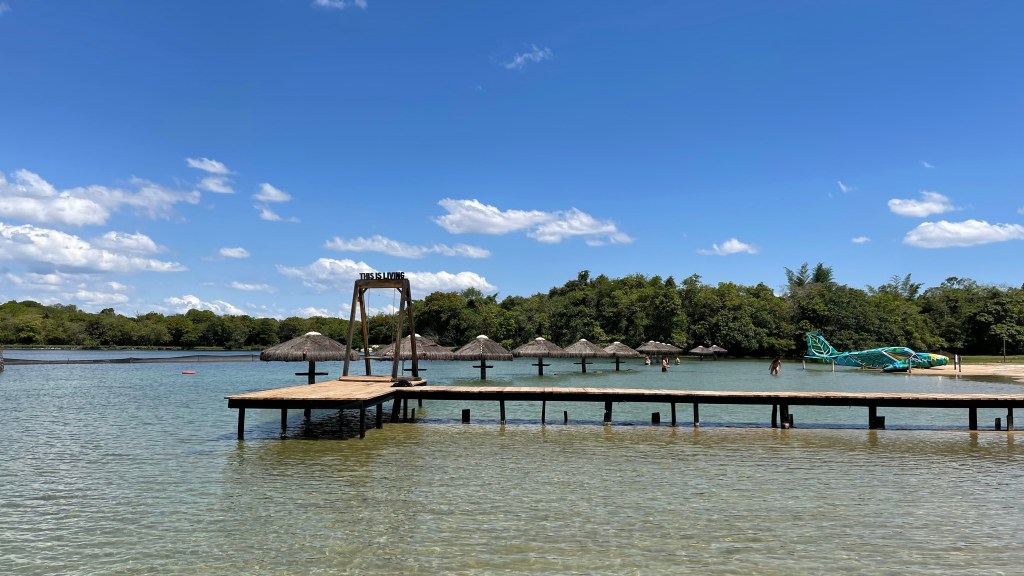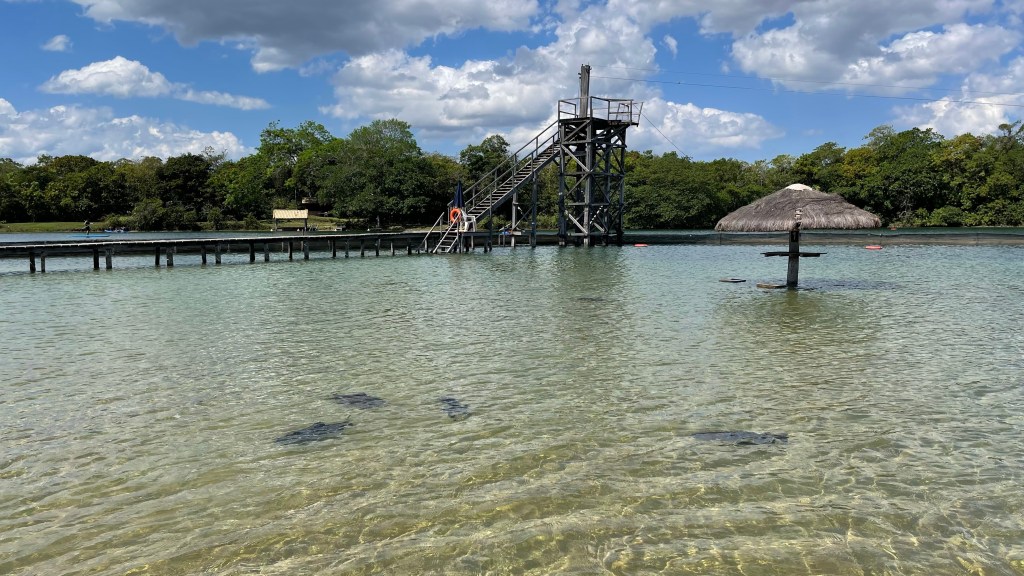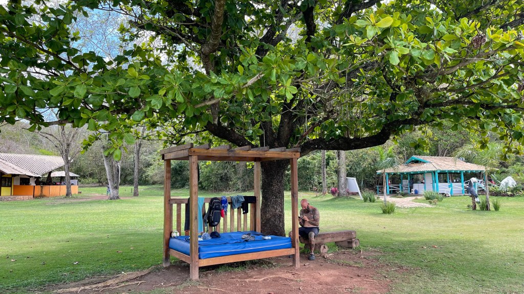 Am Sonntag verabschiedeten wir uns dann nach 6 ruhigen Nächten von unserem Stellplatz in Bonito und machten uns auf den Weg zum Supermarkt. Dieser war wirklich günstig und so nutzten wir noch einmal die Gelegenheit, um unsere Vorräte aufzufüllen. Ebenso stoppten wir auch noch an der Tankstelle, um für die Weiterfahrt noch einmal aufzutanken. Danach ging es dann erneut über den Erdweg direkt zum „Praia do Figeira“. Wir frühstückten noch auf dem Parkplatz bevor wir dann unsere Badesachen packten und uns zum Eingang begaben. Wir konnten einen tollen Liegeplatz im Schatten eines großen Feigen-Baumes ergattern, unter dem sich ein bequemer und sogar überdachter Platz mit breiter sowie einladender Matratze befand. Von dort aus konnten wir direkt auf den großen See blicken, dem allerdings eindeutig einiges an Wasser zu fehlen schien. 😯 Kein Wunder, schließlich näherten wir uns ja gerade dem Ende der Trockenzeit. Sowohl im als auch am Wasser befanden sich jeweils runde, feststehende Sonnenschirme inklusive der dazugehörigen Sitzgelegenheiten. Am Strand gab es außerdem noch eine Snack-Bar und weiter oben, hinter unserem Liegeplatz, ein Restaurant. Kurioser Weise durfte heute, auf Grund der Präsidentschaftswahlen, kein Alkohol ausgeschenkt werden. Warum wissen wir allerdings nicht so genau. Eventuell um Ausschreitungen zu vermeiden, oder damit die Leute während der Wahl einen klaren Kopf haben?! 😲 Das absolute Highlight war die Zip-Line. Mit Schwimmweste ausgestattet konnte man über einen Holzsteg ins Wasser zu einem Turm laufen. Dort oben angekommen schnappte man sich dann den Griff, welcher an dem Stahlseil befestigt war und konnte so über den See hinab ins Wasser rutschen. Was für ein Spaß! 😀 Außerdem gab es im angelegten Kinderbereich noch eine breite Wasserrutsche, welche auch wir Erwachsenen benutzen durften. Diese war ebenfalls nicht von schlechten Eltern. 👍 Im Eintrittspreis von 69 Real wäre auch der Verleih von Tretbooten, Stand-Up Paddles und Kajaks inbegriffen gewesen. Wir waren allerdings zu faul und relaxten stattdessen lieber auf unserem tollen day-bed. 🤣 Um 17 Uhr war der Spaß dann auch schon wieder zu Ende und wir machten uns auf zur „Nascente do Sucuri“, wo wir ja bereits am Tag zuvor mit den Rädern den Stellplatz für die Nacht ausgekundschaftet hatten. Dort nutzten wir noch den Wasseranschluss im Freien, um unseren inzwischen ganz leeren Wassertank wieder aufzufüllen. Wir parkten unseren Van im Außenbereich, damit sich am Folgetag möglichst niemand über unsere Anwesenheit beschweren konnte und kochten noch zu Abend. Tatsächlich wäre sowohl der Sanitär- als auch der Restaurant- und Pool-Bereich frei zugänglich gewesen. Selbstverständlich betraten wir die Anlage nur auf der Suche nach einer verantwortlichen Person, die wir aber nicht antreffen konnten, und wunderten uns über das offensichtliche Vertrauen in die Menschheit. Erstaunlicherweise war die Nacht dort aber weniger ruhig als erwartet, weil tatsächlich die ganze Zeit über ziemlich laute Tiergeräusche zu hören waren. 😮