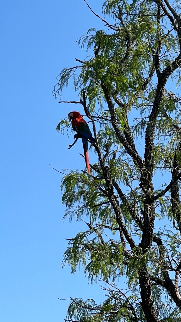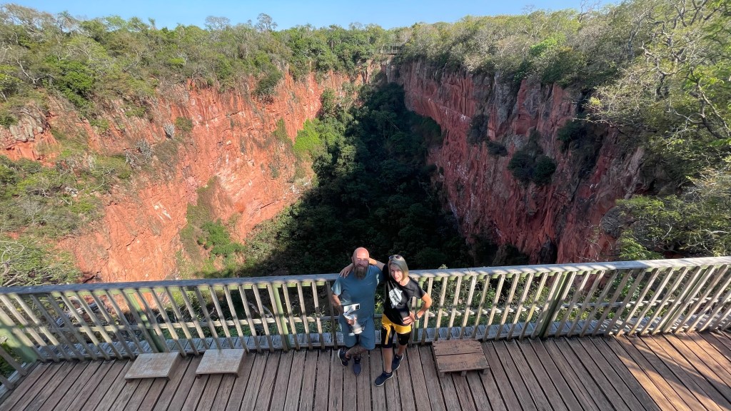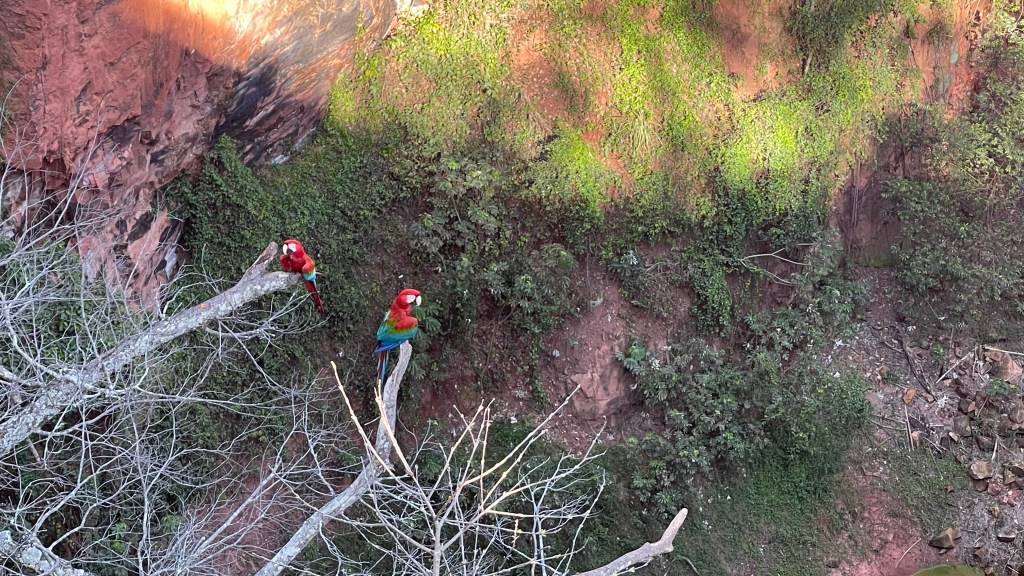 Dank der idealen Lage unseres Stellplatzes schafften wir es dann am folgenden Morgen auch locker um 7 Uhr die restlichen Meter bis zum Eingang zu fahren. 😉 Dort angekommen wurden wir von einer netten und glücklicherweise englischsprechenden jungen Dame empfangen, die uns kurz darauf mit auf die private Tour nahm. Allem Anschein nach konnte sich außer uns niemand für die frühen Tickets begeistern. 😅 Das Kraterloch, in welchem geschätzte 60 Ara-Paare leben (Aras sind tatsächlich monogam) ist mit einem Umfang von 500 Metern sowie einem Durchmesser von 160 Metern und einer Tiefe von 100 Metern das Größte in ganz Südamerika. Entstanden ist es wohl durch die Erosion von dem innen liegenden Kalkstein so dass über die Jahrhunderte nur noch der Rote Sandstein des Kraterrandes erhalten blieb. Ein Farmer erwarb das Gelände im Jahr 1986 und wusste damals nichts von dem darauf befindlichen großen Krater. Erst nach dem mehrere Kühe auf unerklärliche Weise verschwanden (weil sie in das Loch stürzten), entdeckte er diesen und entschied, die Fläche nicht als Farmland sondern als Öko-Park zu nutzen. Er bat das Militär um Hilfe, um den ganzen Müll und anscheinend auch einige sterbliche Überreste von Menschen (scheinbar wurden hier auch Menschen entsorgt 😮) aus dem Krater zu entfernen. Sein Projekt der Ara-Wiederansiedlung glückte und so hatten wir heute die einmalige Gelegenheit, diese herrlichen und majestätischen Tiere aus nächster Nähe zu beobachten. Am schönsten war es tatsächlich, die Tiere von der Aussichtsplattform aus im Flug zu beobachten. Dann konnte man auf ihre ausgebreiteten, weiten Schwingen blicken und das herrlich bunte Gefieder bewundern. Mit dem Fernglas konnten wir sogar zwei kleine, noch graue Ara-Junge in ihrem Nest in der Felswand erspähen. ❤ Die Rundtour dauerte ca. 1-1,5 Stunden und unsere Führerin gab sich sehr viel Mühe und teilte viele Hintergrundinfos, auch über die Tierwelt rundum. Ob der Eintrittspreis von 18 € pro Kopf dafür gerechtfertigt ist bleibt dahingestellt. Schön war es auf jeden Fall und nach der Tour stärkten wir uns erst einmal im Van mit einem leckeren Frühstück. Witzigerweise schneite auf dem Parkplatz dann noch die Kanadierin vorbei, welche wir in der „Jungle Lodge“ im Pantanal kennengelernt hatten. Die Welt ist wirklich ein Dorf! Von dort aus traten wir direkt die Fahrt in Richtung „Foz do Iguazú“ an. Bis zu den größten Wasserfällen der Welt liegen noch rund 750 km vor uns. Die ersten 300 meisterten wir noch am selben Tag. Es ging ununterbrochen entlang von endlos scheinendem Farmland und Soja-Plantagen. Am Abend fanden wir seit längerem mal wieder einen ruhigen sowie sicheren Schlafplatz an einem der zahlreichen Postos.
