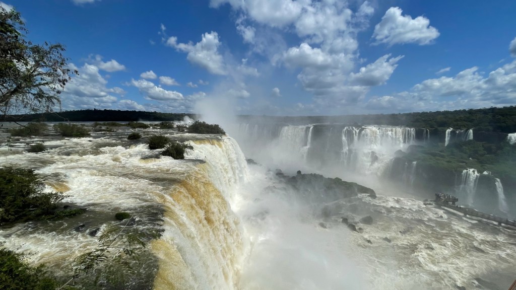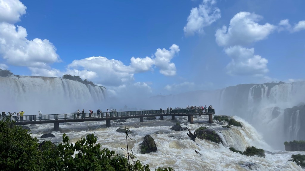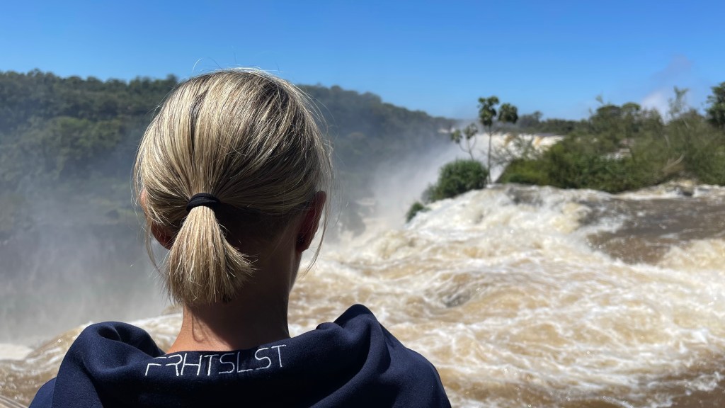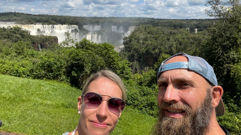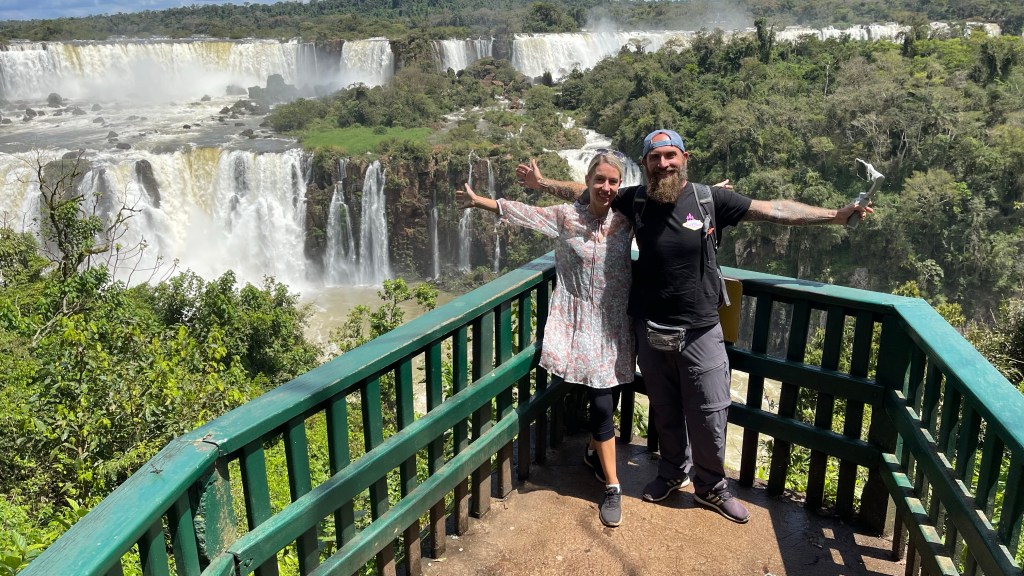 Die Nacht verbrachten wir am Straßenrand in der Nähe vom Staudamm. Von dort aus waren es am nächsten Morgen noch ca. 25 km einmal quer durch die Stadt bis zum „Visitor Center“ des „Iguazu-Wasserfalls“ auf der brasilianischen Seite. Hierbei handelt es sich nicht nur um den größten Wasserfall der Welt, sondern auch um den zweitältesten 1939 gegründeten Nationalpark Brasiliens. Wir stellten unseren Van für 37 Real Parkgebühr (= 8,50 €) auf dem dortigen Besucherparkplatz ab und konnten uns die Tickets für den Nationalpark mit unserer Kreditkarte problemlos selbst an einem der zahlreichen Terminals holen. Die Eintrittskarte kostete pro Person knapp über 20 € und ich kann bereits an der Stelle hier sagen, dass es das Geld allemal wert ist. 👍 An dem Freitag war ziemlich viel los und wir reihten uns in die lange Warteschlange für den Doppeldecker-Bus ein, welcher die Besucher vom „Visitor Center“ bis zum Startpunkt des Wanderweges entlang der Fälle bringt. Wir mussten nicht lange warten bis wir durch die Schleuse hindurch und in den Bus durften. Die Fahrt dauerte nicht lange und bereits beim Aussteigen konnten wir die Wasserfälle donnern und tosen hören. 😲 Sobald man auf den Fußweg einbiegt kann man auch schon den ersten Blick auf die „Iguazu-Fälle“ erhaschen und es war wirklich ein mehr als beeindruckendes Schauspiel, die Wassermassen in die Tiefe stürzen zu sehen. So eine beeindruckende und faszinierende Naturgewalt ist uns bisher noch auf keiner unserer vielen Reisen begegnet. Der Wanderweg zieht sich rund 1.200 Meter vom Start- bis zum Endpunkt immer am Wasser entlang. Die Sicht auf den gleichnamigen Fluss sowie die zahlreichen Wasserfälle und Inseln darin ist wirklich einmalig. Wie toll es wohl erst sein muss, dieses herrliche Naturschauspiel aus der Luft und einem der vielen Helikopter zu bestaunen?! Es gibt ausreichend gute Gelegenheiten um alle paar Meter zum Staunen, Fotografieren und Filmen anzuhalten. Und trotz der Vielzahl an Besuchern kam man sich nicht wirklich in die Quere. Lediglich an einem Aussichts- bzw. Foto-Spot mussten wir mal ein Weilchen warten, bis wir an der Reihe für den perfekten Schuss waren. 😅 Die Sicht geht stets hinüber auf die argentinische Seite der Wasserfälle, wo man noch näher am Wasser dran ist und die Besucher sich dank der angelegten Stege quasi direkt über dem Wasser befinden. Wir haben nun schon von mehreren Leuten gehört, dass die argentinische Seite die noch Schönere sei und wir sind wirklich gespannt, ob der heutige Tag morgen wirklich noch einmal getoppt wird… Am Ende unsers Weges gelangten wir zur „Garganta do Diabo“ (= Teufelsschlund) wo ebenfalls ein Steg zu einer Aussichtsplattform direkt über einem der donnernden Wasserfälle führt. Die Gischt spritzte enorm und ich war, im Gegensatz zu Simon, so schlau mir vorher meinen Regenponcho überzuwerfen. Simon wurde somit ganz schön nass wohingegen es bei mir nur meine Füße traf. 😉 Zum Glück haben sowohl Handy als auch Gimbal die fette Dusche unbeschadet überstanden. 🙈 Von der Plattform aus waren es dann nur wenige Stufen bis nach oben zu Restaurants, Getränkeständen und letztlich dem Bus welcher einen wieder zurück zum Eingang brachte. Wir nutzten noch das dortige WLAN, um online Eintrittskarten für die argentinische Seite der Wasserfälle zu kaufen und das nächste YouTube Video hochzuladen. Übernachtet haben wir diesmal auf einem Hotelparkplatz ganz in der Nähe des Parkeingangs. Wir sind einfach ganz frech durch das offene Steintor gefahren nach dem wir gesehen hatten, dass dort noch zahlreiche Parkplätze frei waren. Wir parkten etwas abseits, verhielten uns so ruhig wie möglich und zu unserem eigenen Erstaunen beschwerte sich niemand und wir konnten bis morgens in Ruhe dort stehen. 😅