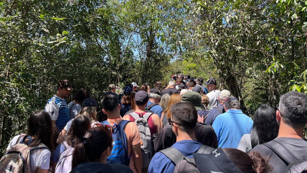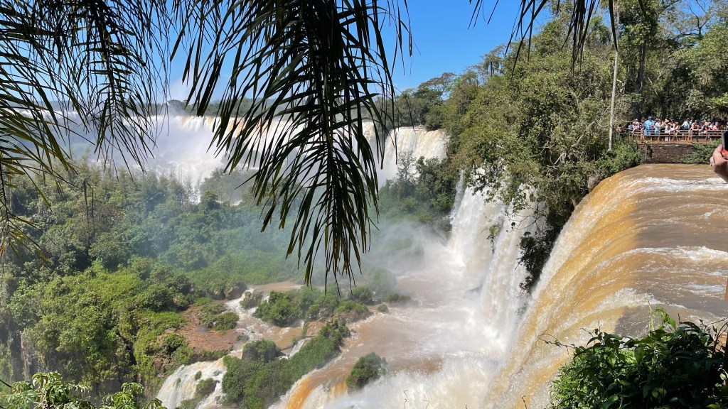 Morgens entfernten wir uns zeitig von dem Hotelgelände, bevor doch noch jemand auf die Idee gekommen wäre Geld von uns zu verlangen. 🙈 Wir fuhren wieder zurück bis zum Nationalparkeingang auf brasilianischer Seite und frühstückten dort erst einmal. Danach stellten wir unseren Van erneut auf dem bewachten, wenn auch nicht ganz günstigen Parkplatz ab. Wir liefen bis zum Einfahrtstor von wo aus auch die Busse zur argentinischen Seite der „Iguazu-Wasserfälle“ abfahren. Da wir nicht wirklich abschätzen konnten, wie lange die Fahrt dauern und wie voll es auf der anderen Seite sein wird nahmen wir direkt den ersten Bus um 09:00 Uhr. Die Entscheidung war auch goldrichtig. Der Bus musste nämlich zwecks kurzen Zollformalitäten (wir mussten lediglich an der argentinischen Seite unsere Pässe vorzeigen mit dem Hinweis, dass wir bereits am Nachmittag wieder ausreisen werden) jeweils auf der brasilianischen als auch auf der argentinischen Seite anhalten. Nach dem dies erledigt war ging die erste Fahrt bis zum Busterminal in „Puerto Iguazu“, dem Pendant in Argentinien zu „Foz do Iguazu“ in Brasilien. Dort mussten wir in einen weiteren Bus umsteigen der uns dann bis zum Eingang des Nationalparks brachte. Alles in allem waren wir fast 1,5 Stunden für immerhin rund 12 € pro Person hin und zurück unterwegs. Und da die gestern online erworbenen Eintrittskarten auf 11:00 Uhr lauteten hätten wir nicht viel später losgehen dürfen. Am Eingang angekommen wurden wir von einer ziemlich großen Menschenmenge in Empfang genommen. Wir hatten uns für unseren Besuch aber auch den denkbar schlechtesten Tag ausgesucht: Am 12. Oktober (kommenden Mittwoch) ist ein Feiertag und die meisten Menschen haben daher wohl ein verlängertes Wochenende. Bei dem herrlichen Wetter am gestrigen und heutigen Tag natürlich DIE Gelegenheit für derartige Ausflüge. 😕 Nur lies die Wettervorhersage für uns auch keine wirkliche Ausweichmöglichkeit. Die kommenden Tage soll es nämlich durchweg wieder gewittrig und regnerisch werden. So schoben wir uns also im Schneckentempo mit all den vielen anderen Besuchern über die schmalen Metallstege, welche auf der argentinischen Seite direkt über den Flusslauf und die Kanten der Wasserfälle führen. Wir bewältigten die beiden Hauptwege (ca. 1.200 und 1.700 Meter lang) entlang der oberen und unteren Fälle. Tatsächlich fanden wir die Draufsicht auf die Wasserfälle gestern von der brasilianischen Seite aus deutlich schöner und vor allem viel imposanter und beeindruckender. Auf der argentinischen Seite blickt man lediglich in die Tiefe und sieht dafür deutlicher den Sog der Strömung bis sich der Fluss zwischen 60 und 80 Meter donnernd in die Tiefe stürzt. Das Wasser war auch ziemlich braun gefärbt. Scheinbar hat dies viel mit der Waldrodung in Brasilien zu tun wodurch der Fluss viel mehr Sedimente mit sich führt als früher, als es noch ein Klarwasserfall war. Möglicherweise lag es aber auch einfach an dem Regen der vergangenen Tage. Viel Wasser gab es auf jeden Fall! Zum „Gargante del Diablo“ schafften wir es leider nicht mehr. Der Rundweg wäre mit 120 Minuten zeitlich für uns nicht mehr machbar gewesen, da wir ja noch rechtzeitig den Bus zurück auf die brasilianische Seite erwischen mussten. Und bei derart vielen Besuchern hätten wir vermutlich auch deutlich länger als angegeben gebraucht. Man hätte wohl auch mit einem Zug fahren können welcher die Besucher zu den einzelnen Stationen im Park bringt. Allerdings war auch dieser derart überfüllt und mit einer Abfahrt im 30 Minuten Rhythmus auch nicht wirklich ideal. Wir gehen jetzt einfach mal davon aus, dass es dort gestern unter statt auf dem Teufelsschlund sowieso viel spektakulärer war und wir somit nichts verpasst haben. 😉 Die Rückfahrt mit dem Bus verlief analog zur Hinfahrt und gleichfalls unkompliziert, so dass wir rechtzeitig am Nachmittag wieder bei unserem Van ankamen. Auch hier war der Parkplatz deutlich voller als am Tag zuvor und sogar die Grünstreifen entlang der Straße waren dicht an dicht zugeparkt. 😮 Wir fuhren wenige Kilometer weiter in Richtung Zentrum und parkten an einem ziemlich großen Laden, in welchem Edelsteine, Souvenirs und handgemachte Schokolade verkauft wurde. Dort sahen wir uns kurz im Laden um wobei wir es eher auf den Parkplatz abgesehen hatten. Dieser war schön groß, beleuchtet und nicht direkt an der Straße weshalb wir ihn ideal für diese Nacht fanden. Da unser Frühstück heute außergewöhnlich früh und das Mittagessen mit drei kleinen Empanadas, welche wir noch dazu teilten, eher klein ausfiel hatten wir entsprechend Kohldampf. Wir kochten noch eine schnelle Pasta mit Kürbis und Sahnesauce bevor wir erschöpft von all den Eindrücken ins Bett fielen.