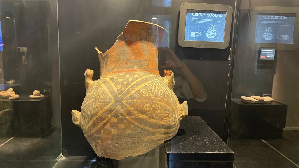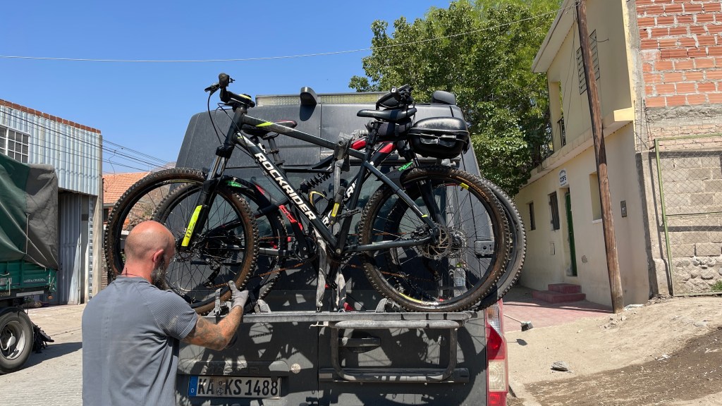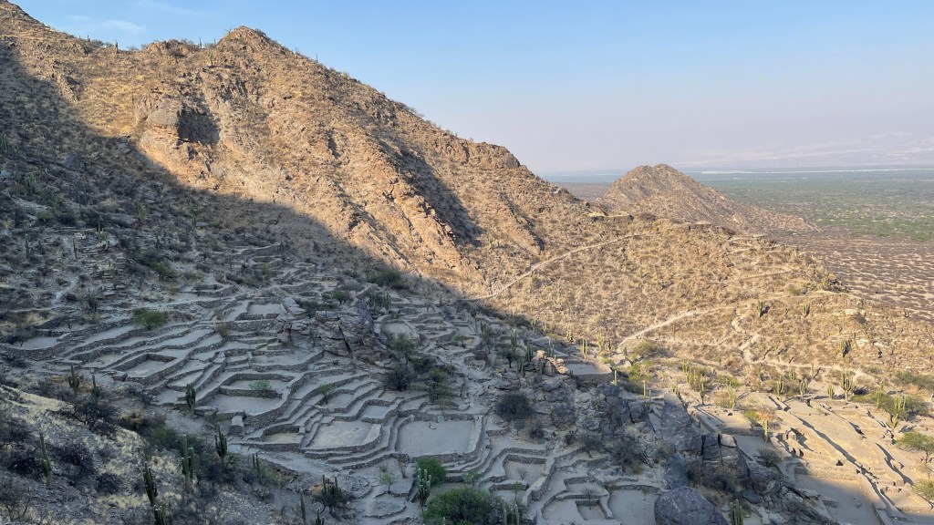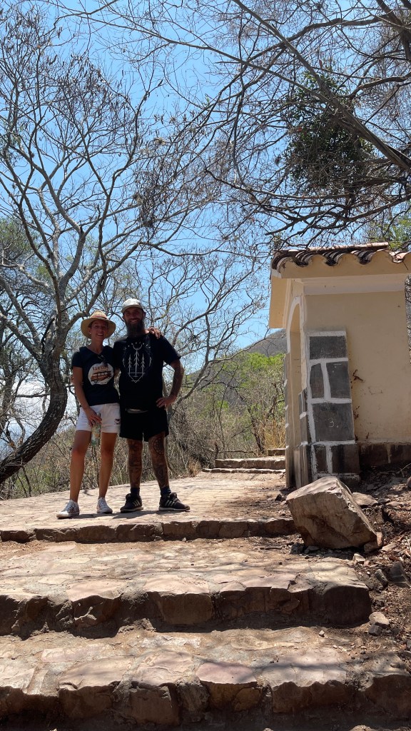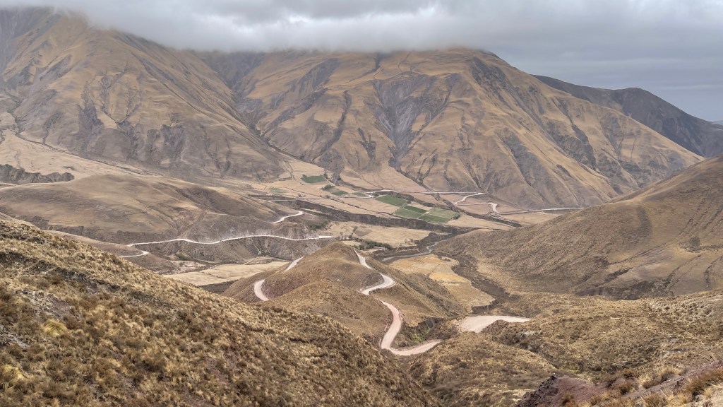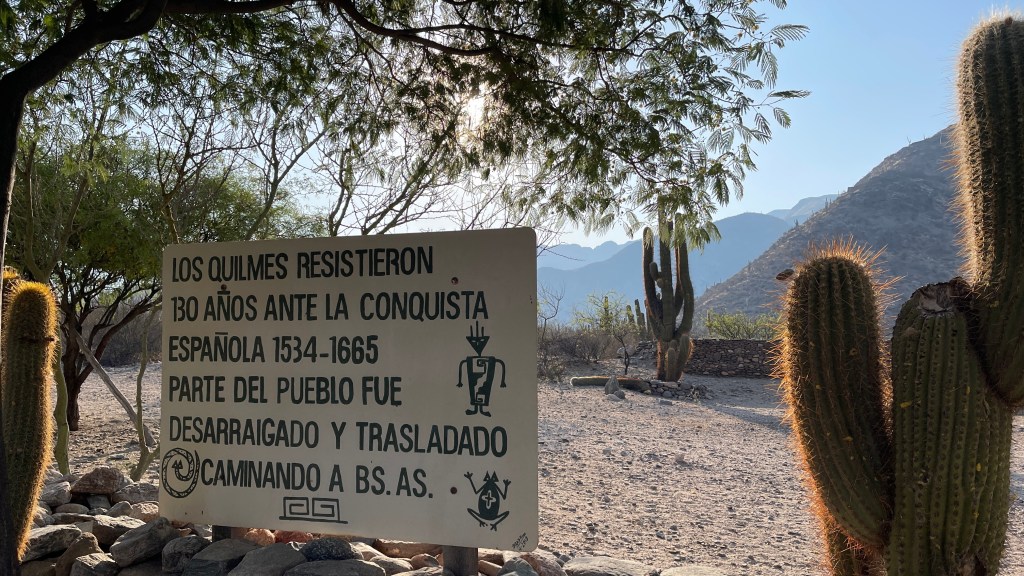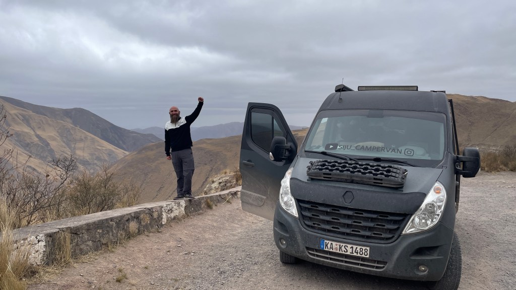 Am kommenden Morgen unterhielten wir uns sehr nett mit einem älteren, argentinischen Pärchen welches ebenfalls mit ihrem nagelneuen, zum Camper ausgebauten Renault Master 3 unterwegs war. Sie hatten gleichfalls an der etwas außerhalb gelegenen Plaza direkt vor uns übernachtet und wollten in dieselbe Richtung weiter fahren wie auch wir. Unser nächster Ziel war „Tafí del Valle“ von wo aus man wohl eine sehr schöne, abschüssige Fahrradtour zu einem See sowie entlang eines Flusses unternehmen kann. Problem war nur, dass unsere Räder durch die vielen Erdstraßen der letzten Tage völlig eingestaubt und verdreckt waren. 🙊 Daher steuerten wir eine Autowäscherei an wobei dies keine automatischen Waschanlagen oder Waschstraßen sind wie wir sie aus Deutschland kennen, sondern hier wird noch alles gründlich von Hand erledigt. Die Erste hatte leider keine Zeit und bei der Zweiten wären wir nicht die steile Auffahrt hinaufgekommen. Aber er machte uns für umgerechnet 1,50 € sofort und ohne zu zögern unsere beiden Fahrräder mit dem Dampfdruckstrahler sauber. Somit sollte der Radtour also nichts mehr im Wege stehen. 👍 Wir kauften bei einem der Marktstände noch etwas Obst und als wir zum Van zurückkamen, welchen wir mittlerweile wieder an der zentralen Plaza geparkt hatten, sahen wir dort bereits einen Polizisten stehen. Auf unsere Frage hin, ob es ein Problem gäbe meinte er, dass es verboten wäre mit Bussen hier zu parken da diese zu groß wären. Wir hatten die Hinweistafel an der Straßeneinfahrt zuvor auch zur Kenntnis genommen aber da wir bereits am Vorabend dort geparkt hatten, wohlgemerkt mit mindestens 10 anderen zum Teil deutlich größeren Campern, sahen wir kein Problem darin hier noch einmal zu parken. Wir erklärten ihm, dass wir nur kurz zum Einkauf auf dem Markt waren und direkt auf dem Sprung wären worauf die Welt für ihn sofort wieder in Ordnung war und er sich sogar bei uns entschuldigte. 😅 An der anderen Tankstelle bekamen wir dann sogar noch Diesel und so konnten wir beruhigt über die Ruta N40 die ca. 50 km bis zu den „Ruinas de los Quilmes“ weiterfahren. Wir zahlten die Eintrittsgebühr (500 Pesos p.P.) und machten auf dem Parkplatz dort erst einmal gemütlich Kaffeepause bzw. bereiteten den Hefeteig für die Pizza am Abend vor. Gegen 17 Uhr, als es nicht mehr so heiß war und der Wind am Nachmittag wie üblich wieder auffrischte, machten wir uns auf zu den Ruinen. Zur einführenden Erklärung konnten wir als Erstes ein gut gemachtes und englisch Untertiteltes Video anschauen welches uns das Volk der „Quilmes“ näherbrachte. Sie kamen ca. 800 n.C. als Nomaden um sich hier niederzulassen. Zu Hoch-Zeiten lebten geschätzt 7k bis 8k Menschen hier. Der restaurierte Teil beträgt lediglich 10% der Gesamtfläche. Die meisten Überreste befinden sich rundum zwischen den großen Säulenkakteen. Auf einem der Hügel konnte man die verbliebenen Reste der Festungsanlage sehen und auf den anderen konnte man hinaufsteigen, um von oben die Ruinen zu betrachten. Die Anlage liegt super schön am Hang da die besser gestellten „Quilmes“ wohl weiter oben lebten als das gewöhnlich Fußvolk. Sie konnten den Incas trotzen, in dem sie mit ihnen Handel trieben und auch die ersten beiden Angriffe der spanischen Invasoren konnten sie abwehren. Beim Dritten im Jahr 1665 hatten sie allerdings keine Chance mehr gegen deren Schusswaffen und so wurden die meisten getötet oder an den „Río de la Plata“ nach „Buenos Aires“ ins Exil verbannt. Nur sehr wenige überlebten oder konnten sich in die umliegenden Berge retten. 😥 Wir überlegten kurz, hier eventuell in der Einöde zu übernachten. Entschieden dann aber letztlich doch, die noch verbleibenden 75 km bis nach „Tafí del Valle“ zu fahren. Es ging erneut entlang kurvenreicher Straßen über grasbewachsene Berge auf denen Nutztiere weideten. Wir kamen erst spät gegen 20 Uhr an unserem Ziel an, wo wir uns nach Übernachtungsgelegenheiten umschauten. Letztlich fanden wir ein ruhiges Plätzchen am zentral gelegenen Busbahnhof.