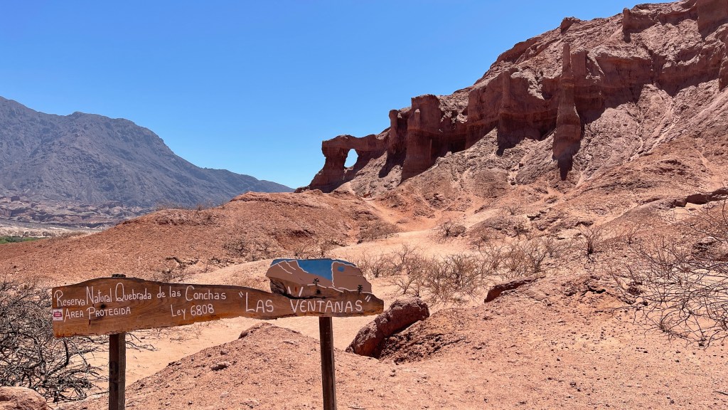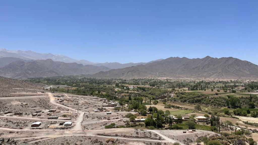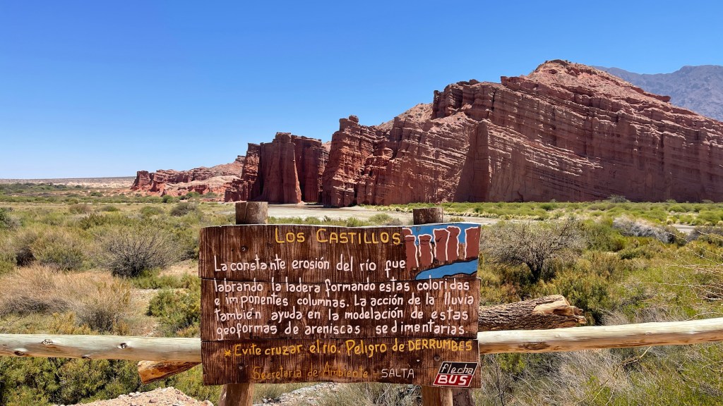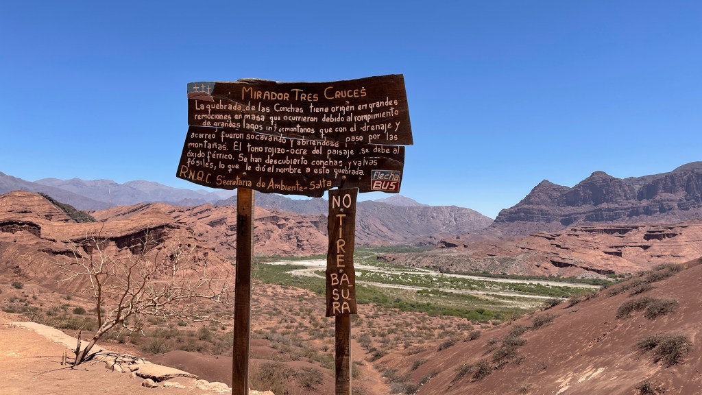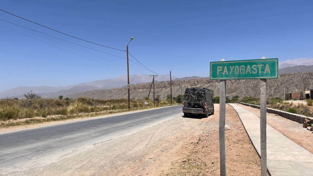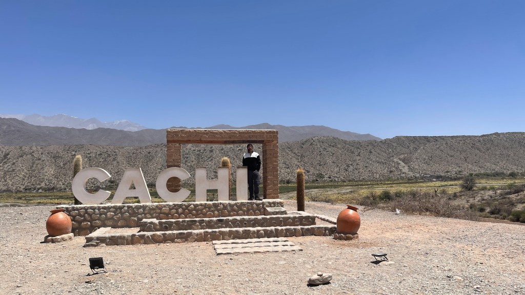 Irgendwie macht uns die Höhenluft und die Fahrerei wohl müde und so schliefen wir am Dienstag doch tatsächlich bis um 9 Uhr (obwohl wir bereits vor 23 Uhr im Bett lagen). Wir ließen den Tag ganz gemächlich angehen und frühstückten noch gemütlich vor Ort. Ich erkundigte mich im Nationalparkzentrum neben uns bei der Rangerin nach den Ausflugsmöglichkeiten aber außer den drei Aussichtspunkten, welche bereits auf unserem gestrigen Wege hierher lagen, gab es wohl nicht viele Ziele. So fuhren wir gegen Mittag in das nahegelegene und als sehr schön angepriesene Städtchen „Cachi“. Der Ortskern wirkte sehr ruhig und etwas verschlafen aber es war alles nett hergerichtet und, wie gewohnt, tadellos in Schuss. Wir liefen durch den Ort auf einen Hügel um vom dortigen „mirador“ aus die Umgebung zu betrachten. Von oben wirkte das Tal wie eine kleine Oase auf uns da es eine grüne Schneise inkl. hübscher Zypressen inmitten des ansonsten steinig kargen Umlandes war. Wieder am Auto angekommen machten wir uns direkt auf die Weiterfahrt über die Buckelpiste da „Cachi“ ansonsten nicht wirklich viel zu bieten hatte. So wie es aussieht bleibt die „Ruta N40“ wohl fast die ganzen 270 km über bis nach „Cafayate“ eine Holperpartie. Aber unser Bussi meisterte die Strecke bisher mit Bravour und bis dato ist (toi toi toi) auch noch nichts aus den Schränken oder Regalen gefallen. So bleibt uns während der langsamen Fahrt auf jeden genug Zeit, um die abwechslungsreiche und wirklich sehr beeindruckende Landschaft um uns herum zu genießen. 🥰