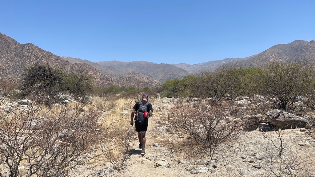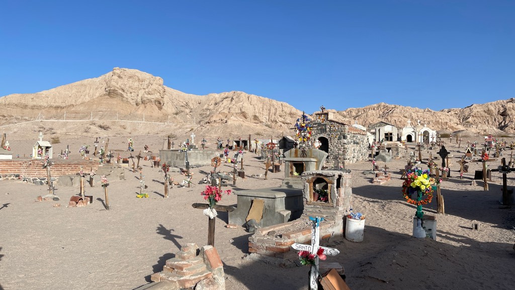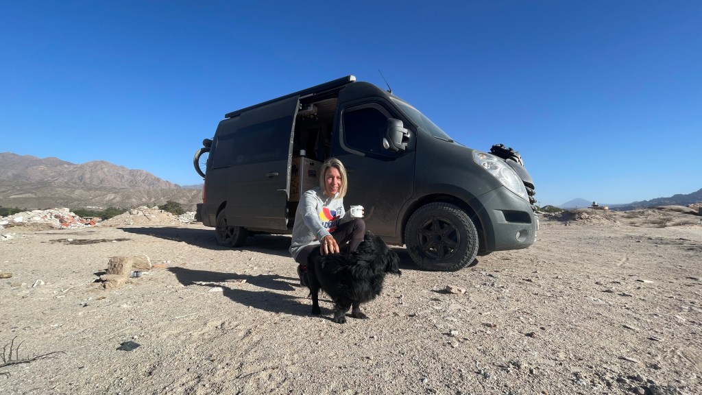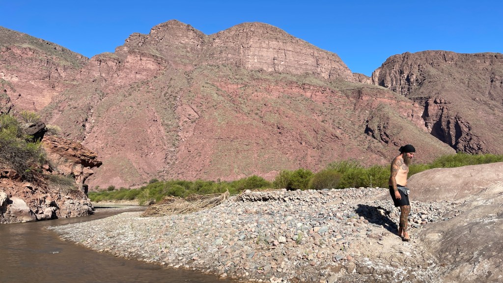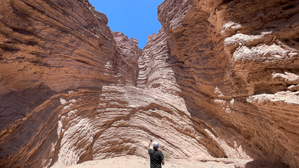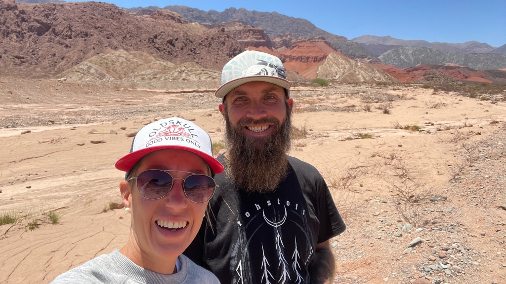 Die Nacht verbrachten wir mal wieder an einem Friedhof (absoluter Geheimtipp da meist etwas abgelegen, ruhig und dennoch nicht völlig ab vom Schuss) mit toller Aussicht auf ein Bergmassiv, welches definitiv auch als Kulisse für die Star-Wars Filme hätte dienen können. Lediglich die „pod-racer“ fehlten. 😅 Bei unserem Erkundungsrundgang am vorherigen Abend durch das kleine Dörfchen lief uns von der Plaza aus eine schwarze, neugierige kleine Hündin bis zum Bus nach. Wir gaben ihr dort noch einen Keks und etwas Wasser zu trinken und sie hat es uns sehr gedankt. Als wir morgens aufwachten saß sie bereits bellend wieder vor unserer Tür und hielt alle anderen Hunde vom Van fern. 🥰 Wir verabschiedeten uns gebührend von ihr und die restliche Strecke bis nach „Cafayate“ brachten wir schneller als gedacht hinter uns. Wahrscheinlich lag das aber auch einfach an der wunderbaren und sehr abwechslungsreichen Landschaft durch die wir fuhren. Zuerst führte uns die Strecke durch einen Canyon aus gezackten Bergen bevor es weiter entlang eines mal wieder ausgetrockneten Flusses hinunter zu grünen Wiesen und schlussendlich sogar Weinbergen ging. Am Fuße der Berge angelangt stoppten wir für ein schnelles Müsli und bogen dann auf ein malerisches Stück der „Ruta N68“ ab welches uns wieder rund 50 km in Richtung „Salta“ führte. Die „Quebrada“ (= Schlucht) ist von herrlich roten Bergen auf beiden Seiten sowie einem sandigen Flussbett, in welchem zur Abwechslung mal sogar noch ein wenig Wasser floss, gesäumt. Und wirklich alle paar hundert Meter entlang der Strecke gibt es lohnenswerte Aussichtspunkte mit so klangvollen Namen wie „El Anfiteatro“ (eine zylinderförmige Einkerbung im Fels) oder „La Yesera“ (ein Rundweg mit Blick auf bunte Berge). Wir stoppten auf unserem Weg nach oben an all den Naturschönheiten und blieben letztlich auf dem Parkplatz am letzten Aussichtspunkt, der „Garganta del Diablo“ stehen. Nach dem wir uns den „Teufelsrachen“ im Fels angeschaut hatten machten wir eine ausgiebige Pause und zauberten sowohl leckere Blueberry-Pancakes zum Direktverzehr als auch noch einen Mais-Kuchen als Snack für die kommenden vier Nachmittage. 😋 Frisch gestärkt und ausgeruht hatte Simon am späten Nachmittag noch die glorreiche Idee durch das seichte, sandige Flussbett entlang des Canyons zu waten. Schade, dass der Fluss so wenig Wasser führt! Hier hätte man auch ganz entspannt mit dem Kanu immer flussabwärts paddeln können und dabei eine grandiose Aussicht gehabt. An diesem Tag übernachteten wir auch auf dem besagten Parkplatz an dem abends absolut nichts mehr los war.