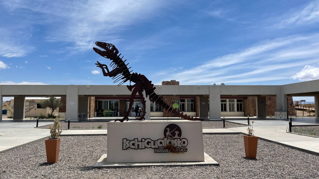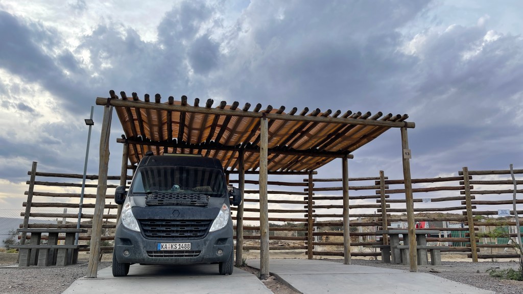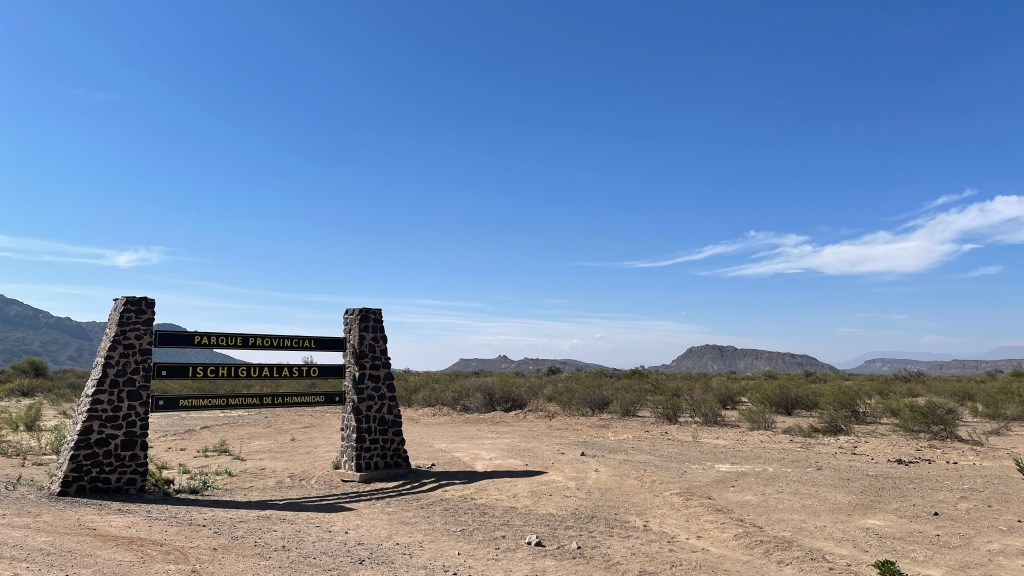 Entsprechend lange schliefen wir am Montagmorgen, bevor wir nach der Nutzung des Internets an der Tankstelle zu einem größeren Supermarkt fuhren um einige Lebensmittel für die kommenden Tage zu kaufen. Da wir demnächst in die Weinbauregion „Mendoza“ fahren werden und diese aktuell noch frei von Fruchtfliegen ist, darf kein Obst oder Gemüse mitgebracht werden. Dies wird wohl auch streng kontrolliert und so achteten wir darauf, nicht zu viel davon zu kaufen. Danach ging es weiter bis in den abgelegenen Nationalpark „Ischigualasto“. Die Asphaltstraße führte meist wieder kerzengeradeaus und so bewältigten wir die Strecke von ca. 150 km in relativ kurzer Zeit. Auf unserer rechten Seite erstreckten sich die ganze Fahrt über grüne Berghänge, zu deren Fuße Gräser und Büsche wuchsen und ab und an kreuzte eine Herde Ziegen unseren Weg. Auch größere Oliven-Haine gab es immer wieder und ich konnte für unglaubliche 2 € 500 ml Olivenöl bester Qualität erstehen. 🤩 Am Eingang des Nationalparks angekommen blies uns auf 1.500 Meter Höhe ein kräftiger Wind ins Gesicht. Die Vollmondtour hätte man wohl schon vorab online reservieren müssen so dass wir hierfür keine Tickets mehr erhielten. Für die letzte Nachmittagstour um 17 Uhr waren wir zu knapp dran und campen war auf dem Besucherparkplatz nicht gestattet. Dafür gab es nach der Einfahrtsschranke einen relativ neu angelegten Camping-Bereich so dass wir die 3 € für die Übernachtung gerne investierten. Duschen (allerdings nur von 20 bis 8 Uhr), Toiletten und Stromanschluss waren inklusive, die Stellplätze überdacht und neben jedem befanden sich Tische und Bänke aus Stein. 👍 Gegen später erhielten wir noch Gesellschaft von brasilianischen Overlandern (alias „Adiantes“) welche sehr gut Englisch sprachen und bereits seit vielen Monaten unterwegs waren. Wir unterhielten uns sehr nett und tauschten uns über Routen sowie Erfahrungen aus. Entsprechend spät aßen wir zu Abend und gingen danach direkt ins Bett da sich der Schlafmangel vom Vortag dann doch bemerkbar machte. 🥱