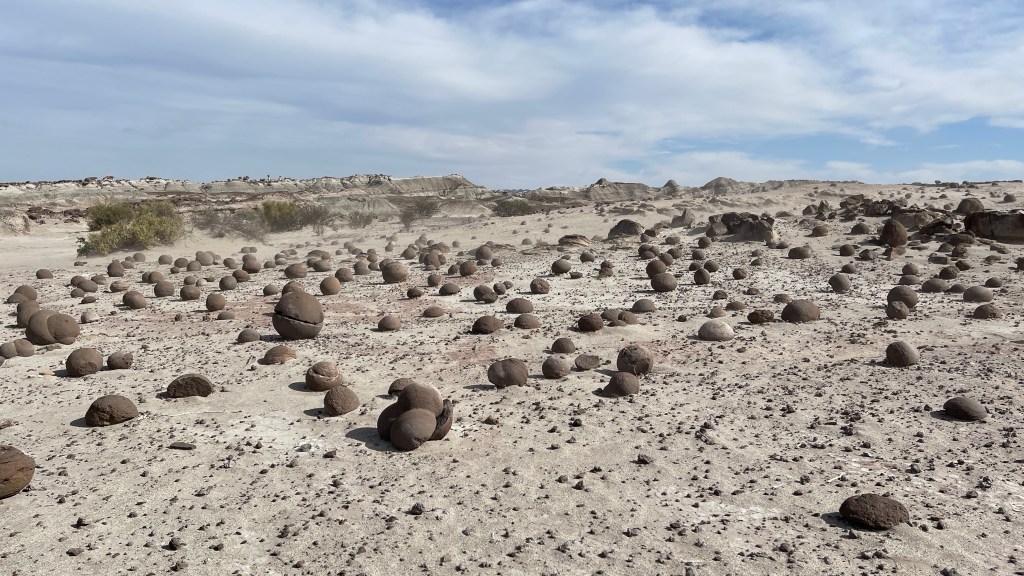 Nachts frischte der Wind wieder merklich auf und wir waren froh darüber, in unserem tollen Van zu reisen und nicht im Dach-Zelt wie die beiden Brasilianer in ihrem Defender oder gar nur im Iglu-Zelt wie die Motoradfahrer um uns herum schlafen zu müssen. Die wurden bestimmt alle ziemlich durchgepustet und schliefen sicherlich nicht so gut wie wir. Am Vormittag legte sich der Wind und wir konnten draußen auf dem Bänkchen in der Sonne frühstücken. 😎 Die meisten Argentinier kennen ihr Land übrigens hervorragend wie wir während der zahlreichen Unterhaltungen festgestellt haben. Egal, ob wir erzählen woher wir gerade kommen oder wohin wir unterwegs sind: Alle kannten die besagten Gegenden und hatten etwas dazu zu erzählen. 🥰 Wahrscheinlich deshalb, weil reisen außerhalb des eigenen Landes einfach viel zu teuer ist. Vermutlich sind deswegen auch so viele einfach nur mit Auto und Zelt oder eben im Camper unterwegs. Wir kauften uns Tickets (2.500 Pesos = 8 € p.P.) für die Tour um 16 Uhr nachmittags um schönes weiches Licht zum Fotografieren zu haben. Die Selbstfahrertour führt in einem Rundkurs von ca. 40 km durch den „Parque Provinicial Ischigualasto“ welcher auf Grund der Steinformationen auch „Valle de la Luna“ (= Mondtal) genannt wird. Da die Dauer der Tour mit dreieinhalb Stunden angegeben war bereitete ich uns bereits nachmittags den Cous-Cous Salat für abends vor. Wir erwischten eine ziemlich große Tour mit rund 30 Fahrzeugen. Vielleicht deshalb starteten sie bereits einige Minuten vor 16 Uhr und wir mussten uns Mühe geben um die Kolonne noch einzuholen. Die Route enthielt insgesamt fünf Stopps an außergewöhnlichen, geologischen Formationen. Bei allen Aussichtspunkten befand sich eine Plattform und unsere Führerin erklärte jeweils in einigen Sätzen die Besonderheiten der Gegend. Hier herrscht ein trockenes Wüstenklima mit heißen Tagen, kühlen Nächten und kräftigen Winden. Letztere tragen zur Bildung der kuriosen Steinformationen bei und auch das Wasser der Flüsse, welche heutzutage aber nur noch sehr selten und wenn dann auch nur ganz kurz wenig Wasser führen. Die aufeinanderliegenden Steinplatten der Berge werden durch die Erosion Stück für Stück abgetragen oder stürzen mit der Zeit einfach ineinander zusammen. So konnten hier in den letzten 100 Jahren sehr viele Fossilen, darunter auch Dinosaurierknochen, geborgen werden. Einige Kopien der Ausgrabungsstücke konnten wir bereits zuvor im kleinen Museum des Nationalparks betrachten. Auf dem Weg schauten wir uns das namensgebende Kratertal, eine Steinstatue ähnlich der ägyptischen „Sphinx“, ein Feld mit unzähligen kugelrundgeschliffenen Steinen welches passenderweise „Bochia Feld“ hieß sowie eine einem U-Boot bzw. einem Pilz ähnelnde Formation an. Auch die steil aufragenden, rotglühenden Berge des angrenzenden „Tampalaya Nationalparks“ waren gut zu erkennen. Als wir gegen 19:30 Uhr unseren Van wieder auf dem Campground parkten waren wir froh nicht mehr kochen zu müssen und machten uns direkt über unseren Salat her. 😅 Simon sprang noch unter die schöne heiße Dusche tja und dann, begann leider das Drama der kommenden Tage…