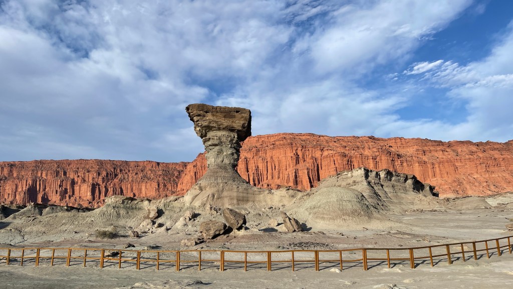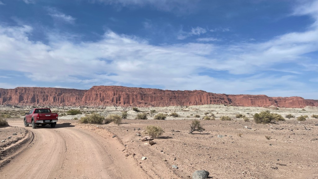Am Samstag ging es Simon endlich besser und er fühlte sich wieder fahrtüchtig so dass wir nach vier Tagen und fünf Nächten unseren Stellplatz im Nationalpark „Ischigualasto“ verlassen konnten. Wobei mir die Pause schlussendlich doch auch ganz gutgetan hat. 😉 Wir fuhren ein Stück über die RN150 bevor wir wieder auf die legendäre, diesmal aber gut asphaltierte RN40 abbogen. Wir kurvten, sprichwörtlich, noch eine Zeit lang durch die herrlichen Canyons des Nationalparks bevor es urplötzlich wieder flach wurde. Die Strecke führte uns in Summe ca. 270 km bis nach „San Juan“ wo wir am frühen Mittag ankamen. Wir fanden einen guten, zentral gelegenen Parkplatz am Straßenrand in der Nähe des Parks und der dort anwesende Polizist meinte es wäre überhaupt kein Problem hier zu parken. 👍 Wir schlenderten durch den sehr weitläufigen, schön angelegten Park inklusive großem See mit zahlreichen (Koi-) Karpfen, Springbrunnen, schattigen großen Bäumen und viel Rasenfläche. Auch das moderne Theater und die Stadt insgesamt muteten sehr ordentlich und teilweise neu gestaltet an. Allerdings schaffen wir es momentan immer, ausgerechnet an Wochenenden nach Ladenschluss in den Städten zu sein und so hatten auch hier alle Geschäfte in der Fußgängerzone bereits geschlossen. 🤷♀️ Entsprechend wenig war los aber uns fiel dann doch noch ein Restaurant ins Auge, welches im krassen Gegensatz dazu gerammelt voll war. Wir sahen uns im Inneren um und die dort aufgetischten Portionen waren unglaublich groß. 😮 Simon bestellte sich, unvernünftiger Weise meiner Meinung nach mit seinem geschundenen Magen, eine Pizza Mozzarella und ich konnte das erste Mal während unserer Reise ein „Lomito“ Sandwich bestellen. Dieses war wirklich exzellent: Super kross und das hauchdünne Steak war perfekt gewürzt und zum Glück sehr zart. Inklusive einer 1,5 L Flasche Softdrink kostete uns der Spaß gerade einmal knapp 7 €. Wir liefen zurück zum Auto, chillten dort noch eine Weile auf dem Rasen davor und ich konnte nicht umhin einem netten Argentinier noch ein saftiges, riesengroßes Bananenbrot für schlappe 1,70 € abzukaufen der dort diverse leckere Kastenkuchen feilbot. Für die Nacht steuerten wir einen etwas außerhalb gelegenen Stellplatz an. Wir durchquerten noch ein gutes Stück der Stadt und was wir hier sahen gefiel uns erneut richtig gut. Alles war sehr schön angelegt und es gab jede Menge netter Cafés und Restaurants. Unser Schlafplatz lag etwas abseits der Straße, unweit eines ebenfalls hübsch hergerichteten „Poeten“ Parks in einem kleinen Wäldchen. In der Nähe gab es sogar diverse Sitzgelegenheiten und Grillplätze und wir wunderten uns einmal mehr über unser eigenes Land. In Deutschland scheint es schlicht weg unmöglich, dass solche Plätze (wohlgemerkt von der eigenen Bevölkerung) sauber und in Schuss gehalten werden. In allen Ländern, in denen wir bis dato waren sind sowohl Parks, Strände, Seen als auch öffentliche Toiletten, Spiel- oder Trainingsplätze tipp topp in Ordnung. Nirgends ist etwas kaputt oder liegt Müll herum wobei man auch sagen muss, dass hier immer überall genügend Mülleimer zur Verfügung stehen welche auch stets regelmäßig geleert werden. Also das totale Gegenteil von dem, was man sich vielleicht aus der Ferne unter Südamerika vorstellen mag. Wobei uns dies z.B. auch schon in Dänemark, oder Neuseeland u.a., extrem aufgefallen war. Obwohl wir Deutschen uns, zumindest nach außen hin, Klima- und Umweltschutz so groß auf die Fahne schreiben. Irgendwie passt das nicht so ganz zusammen, finde ich. 🤨 Die Nacht war leider sehr unruhig da Simon ungelogen neun oder zehnmal auf die Toilette musste. Gegen 3 Uhr klopfte dann auch noch die Polizei an unser Auto und riss uns aus dem, sowieso schon unruhigen, Schlaf. Mein Puls war sofort auf 180 aber sie wollten sich nur ganz nett erkundigen, ob denn alles in Ordnung sei. Sie hatten unser Auto mit den Fahrrädern hinten drauf von der Straße aus abseitsstehen sehen und wollten nur sicher gehen, dass nichts passiert ist. Also eigentlich total nett, wenn auch im ersten Moment erschreckend. Sie entschuldigten sich dann auch sofort für die Störung und wünschten uns noch eine gute Nacht. ❤ Wobei wir bis dato wirklich durchweg nur sehr, sehr gute Erfahrungen auf der gesamten Reise mit den Polizeibehörden gemacht haben. Alle waren immer sehr freundlich, hilfsbereit und neugierig.