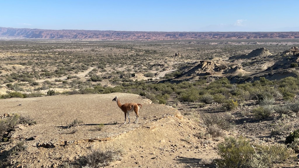 Bereits in der Nacht von Dienstag auf Mittwoch musste Simon nachts mehrmals auf die, glücklicherweise hier vorhandene, Toilette. Außerdem klagte er über starke Bauchkrämpfe. 😰 Beides besserte sich auch tagsüber leider nicht sondern wurde eher noch schlimmer. Mir ging es zum Glück gut, ich verspürte lediglich ab und an mal ein leichtes Ziehen im Magen. Möglicherweise ist der Weichkäse der Übeltäter, welcher sich am Vorabend unter anderem in unserem Cous-Cous Salat befand. Wobei er sowohl optisch als auch geschmacklich und vom Geruch her einwandfrei zu sein schien. 🤷♀️ So verbrachte Simon die kommenden Tage im Bett und pendelte regelmäßig zur leider doch recht weit entfernten Toilette. Glück im Unglück: Seit unserer nun schon über 100 Tagen andauernden Reise standen wir exakt zum zweiten Mal, und eigentlich ja auch nur gezwungener Maßen, auf einem richtigen Campingplatz. Und auch die Temperaturen waren mit rund 25 °C tagsüber, dem stetig vorhandenen Wind sowie den kühlen Nächten erträglich. Das Krankenlager hätte also deutlich schlechter aussehen können und vermutlich wird uns dieses Schicksal noch das ein oder andere Mal während unserer Reise ereilen. 🙈 Ich durfte mich während dieser Zeit meinem größten Feind stellen – mir selbst! Wenn ich irgendetwas wirklich schlecht kann dann ist es nichts tun bzw. Zeit totschlagen. 🙄 Von daher war die erzwungene Auszeit auch für mich ein gutes Training und bot Zeit zum Durchschnaufen. Ich konnte morgens mal wieder Yoga machen, die restliche Argentinien-Route planen sowie die Sehenswürdigkeiten auf „maps.me“ taggen, Blog schreiben und abends ein bisschen spazieren gehen. Es gab immer mal wieder eine Herde grasender „Guanacos“ zu sehen sowie kleine Nagetiere, die wie eine Mischung aus Hamster und Ratte aussehen und „Maras“ die anmuten, als hätte sich ein australisches „Wallaby“ mit einem Feldhasen gepaart. 😅 Da wir uns im Nationalpark fern jeglicher Zivilisation befanden gab es hier ansonsten nichts weiter zu tun oder gar zu sehen. Das angegliederte Restaurant sah auch eher schlecht als recht aus, wenngleich es zwangsläufig von den Touristen mangels Alternativen gut besucht wurde. Wie gut, dass wir in „La Rioja“ noch einmal unsere Lebensmittelvorräte aufgefüllt hatten. 😉 Leider funktionierte auch das WLAN mehr schlecht als recht so dass an YouTube Downloads oder gar Serien schauen nicht zu denken war.