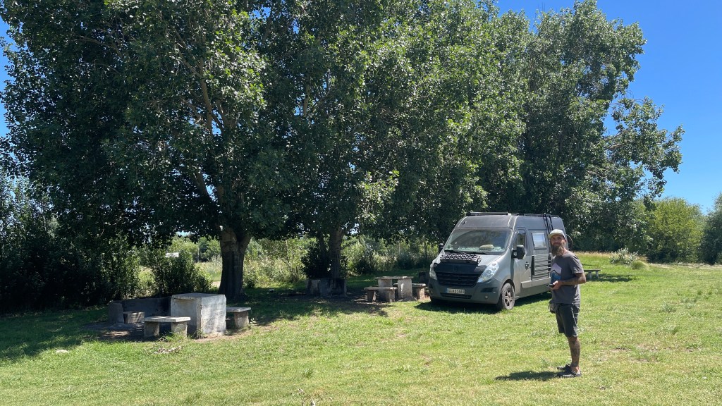 Entsprechend gut haben wir in dieser Nacht gemurmelt. Morgens machten wir uns zu Fuß auf in den Ortskern um den örtlichen Handwerksladen aufzusuchen. Das von uns gesuchte Silikon der Firma „Würth“ war dort erwartungsgemäß nicht zu finden und die anderen dort angebotenen sagten uns nicht wirklich zu. Zumal es auch gar nicht einfach war, über solche Dinge in einer fremden Sprache zu sprechen. Ich hätte die benötigten Begriffe auch nicht auf Englisch gewusst aber dank ausführlichen Beschreibungen meinerseits und dem Einsatz von Händen und Füßen ging es dann doch irgendwie. 😅 Auf dem Rückweg nahmen wir uns bei einer Bäckerei noch ein Croissant sowie ein Stück Karotten-Kuchen für den Kaffee am Nachmittag mit. Zurück am Van frühstückten wir erst einmal unser Müsli mit Obst bevor Simon sich tatsächlich noch kurz ins kühle Flusswasser wagte. Gegenüber hatte es sich eine argentinische Familie mit zwei Kindern im Zelt gemütlich gemacht und die beiden hätten uns sogar abends zum gemeinsamen Grillen eingeladen. 🥰 In Deutschland absolut unvorstellbar! Wir mussten die freundliche Einladung jedoch ablehnen da wir unbedingt noch weiter in die unweit gelegene Großstadt „Bahia Blanca“ fahren wollten. Wir m achten uns gegen Mittag auf den Weg dorthin und die Landschaft entlang der Route ähnelte ein wenig der Toskana. Es gab viele Kornfelder, einige Zypressen und zum ersten Mal sahen wir viele Windräder zur Stromerzeugung. In „Bahia Blanca“ angekommen klapperten wir einige Handwerkergeschäfte ab (ähnlich unserem „Emil Kunz“ zu Hause) bis wir beim dritten fündig wurden. Man bediente uns sehr freundlich und geduldig und letztlich bekamen wir alles, was wir brauchten: Vier Kartuschen Silikon, die dafür benötigte Spritze, Schmiergel-Papier und eine Dose mattschwarzen Lack. Als nächstes stoppten wir im Supermarkt, da wir unsere Lebensmittelvorräte nach den Tagen bei Claudia und Orlando bzw. in der Großstadt dringend wieder auffüllen mussten. Irrwitziger Weise war an diesen auch an Baumarkt (ähnlich unserem „Bauhaus“) angegliedert. 🙈Aber dort hätte man uns sicher nicht so gut beraten können und wir kauften dort noch eine Rolle Klebeband sowie eine Flasche Reinigungsbenzin. 👍 Die Kaffeepause fand auf dem Supermarktparkplatz statt da wir entschieden hatten heute noch aus der Stadt heraus in Richtung Küste zu fahren. Entlang des Weges sah es fast ein wenig so aus wie in Dänemark. Es gab viele sanfte, mit Gras bewachsene Hügel und auch hier stand immer mal wieder das ein oder andere Windrad. Unerwarteter Weise mussten wir neuerdings einen „Fruit and Meat Checkpoint“ passieren. Und das wo wir doch gerade erst eingekauft hatten! 😰 So blieb mir nichts anderes übrig als zu einer Notlüge zu greifen und glücklicherweise ließ man uns ohne weitere Inspektion von dannen ziehen. Nach etwa 200 km Fahrt erreichten wir eine große „Shell“ Tankstelle an welcher wir dann auch die Nacht verbrachten. Außerdem hofften wir, dort am kommenden Tag eventuell ein geeignetes Schattenplätzchen zu finden um unsere Dachluke an Ort und Stelle reparieren zu können.