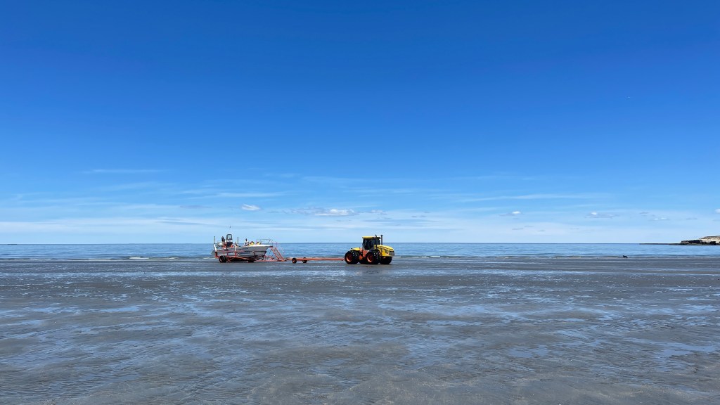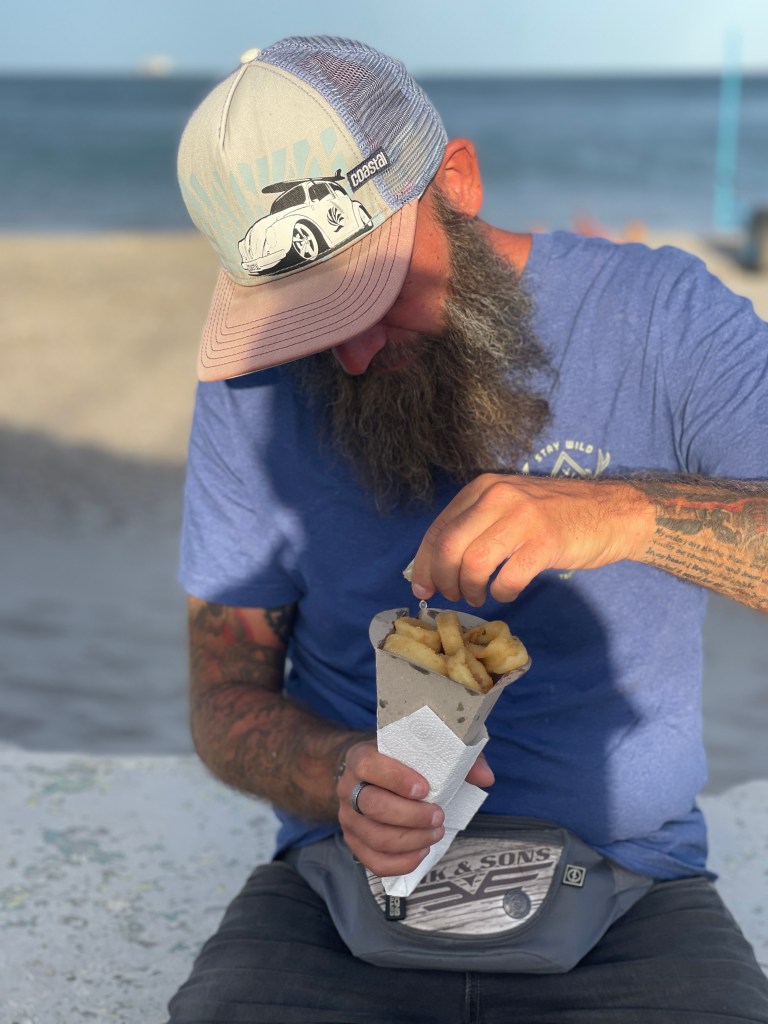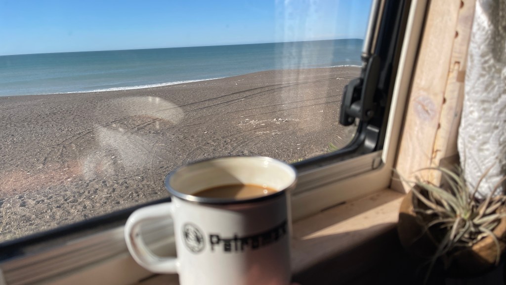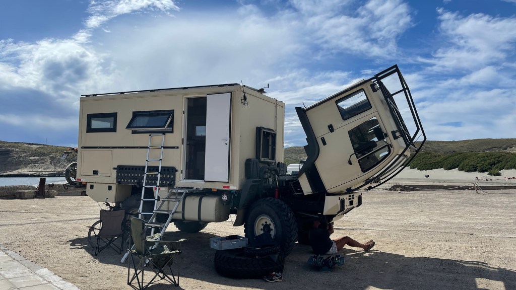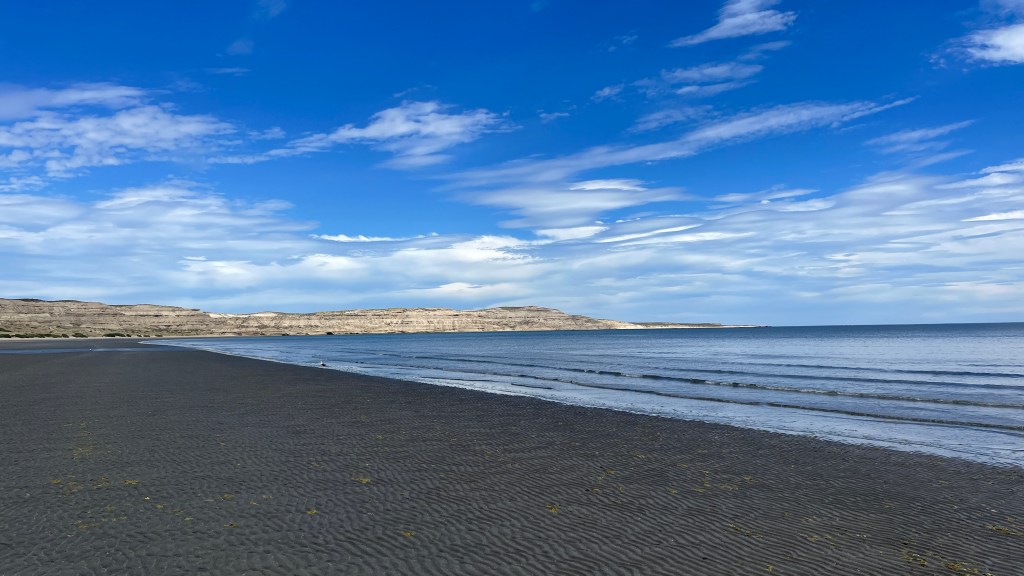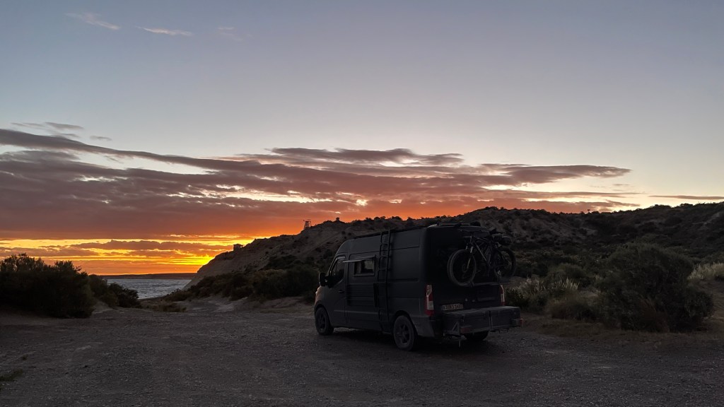Da wir am Vortag unwahrscheinliches Glück hatten und innerhalb eines Tages alle nennenswerten Tiere sehen konnten entschieden wir, nicht erneut die lange Schotterpiste bis zum Inselende zu fahren. Hauptsächlich um unseren Van die Strapazen durch das Gerüttel und Geschüttel zu ersparen. Auch die 50 € pro Person für die eineinhalbstündige Bootsfahrt, bei welcher eventuell die Chance bestehen könnte weiter draußen auf dem Ozean doch noch südliche Glattwale zu sehen, investierten wir nicht. Zum einen weiß man nicht ob man wirklich welche zu Gesicht bekommt, zum anderen war meine letzte Wale-Watch Erfahrung auf einem Schiff in Neuseeland weniger schön. 🤮 Außerdem war das gestrige Erlebnis mit den Orca-Walen für uns einfach nicht mehr zu toppen. So verbrachten wir den Tag auf dem großen Parkplatz zwischen den beiden Stränden in „Puerto Pirámides“ und versuchten, den verständlicherweise deprimierten Udo mental wieder etwas aufzubauen. Simon schaute mit ihm gemeinsam unter das gekippte Führerhaus in den Motorraum aber auch mit vier Augen konnten sie keine Fehlerursache ausmachen. Ich spazierte derweil während herrschender Ebbe ganz einsam am langen Sandstrand entlang und schaute den Wellen zu welche ganz sanft an Land schwappten. Zurück am Van kochte ich für uns drei Kaffee und wir teilten die vier verbliebenen Pancakes vom Vortag auf und aßen noch einen Rosinen-Scone dazu. Eine größere Freude hätte ich Udo zu dem Zeitpunkt wohl nicht bereiten können. 😄 Wir saßen auf einer Parkbank am Meer, genossen die Kaffeepause und unterhielten uns angeregt als das Schweizer Paar Tina und Felix mit ihrem Hund zu uns stießen. Die beiden erzählten uns, dass sie seit kurzem ihre durch Corona unterbrochene Amerika Reise fortsetzen. Sie kamen damals immerhin von Kanada bis nach Ecuador, als dort die Pandemie auch über sie hereinbrach und sie dazu zwang vorerst in ihre Heimat zurückzukehren. Es war wirklich schön und tat gut, sich mit verschiedenen Leuten mal wieder auf Deutsch zu unterhalten. 🥰 Auch abends, als Simon gerade am neuen Video bastelte und ich gerade im Begriff war das Abendessen vorzubereiten, kamen alle noch einmal an unserem Van vorbei. Wie schon viele andere zuvor bestaunten sie unseren schönen Ausbau und ich unterhielt mich noch eine ganze Zeit lang mit Tina über ihre Reiseerfahrungen. Kurz darauf kehrten unsere Lieblingsfranzosen von ihrem Tagesausflug zurück und leider blieben den vieren die Wale verwehrt. So kam es, dass wir an diesem Tag mal wieder erst gegen 22 Uhr unser Abendessen zu uns nahmen. 😅 Es gab leckeres Champignon-Risotto und nach dem späten Mahl ging es auf direktem Wege ins bequeme Bettchen.