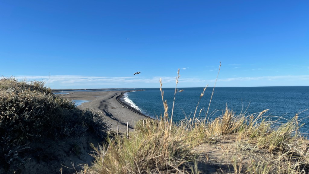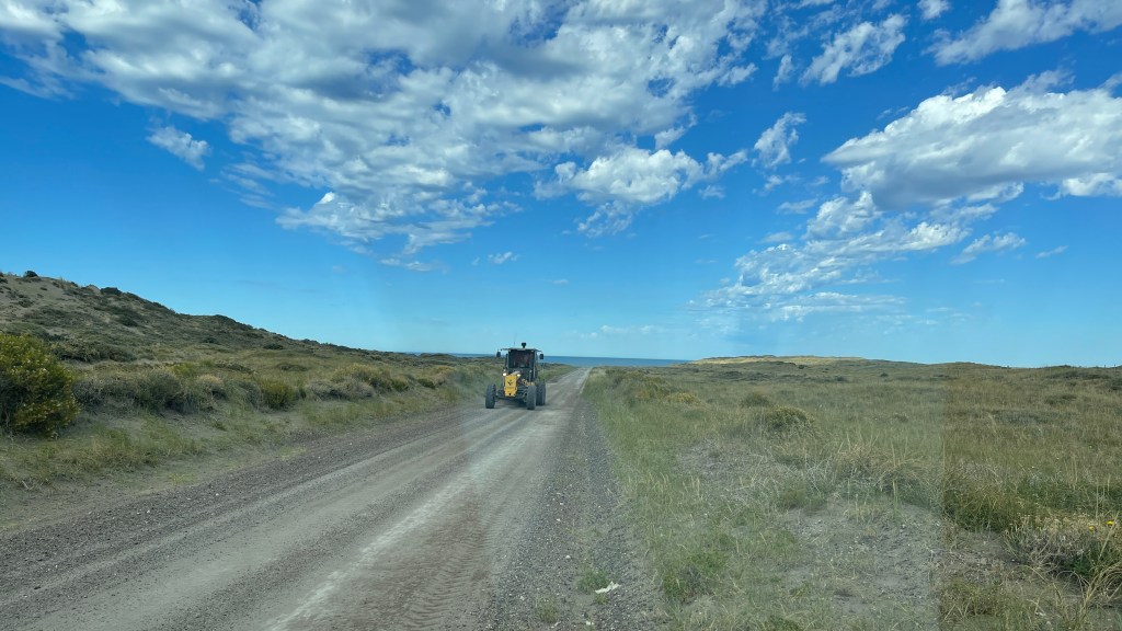 Nach einer sehr ruhigen Nacht, trotz stärkeren Winden vom Meer her, genossen wir während unseres Morgenkaffees noch einmal die wunderschöne Aussicht aufs Meer hinaus. Und als ob das nicht schon herrlich genug gewesen wäre entdeckte ich zu meiner großen Freude kurz darauf auch noch zwei Delfine, direkt vor unserer Nase! 😃 Die Tümmler verweilten viele Minuten in dem seichten Wasser ganz in der Nähe unseres Vans und so konnten wir sie eine ganze Zeit lang beim Schwimmen beobachten. Besser kann ein Tag doch gar nicht starten, oder?! Schweren Herzens rissen wir uns dann aber doch irgendwann los um weiter in Richtung der „Península Valdes“ zu fahren. Wir folgten der Schotterpiste noch viele Kilometer, immer entlang der Küste. ❤ Nach einer Weile kam uns sogar ein „Sandschieber“ (ähnlich eines Schneeschiebers) auf der einsamen Straße entgegen welcher die lange „Sandwurst“ in der Mitte der Straße wieder glättete. 👍 Entlang unseres Weges konnten wir einige kleinere Landschildkröten, ein Guanaco sowie seit langem auch mal wieder Emus sehen. Irgendwann stießen wir dann nach den Sanddünen wieder auf die asphaltierte Ruta N3 die uns an diesem Tage auch noch bis zu unserem Ziel, der Halbinsel Valdes, führte. Während der Fahrt stoppten wir noch an einer Tankstelle in der Hoffnung dort eventuell duschen zu können. Allerdings war die Dusche hier den LKW-Fahrern vorbehalten und an der Tankstelle gegenüber war der Wasserdruck zum Duschen zu schwach. 🤷♀️ Also füllten wir an Ort und Stelle noch einmal unseren Wassertank auf da uns einige Kilometer zuvor aufgefallen war, dass unser Ablassventil sich vermutlich durch das Geruckel auf der Schotterpiste von alleine geöffnet hatte. 😮 Da wir nicht wussten, wieviel Wasser dadurch unserem Tank entwichen war füllten wir ihn lieber noch einmal auf um abends dann unsere Dusche im Van nutzen zu können. Direkt hinter der Tankstelle lag praktischerweise auch noch ein großer Supermarkt wo wir für die kommenden Tage noch ein paar Kleinigkeiten einkauften. Diesen hatten auch die netten argentinischen Reisenden aus „Buenos Aires“ genutzt, welche seit mehreren Tagen an der Tankstelle festsaßen und dort auf die Lieferung des neuen Getriebes für ihren ebenfalls selbst ausgebauten Camper warteten. Da wollen wir uns mit unserer Dachluke doch mal gar nicht weiter beschweren… 🙈 Unsere an den Klappboxen am Heckträger montierte Rückfahrkamera hatte, vermutlich durch die Buckelpiste, ebenfalls leichten Schaden genommen und war aus der Kunststoffhalterung herausgebrochen. Kann bei der billigen China-Ware schon mal passieren aber dieses kleine Malheur konnten wir umgehend mit Panzertape und Kabelbindern beheben. 👍 Am frühen Abend steuerten wir dann unseren heutigen Stellplatz für die Nacht am Anfang der „Península Valdes“ an. Wir übernachteten, erneut einsam und alleine, an einem der vielen „Miradore“. An dem von uns ausgewählten befand sich sogar ein größeres, von zwei Rangern besetztes Haus mit Lookout und mehreren Tafeln zu den hier vorbeiziehenden Walen. Auf unsere Nachfrage hin teilte uns die hilfsbereite Rangerin allerdings mit, dass diese hauptsächlich von Juli bis September in Küstennähe vorbeiziehen. Dann kann man die Tiere wohl tatsächlich vom Strand aus beobachten. Zur jetzigen Zeit sei dies aber nur noch weiter draußen auf dem Meer, also mit Booten, möglich. Sie sagte uns jedoch, dass man am anderen Ende der Insel momentan wohl ganz gut „Orkas“ sehen kann. Hoffentlich haben wir Glück, dass wäre ja echt der Hammer! 🐳