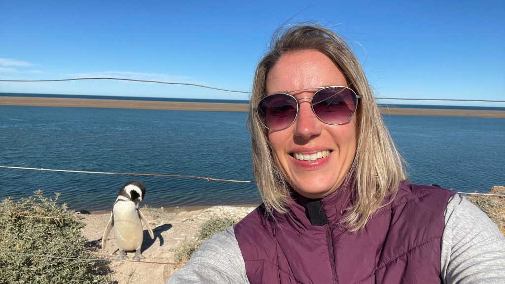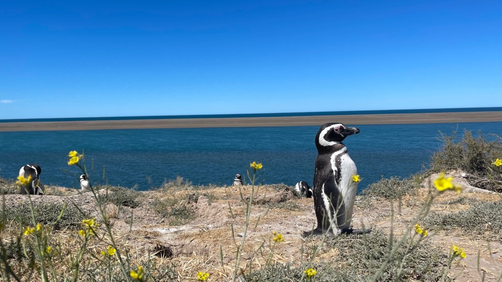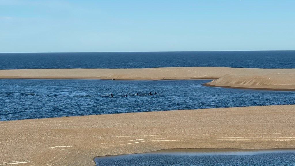 Am Folgemorgen verließen wir den schönen Stellplatz und bezahlten an der Einfahrt auf die Halbinsel die Nationalparkgebühr in Höhe von 2.600 Pesos (= ca. 9 €) pro Person. Nach rund 20 km gelangten wir dann an das Besucherzentrum, welches vielerlei Information zu Flora und Fauna bot. Außerdem erhielten wir dort eine Straßenkarte sowie die wichtige Information zu den Gezeiten. Die beste Chance Orcas zu sehen besteht während der Flut, welche früh am Morgen und spät am Abend einsetzt und die Uhrzeiten verschieben sich pro Tag jeweils um eine Stunde. Von dort aus ging die Fahrt weiter bis in die kleine Inselhauptstadt „Puerto Pirámides“. An der Tankstelle füllten wir noch einmal unseren Dieseltank auf und gegenüber konnten wir eine nette, kleine Bäckerei ausmachen. Wir kauften uns dort zwei Empanadas und ich war gerade im Begriff im Van noch ein Rührei dazu zuzubereiten. Plötzlich fuhr ein uns wohl bekannter, grauer Sprinter an uns vorbei und stoppte direkt neben uns. Es mag kaum zu glauben sein aber wir trafen soeben zum fünften Mal auf die beiden Franzosen mit ihren beiden kleinen Kindern. Wohl gemerkt nach einer zurückgelegten Strecke von gut 13k Kilometern! Da trifft man selbst zu Hause im Supermarkt seltener auf Bekannte die im gleichen Ort leben. 😅 Wir frühstückten in Ruhe und machten uns danach zu Fuß entlang vom Strand auf zu ihrem Stellplatz um uns noch ein wenig mit ihnen zu unterhalten. Dort lernten wir dann auch Udo kennen, der alleine mit seinem großen „Steyr“ Expeditions-Mobil unterwegs ist. Leider hat er seit Anbeginn seiner Reise massive Probleme mit seinem Fahrzeug. Im Ankunftshafen in Montevideo hatte man wohl versucht sein Motorrad von der elektrischen Heckrampe zu stehlen. Dies gelang den vermeintlichen Dieben zwar zum Glück nicht aber sie beschädigten bei dem Versuch massiv die Elektronik und so verbrachte er die ersten Wochen in der Werkstatt. 😔 Und seit einigen Tagen spinnt entweder seine Lichtmaschine oder seine Batterie weswegen er fürchtet, über kurz oder lang zu wenig Strom für die Fahrzeuglichter zu generieren. Der arme Tropf tat uns ganz schön leid aber außer ein paar aufmunternden Worten hatten wir in diesem Moment leider nicht viel zu bieten. Da das Wetter an diesem Tag ideal war, Sonnenschein und im Gegensatz zum Vortag angenehme Temperaturen, wollten wir unbedingt noch bis „Punta Cantor“ am Ende der Insel fahren. Es ging rund 70 km über eine unbefestigte, sehr holprige Schotterpiste auf welcher wir nicht schneller als 50 km/h fahren konnten. Nach rund 1,5 Stunden gelangten wir dann am „Mirador Pingüinera“ an und dort wartete tatsächlich eine ganze Schaar der drolligen Tierchen auf uns. 🐧 Diese befanden sich nicht nur außer Reichweite unten am Strand, sondern auch oben auf der Steilklippe so dass wir sie Auge in Auge bewundern konnten. Ich war natürlich sofort hin und weg. 💕 Als ich mich sattgesehen hatte bereitete ich zum Nachmittagskaffee noch ein paar leckere Heidelbeer-Pancakes zu 🥞☕ und als wir diese genüsslich vertilgt hatten fuhren wir noch die rund 6 km bis zum Aussichtspunkt „Punta Cantor“. Dort gibt es ein Restaurant sowie ein Besucherzentrum und eine Plattform mit Sicht aufs Meer. Da der Höhepunkt der Flut erst in rund zwei Stunden einsetzen sollte entschieden wir, bis dahin noch den Wanderpfad an der Küste entlang zu laufen. Von diesem aus konnten wir auf die unten am Strand in der Sonne chillenden Robben und Seelöwen blicken. Wir genossen eine Weile die Aussicht und liefen dann zurück zur Aussichtsplattform. Da wir keine Wale entdecken konnten erkundigte ich mich beim Ranger, ob er uns denn in etwa sagen könnte wann die beste Zeit hierfür wäre. Er schaute mich ganz entgeistert an und fragte, ob wir denn nicht die eben vorbeigezogenen neun Orcas gesehen hätten. NEIN – hatten wir nicht da wir zu dieser Zeit wohl noch auf dem Wanderweg waren! 😨 Er meinte, wir sollten schnell versuchen zu dem zwei Kilometer weiter, wieder in Richtung der Pinguine, gelegenen Aussichtspunkt zu fahren und eventuell würden wir sie von dort aus noch sehen können. Also spurteten wir zum Parkplatz und fuhren so schnell es eben auf der Schotterstraße ging dorthin. Bereits vom Auto aus konnte ich Bewegung im Wasser erkennen und dort angelangt hatten wir tatsächlich das riesengroße Glück und konnten die neun Orcas direkt vor uns ausmachen. 😁 Das Männchen war eindeutig an der gigantisch großen Rückenfloss zu erkennen. Die anderen Tiere waren entweder Weibchen oder noch nicht ganz ausgewachsen. Sie schwammen lange Zeit in der Bucht hin und her und wir konnten sie sogar bei ihren Jagdversuchen, bei welchen sie sich weit aus dem Wasser hinauswagen und auf den Strand werfen, beobachten. Wie geil war das denn bitte!!! ❤ Kurz darauf traf der Ranger am Parkplatz ein und erklärte, dass es sich hierbei wohl um eine Orca „Schule“ handelte. Das heißt die erwachsenen, erfahrenen Tieren brachten den Jungtieren die Jagdtechnik bei weswegen sie sich auch an steileren Uferabschnitten aus dem Wasser herauswarfen an denen sich gar keine Beute befand. Als die Killerwale weiterschwammen verfolgten wir sie noch einmal weiter mit dem Auto bis zum ersten Aussichtspunkt bei den Pinguinen. Auch von dort aus konnten wir ihrem Treiben noch eine ganze Weile zusehen. Wir hatten gehofft, eventuell auf diesem Parkplatz übernachten zu können obwohl es eigentlich streng untersagt ist innerhalb des Nationalparks zu campen. Da uns der Ranger leider hierhin gefolgt war und er uns kurz drauf gegen 20 Uhr mitteilte, dass der Park nun schließen würde waren wir dazu gezwungen die ganze weite, holprige Strecke bis nach „Puerto Pirámides“ zurückfahren. 😣 So kamen wir in die einsetzende Dunkelheit hinein und die tiefstehende Abendsonne erschwerte das Fahren auf der Piste zusätzlich. Zumal wir auf der Hinfahrt sehr viele wildlebende Tiere wie Emus, Guanacos, Schafe und sogar zwei Gürteltiere gesehen hatt
