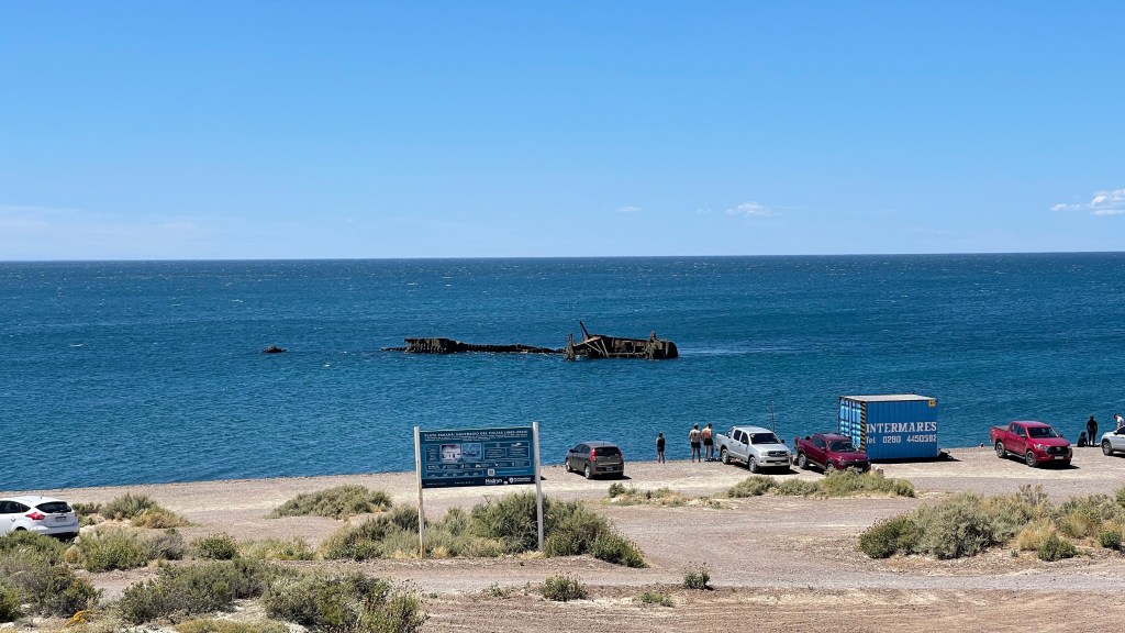 Wir verbrachten dort eine ruhige Nacht und als wir gerade frühstückten schlenderte Udo niedergeschlagen an unserem Van vorbei. Er hatte gerade seine E-Mails gecheckt da er am Tag zuvor die Herstellerfirma seines LKWs in Österreich kontaktiert hatte in der Hoffnung, dass sie eventuell einen Tipp für ihn hätten. Allerdings erhielt er nur die Antwort, dass an diesem Tag Feiertag in Österreich wäre (Maria Empfängnis) woraufhin wir kurz darauf feststellten, dass der Tag auch in Argentinien als Feiertag gilt. Wir liefen noch einmal in den Ortskern zur Tankstelle um das dortige Internet zu nutzen und kauften beim Bäcker noch eine Packung Toastbrot sowie etwas Süßes für den Nachmittag. Zurück am Van gaben wir Udo noch ein paar gute Ratschläge mit, was wir an seiner Stelle tun würden. Mehr Unterstützung konnten wir dem armen Tropf leider nicht mehr bieten. Parallel sprach uns noch ein anderes Pärchen an welches wir bei unserer Ankunft in „Montevideo“ im Büro unseres Agenten „Kessler“ getroffen hatten. Die beiden leben in dem französischsprachigen Inselparadies „La Reunion“ und reisen mit ihren beiden Teenie-Mädchen bereits seit längerem durch die Welt. Auch sie hatten an zwei verschiedenen Tagen keinen Erfolg und konnten, im Gegensatz zu uns Glückpilzen, keine Orcas sehen. Danach verabschiedeten wir uns noch herzlich von den anderen Franzosen bevor wir auf einen nahegelegenen Aussichtspunkt an einem Kap zusteuerten. Leider war die Zufahrt dorthin durch ein Gatter versperrt weswegen wir entschieden, der „Península Valdes“ an dieser Stelle Lebewohl zu sagen. Stattdessen fuhren wir die rund 100km bis nach nach „Puerto Madryn“. Die Stadt gilt als Tor zur Halbinsel, ist aber auf Grund der umliegenden Industrieanlagen sowie Raffinerien nicht wirklich schön. Auf dem angesteuerten Parkplatz konnten wir leider nicht parken da gerade diverse Food-Trucks sowie eine Bühne dort aufgebaut wurden. Wir stellten unseren Van am Straßenrand daneben ab und ich erkundigte mich bei zwei freundlichen Polizistinnen was hier im Gange war. Sie erklärten, dass häufiger an langen Wochenenden derartige Feste stattfinden würden und sowohl an diesem Donnerstag als auch am Samstagabend gegen 22 Uhr ein DJ auflegen würde. Wir schauten uns in der Gegend um und liefen die nicht wirklich sehenswerte Hauptstraße hinunter und an der langen Strandpromenade wieder zurück. Dabei schauten wir uns noch ein am Strand gelegenes Fisch- und Meeresfrüchte Restaurant an welches im Reiseführer gelobt wurde. Dementsprechend waren allerdings die Preise und so ließen wir es uns erst einmal offen, am Abend eventuell wieder dorthin zurückzukehren. In einem Supermarkt in der Nähe kauften wir uns ein paar kühle Getränke mit welchen wir uns an der schattigen Promenade für eine Weile niederließen. Derweil tat sich auch langsam etwas an den Essensständen und wir witterten unsere Chance, eventuell dort etwas Gutes und Günstiges schnappen zu können. Da noch nicht viel Betrieb war liefen wir noch den ziemlich langen Steg entlang hinaus aufs Meer. An diesem können wohl sogar große Kreuzfahrtschiffe anlanden. 😮 Vom Steg aus konnte man gut die Umrisse der Halbinsel erkennen. Diese ragt bestimmt 100 km ins offene Meer hinaus was dazu führt, dass man dort die einmalige Möglichkeit hat von der Küste aus Wale beobachten zu können. Gegen 20 Uhr hatten dann auch die meisten Food-Trucks geöffnet und wir kauften uns als erstes eine Tüte ganz frisch zubereiteter Calamari-Ringe. Wir haben selten derart zarte, hauchdünn panierte und lecker gewürzte Calamari gegessen. 👍 Danach teilten wir uns noch einen großen „Shawarma“ Wrap welcher ebenfalls frisch zubereitet wurde und sehr gut schmeckte. Hierbei handelt es sich um eine Art Döner aber das Fleisch ist nicht gepresst, sondern eher fein gewürfelt. Es wird zwar auch von einem Drehspieß heruntergeschnitten, kommt danach aber noch einmal zusammen mit dem Wrap auf den Grill. Anschließend wird alles noch mit Gemüse und Sauce nach Wahl belegt bevor der Wrap zusammengerollt wird. So blieb unsere Küche an diesem Tag kalt (und sauber 😉) und im verbleibenden Tageslicht machten wir uns auf die Suche nach einem Stellplatz für die Nacht. Ich wusste von zwei bis drei Stellen in der nahen Umgebung und der letzte Platz, direkt am langen Kiesstrand „Playa Paraná“ mit Blick auf ein Schiffswrack, wurde es dann auch. 🥰