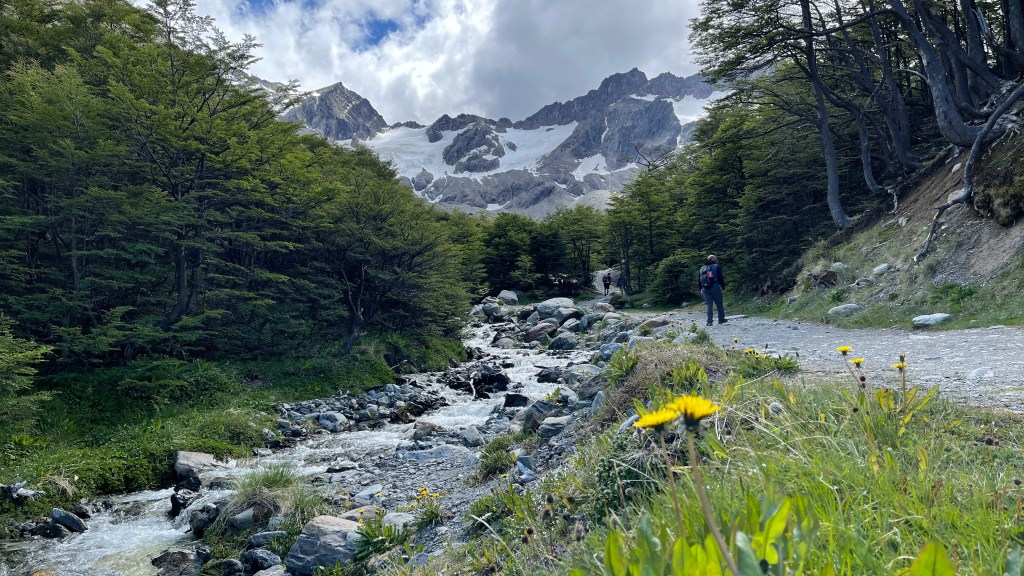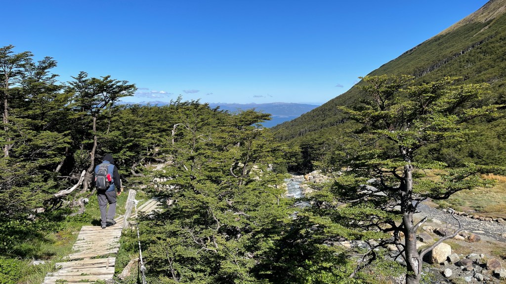 Am Morgen von Heiligabend wurden wir von den Lautsprecherdurchsagen an Deck des Kreuzfahrtschiffs geweckt. 😮 Aber bis dahin hatten wir auf dem Parkplatz eine wirklich sehr ruhige Nacht. Nach dem wir unseren frisch aufgebrühten Kaffee getrunken hatten fuhren wir erneut an die „YPF“ Tankstelle vom Vortag zurück an welcher wir kostenfrei die heißen sowie sauberen Duschen nutzen konnten. Dort frühstückten wir auch noch im Van die Leckereien, welche ich zuvor in der Stadt bei dem wirklich tollen Café „Tante Sara“ gekauft hatte. 🥐☕ In der Hoffnung, dass die Wettervorhersage stimmen und es gegen Mittag schöner werden würde machten wir uns auf zum Parkplatz beim „Glaciar Martial“. Von dort aus führte uns ein ca. 8 km langer, sehr schön angelegter Rundweg bis an die Gletscherzunge heran. Auf dem ersten Wegstück liefen wir durch ein grünes Wäldchen, immer entlang des rauschenden Gletscherbachs. Oben angelangt bogen wir offensichtlich auf die Piste ein welche im Winter für Abfahrtski genutzt wird wie unschwer am Lift zu erkennen war. Und der Anblick dort war einfach atemberaubend: Bereits von hier konnten wir hinunter aufs stahlblaue Meer und einen Teil der Stadt blicken. Wie großartig es wohl sein muss, an einem sonnigen Wintertag die Piste hinunter zu wedeln und dabei auf die verschneite Winterlandschaft sowie die Wellen auf dem Ozean blicken zu können?! ❤ Wobei auch wir zwischenzeitlich einen sehr angenehmen Sonne-Wolken-Mix genießen durften so dass sich die Temperaturen sogar sehr frühlingshaft anfühlten. Das letzte Wegstück bis zum Gletscher gestaltete sich dann etwas anspruchsvoller und steiler, war aber immer noch gut machbar. Der Pfad endete direkt unterhalb der Gletscherzunge und von dem Berg aus hatte man eine wunderbare Sicht hinunter auf „Ushuaia“. Man konnte den Flughafen, die beiden Buchten, das Meer und auch den (Yacht-)Hafen gut sehen. Nach einer Weile wurde es dann doch frisch und so machten wir uns an den Abstieg bzw. den Rückweg zum Parkplatz. Auf der Rückfahrt in die Stadt hatten wir dann leider einen kleinen (unverschuldeten) Unfall. Wir fuhren hinter einem weißen Mittelklassewagen die Straße hinab als dieser unerwartet mitten auf der Straße anhielt weswegen auch wir stoppten. Plötzlich legte der Fahrer den Rückwärtsgang ein und fuhr, offensichtlich ohne in den Rückspiegel zu schauen, zurück. Unser Hupen kam wohl zu spät denn im selben Moment krachte er auch schon in unsere Front. 😰 Die Emotionen kochten, insbesondere auf deren Seite, erst einmal ziemlich hoch und anfangs stellten sie es so dar als wären wir auf sie drauf gefahren. Wir konnten dies allerdings, nicht zuletzt wegen unserer „dash cam“, relativ schnell widerlegen. Hier zeigte sich aber auch mal wieder mein mangelnder spanischer Wortschatz. 😕 Wir bestanden auf die Polizei aber der Fahrer rief zuerst den Eigentümer des Mietwagens an mit welchem er gerade den Unfall verursacht hatte. Dieser erschien auch kurz darauf zusammen mit einem jüngeren Mann welcher wohl hätte übersetzen sollen aber nur sehr schlecht Englisch sprach. Sie wollten unsere Versicherungsunterlagen aber wir weigerten uns, diese ohne Polizei herauszugeben. Ansonsten hätte es vielleicht mit einer Teilschuld für uns und anteiligen Reparaturkosten geendet. Unser Wagen hatte, bis auf ein paar minimale Lackschäden, zum Glück nichts weiter. Nach einigem hin und her ließ man uns dann (ohne Polizei da ihrer Schuld wohl bewusst) von dannen ziehen. 🤷♀️ Auf diese Aufregung hätten wir an Weihnachten gut und gerne verzichten können! Wir parkten erneut unten am Hafen und liefen von dort aus zu den beiden Restaurants, welche wir am Vortag außerhalb der Öffnungszeiten angetroffen hatten. Leider hatten beide auch über Weihnachten zu und das einzige offene Restaurant, ein asiatisch-argentinisches Büffet-Restaurant, verlangte an Heiligabend stolze 50 € pro Kopf. Der Preis erschien uns für die angebotenen Speisen keinesfalls gerechtfertigt zumal wahrscheinlich nicht einmal Simon so viel hätte Essen können. So kochten wir also doch noch „Grillwurstgulasch“ und aßen unser restliches, immer noch knuspriges Baguette vom Morgen dazu. Glücklicherweise ist es abends extrem lange hell so dass wir selbst um 22 Uhr noch bei ausreichendem Tageslicht den Weg in den Nationalpark „Tierra del Fuego“ antreten konnten. Ab 17 oder 18 Uhr ist die Einfahrt kostenfrei und so sparten wir uns in Summe immerhin schlappe 20 € Eintrittsgebühr. 😉