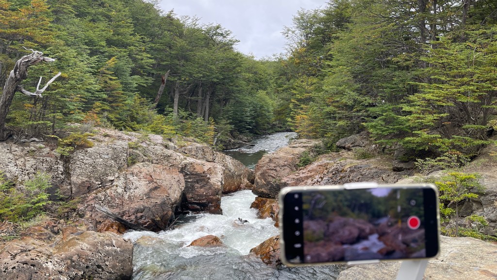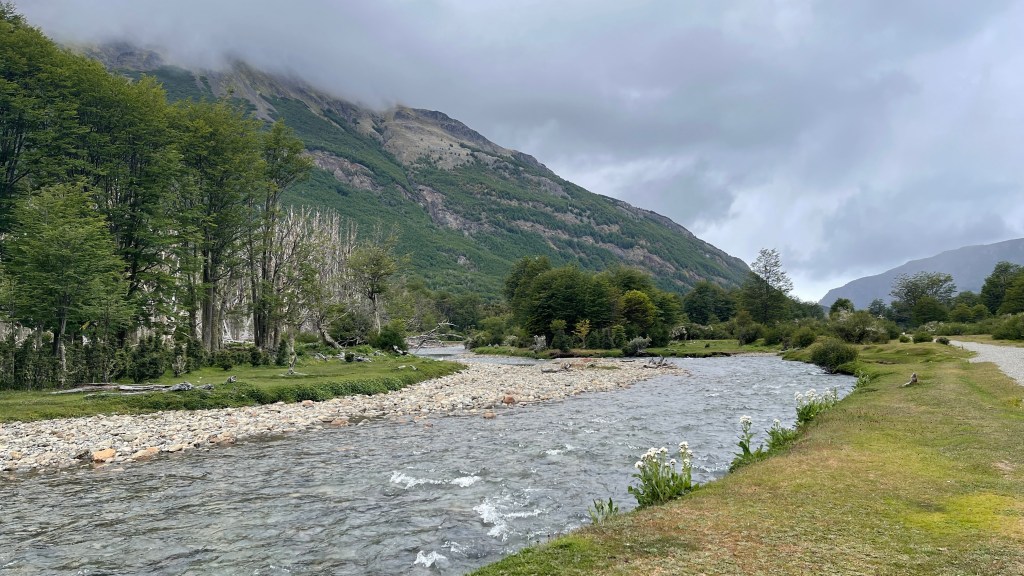 Durch die Sonne vom Vortag war unser Innenraum am Morgen noch schön aufgeheizt so dass wir auf das Anschalten der Standheizung getrost verzichten konnten. Wir frühstückten noch gemütlich an dem weitläufigen Stellplatz und fuhren von dort aus weiter bis zum nahegelegenen Besucherzentrum „Alakush“. Dieses mutet relativ neu und modern an und beherbergt neben einem recht großen Restaurant auch einen Souvenir-Shop sowie ein Informations-Zentrum mit Erklärungen zur hiesigen Flora und Fauna. Leider gab es dort kein Internet so dass wir uns ohne vorherigen Wetter-Check auf die dort beginnende Wanderung begaben. Der Himmel war zwar wolkenverhangen aber es sah nicht wirklich nach Regen aus. Und unsere Erfahrungen der letzten Tage hatten gezeigt, dass selbst eine Regenwahrscheinlichkeit von 70% mitunter nur wenige Tropfen oder kurze Schauer bedeuten kann. Der Weg startete direkt am Besucherzentrum und führte oftmals am Ufer vom „Río Lapataia“ entlang sowie durch relativ dichten Wald. In Ufernähe entdeckten wir sogleich eine große Robbe, welche sich offensichtlich ziemlich weit vom offenen Meer entfernt hatte und allem Anschein nach den ganzen Fluss hinauf bis hierher geschwommen war. 😯 Der gut ausgetrampelte Pfad führte uns über Stock und Stein bis zur grünen chilenischen Grenze. Vom Weg aus konnte man immer wieder auf die Berge auf der anderen Uferseite blicken. Zu Beginn der Wanderung waren deren Gipfel auch noch sehr gut zu erkennen aber als wir am Ende des Weges angelangten sahen wir deutlich eine Regenfront aufziehen welche die Bergspitzen plötzlich verschwinden ließ. Wir machten kehrt und liefen die gut 5 km wieder zurück zum Parkplatz. Durch den Wald waren wir jedoch gut vor Regen geschützt zumal sowieso nur einige wenige Tropfen fielen und wir es irgendwie schafften vor der Regenfront zu bleiben. 😅 Etwas unterzuckert schauten wir uns in der Cafeteria des Besucherzentrums um, konnten aber nicht wirklich etwas Verlockendes ausmachen. So fuhren wir zurück zum Postamt und befriedigten unsere Lust nach etwas Süßem dort im Van mit Schoko-Paradies-Creme in die wir Banane und Kekse dippten. 😛 Am zweiten Weihnachtstag hatte die Poststation sogar geöffnet und wir schafften es gerade noch rechtzeitig vor Ladenschluss hinein. Dem Stapel an Postkarten nach zu urteilen verschicken hier ziemlich viele ihre Urlaubsgrüße. Wir hingegen ließen uns nur unsere Pässe abstempeln und sind nun stolze Besitzer eines „fin del mundo“ Eintrags. Dieser kostete uns aber auch immerhin schlappe 700 Pesos, als umgerechnet ca. 2,50 € pro Kopf. Von dort aus fuhren wir weiter zum Dritten und somit letzten Campingplatz welcher ebenfalls sehr schön, umgeben vom „Río Pipo“ in einem kleinen Tal liegt. Dort trafen wir auch wieder auf die drei anderen Gefährte inklusive ihrer deutschsprachigen Besitzer. Da es mittlerweile auf nur noch 5 Grad abgekühlt hatte warfen wir unsere Heizung an und verbrachten den Großteil des Nachmittags und abends im warmen Van. Wir arbeiteten noch eine Weile an den Laptops bevor wir unser restliches Grillwurstgulasch mit Reis aßen und anschließend ganz gemütlich im Bett noch eine Episode von „7 vs. Wild“ schauten.