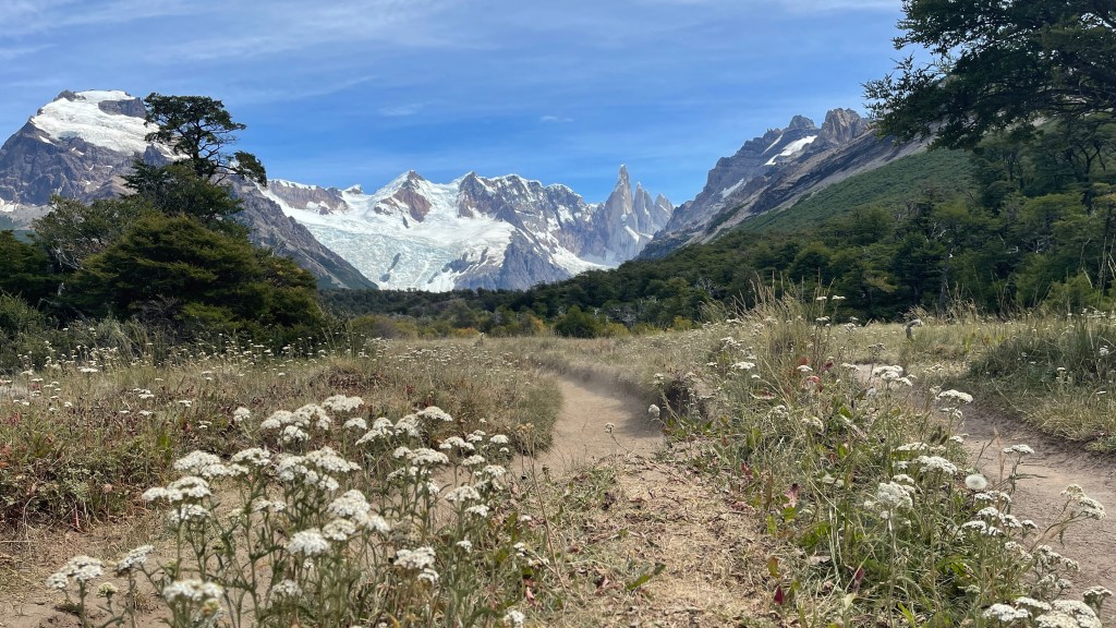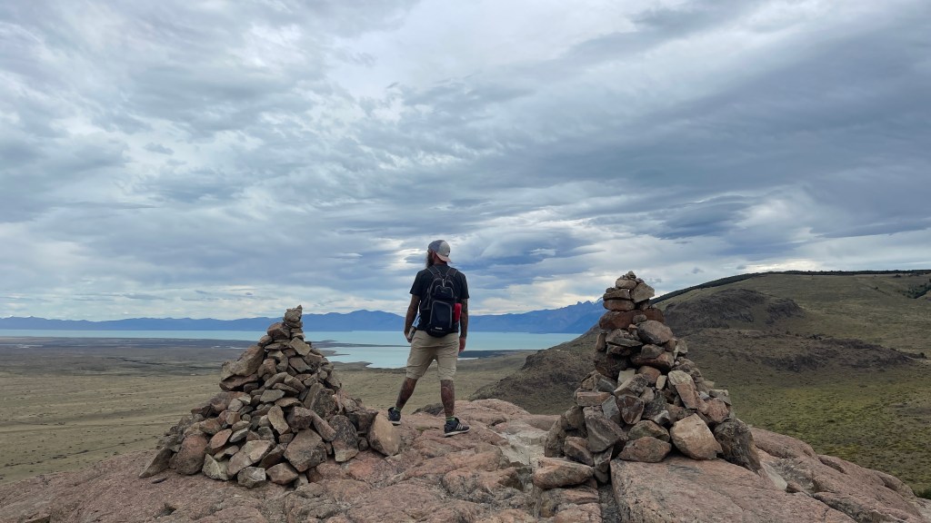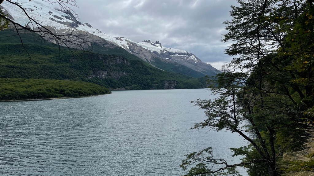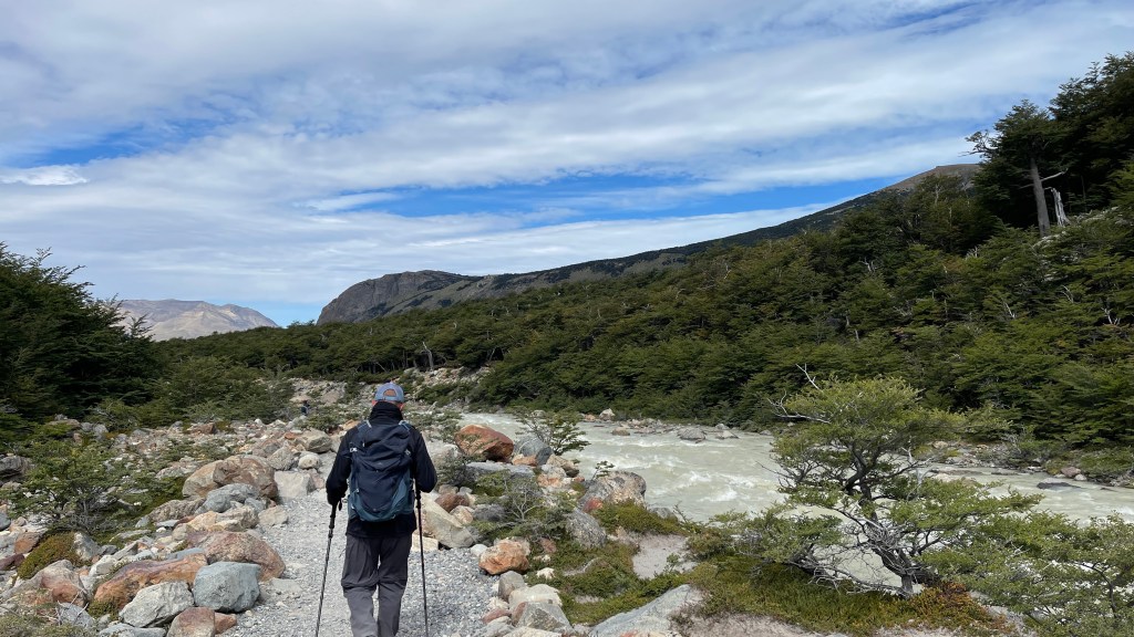 Wider Erwarten konnten wir auf dem Parkplatz problemlos die Nacht verbringen ohne von einem Ranger verjagt zu werden. Von dort aus liefen wir am Vormittag ein Teilstück des „Sendero Punta Norte“. Der schmale Trampelpfad führte uns zuerst über eine Hängebrücke und anschließend ging es über unzählige Wurzeln und einige Steine sowie kleine Bachläufe durch deinen dichten Ulmenwald. In Summe würde sich der Weg 10 Kilometer immer entlang des Sees ziehen bis hin zu einem Aussichtspunkt auf den „Fitz Roy“. Kurz danach könnte man auch, zu Fuß oder mit dem Fahrrad, am dortigen Grenzposten Argentinien verlassen und die Grenze nach Chile überqueren um zum südlichsten Startpunkt der „Carretera Austral“ in „Villa O`Higgins“ zu gelangen. Wir hielten allerdings nach etwa 3 Kilometern an einem kleinen Kiesstrand an da Simon seine Angel mitgenommen hatte. Während mein Mann seinen Gummiwurm badete genoss ich die Aussicht auf die hängenden Gletscher an den gegenüberliegenden Bergen sowie auf den See. Leider war es an dem Tag merklich kühler als zuvor und auch etwas wolkiger. Nach insgesamt 6 Kilometern mit angenehmen 270 Höhenmeter kamen wir drei Stunden später wieder an unserem Auto an. Von hier aus hätte man den See auch mit dem Boot überqueren können. Allerdings war uns die Bootsfahrt mit 50 € p.P. definitiv zu teuer. Und auch die 5 € pro Kopf für den nur 2 km langen Rundwanderweg zum „Glacier Huemul“ wollten wir nicht investieren. Hier gibt es sooo viele tolle Wanderwege die, zu unserem Erstaunen, trotz der Zugehörigkeit zum „Parque Nacional los Glaciares“ alle kostenfrei sind. 👍 Zu unserer Kaffeepause gab es je ein „Alfajor“ bevor ich für den Abend bzw. den kommenden Morgen Brötchen- & Pizzateig zubereitete. Simon startete derweil einen zweiten, neuerdings erfolglosen Angelversuch. Zum Glück war auf die Pizza verlass. 🤣