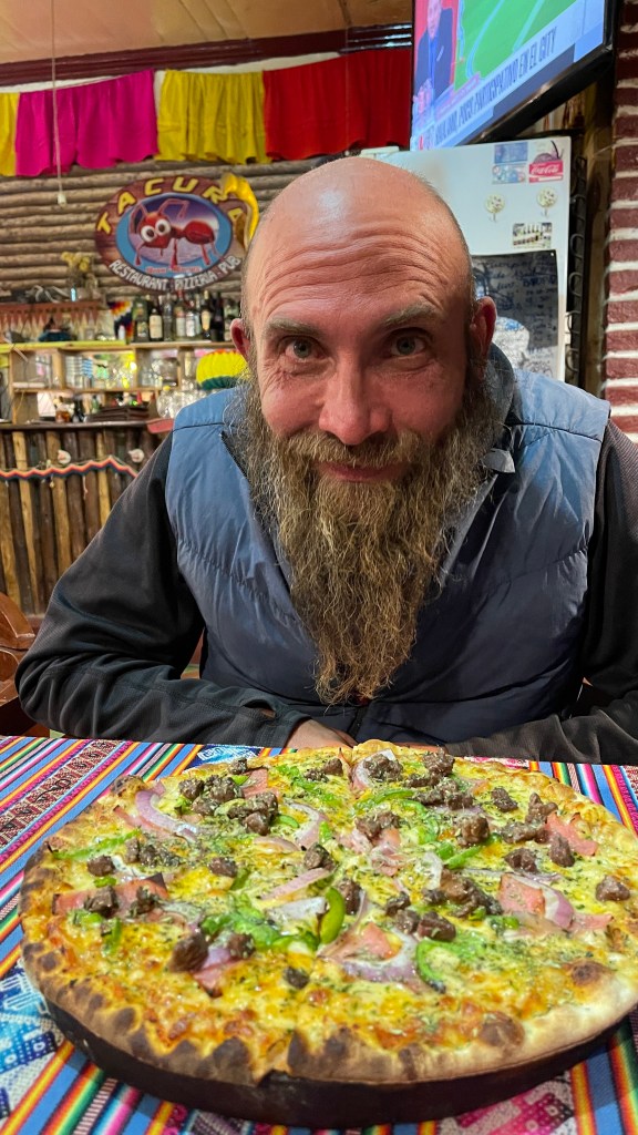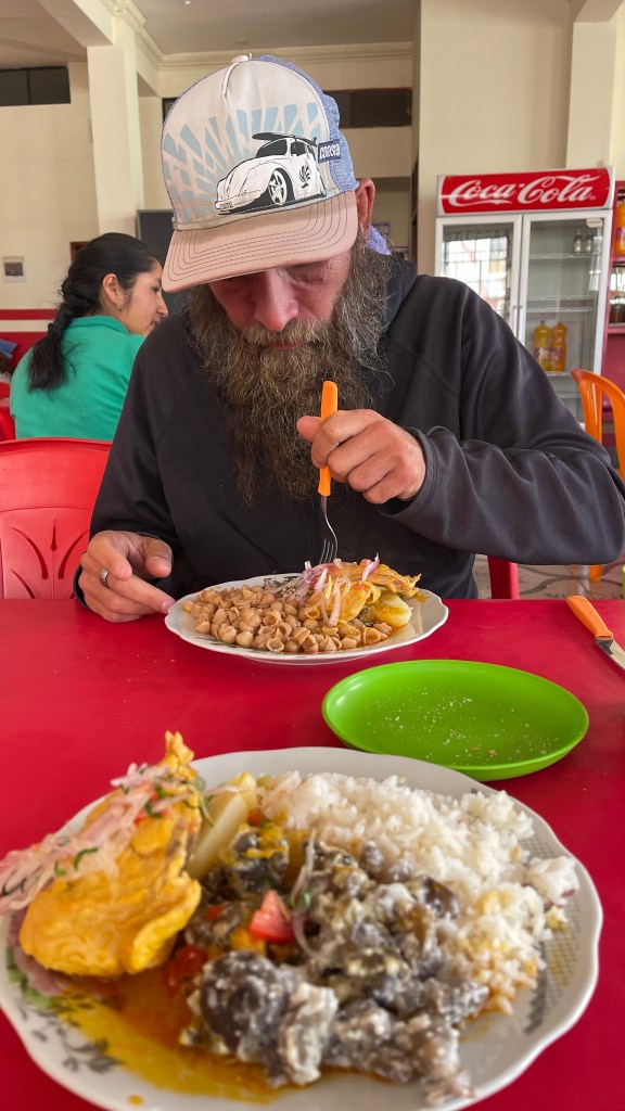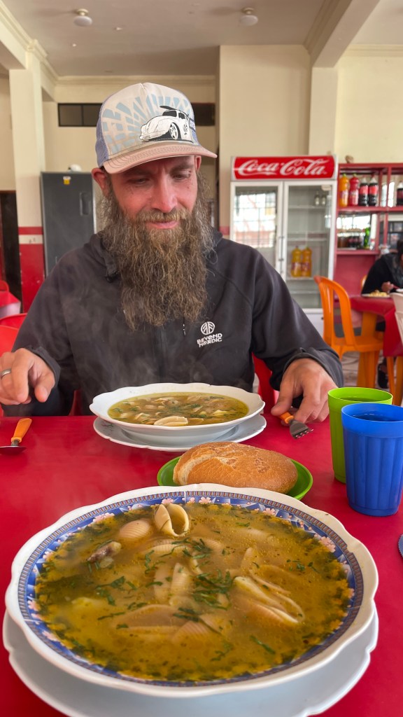 Am Donnerstagmorgen pflegten wir mal wieder ausgiebig unsere sozialen Kontakte da wir nun ja wieder online waren. Dabei ereilte mich auch die freudige Nachricht, dass eine sehr gute Freundin von mir Ende November ihr drittes Kind erwarten wird. 🥰 Das Frühstück ließen wir an diesem Tag zu Gunsten eines erneuten Mittagmenüs ausfallen. Diesmal gab es für jeden von uns einen großen Teller voll Nudelsuppe gefolgt von Hähnchen mit Reis und schwarzen Kartoffeln. Und da wir nicht so spät wie am Vortag zum Essen erschienen waren, war sogar noch alles richtig schön heiß. Auch ein kleiner Wackelpudding sowie ein Getränk waren in dem Preis von 1,40 € inbegriffen. 🙈 Anschließend schlenderten wir über den sehr großen Wochenmarkt auf dem es alles und nichts zu kaufen gab. Wir erwarben dort u.a. Obst, Honig sowie Toilettenpapier und kauften den Rest in einem der „Minimercados“. Große Supermärkte werden wir in Bolivien wahrscheinlich eher selten finden aber das Einkaufen in der Form macht ja auch irgendwie Spaß und bei diesen Preisen sowieso. 😇 Und auf dem Markt fand ich sogar noch einen neuen Föhn. 😀 Bleibt zu hoffen, dass dieser im Gegensatz zu seinem Vorgänger den Dienst am Wechselrichter unseres Vans nicht verweigern wird… Auf dem Weg zurück zum Van schnappten wir auf der Straße noch ein Dessert in Form von einem großen Stück süßem, aber sehr saftigem Schoko-Kuchen. Auch vier Empanadas fürs Abendessen waren noch drin so dass unsere Küche an diesem Tag komplett kalt blieb. 😋