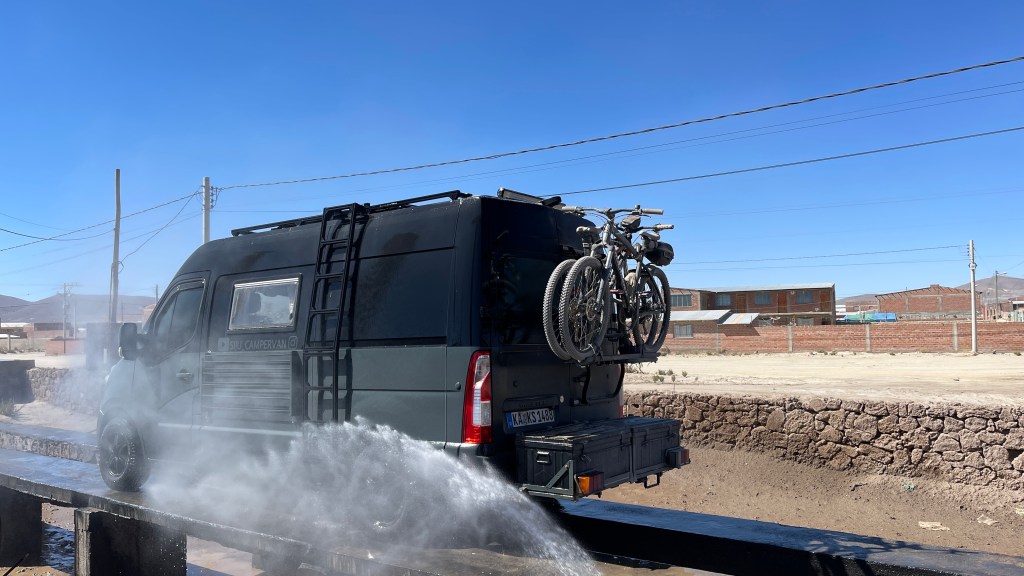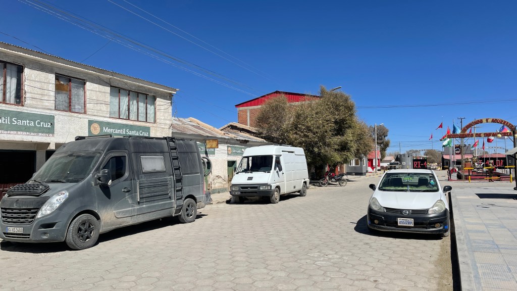 An unserem ersten Tag in „Uyuni“ begaben wir uns direkt morgens auf den Weg zu einer der hiesigen Werkstätten, wo wir noch für 14:00 Uhr am selben Tag einen Termin erhielten. 👍 Wir fuhren zurück ins kleine Zentrum und kümmerten uns, nach dem Frühstück, erst einmal um die organisatorischen Dinge. Bei „entel“ besorgten wir uns eine neue SIM-Karte und buchten für umgerechnet 22 € ein Datenpaket, welches uns 30 Tage Datenvolumen ohne jegliche Beschränkung zur Verfügung stellen sollte. Weiter ging es zur „BNB“ (Banco Nacional Bolivia) wo wir völlig problemlos und sogar gebührenfrei Geld abheben konnten. Als nächstes stand, nach den extrem staubigen Tagen auf der Lagunen Route, eine ausgiebige Dusche auf dem Programm. Die öffentliche Dusche war zwar blitzblank sauber aber leider war das Wasser maximal lauwarm so dass ich diese nicht wirklich genießen konnte. 😕 Aber egal, zumindest waren meine Haare danach endlich mal wieder schön frisch und sauber. Am frühen Nachmittag fuhren wir erneut zur Werkstatt und, wie erwartet, teilte man uns dort mit das eine Reparatur bzw. die Beschaffung neuer Stoßdämpfer im kleinen „Uyuni“ nicht möglich sei. Wir könnten aber selbst mit kaputtem Stoßdämpfer ohne Probleme auf den spiegelglatten „Salar de Uyuni“ sowie anschließend weiter über die Asphaltstraße in die ca. 400 km entfernt liegende Hauptstadt „Sucre“ fahren. Laut dem Mechaniker sollten wir dort problemlos Ersatz erhalten können. Zwischenzeitlich hatten wir per E-Mail auch die Firma „Marquart“ kontaktiert von denen wir die derzeit verbauten und extra verstärkten Stoßdämpfer haben. An und für sich sind wir mit diesen nämlich extrem zufrieden und die Probleme sind unserer Meinung nach den schlechten Straßen und nicht dem Material geschuldet. Prompt erhielten wir vom Firmeninhaber Antwort, dass er bereit wäre uns einen neuen Satz nach Bolivien zu senden insofern wir ihm eine Adresse geben könnten. 😀 Wie wir jedoch aus eigener Erfahrung sowie von Timo und Alina alias sprintour wissen, kommen Päckchen aus dem Ausland aber nicht gerade problemlos in Südamerika an… Und auch unsere Container-Buddys Lydia und Ju alias a_donde.voy, die über gute private Kontakte in „Sucre“ verfügen, rieten uns wärmstens von dem Vorhaben ab. 🤷♀️ Bevor wir uns weitere Gedanken über die Reparatur machten ließen wir uns erst einmal ein sehr schmackhaftes und noch dazu extrem günstiges Mittagsmenü schmecken. In einem Lokal, in dem vorrangig Einheimische zu Mittag essen, teilten wir uns für schlappe 1,40 € einen großen Teller Mais-Suppe sowie als Hauptgericht ein hauchdünnes Stück paniertes Rindfleisch mit Reis und pochiertem Ei. 😛 Zurück am Van räumten wir den Kofferraum aus um unsere Wasserpumpe zu checken und erfreulicherweise befand sich diese in tadellosem Zustand. Wahrscheinlich war während der einen, extrem kalten Nacht an den Thermen lediglich das Wasser im Zuleitungsschlauch eingefroren was dazu geführt hatte, dass kein Wasser mehr aus unserem Wasserhahn mehr kam. Somit konnten wir unser Waschbecken nun wieder bedenkenlos nutzen und da wir schon einmal den Kofferraum ausgeräumt hatten, befreiten wir diesen sowie den Innenraum unseres Fahrzeuges bei der Gelegenheit auch gleich noch grob vom Staub der letzten Tage. 😊
