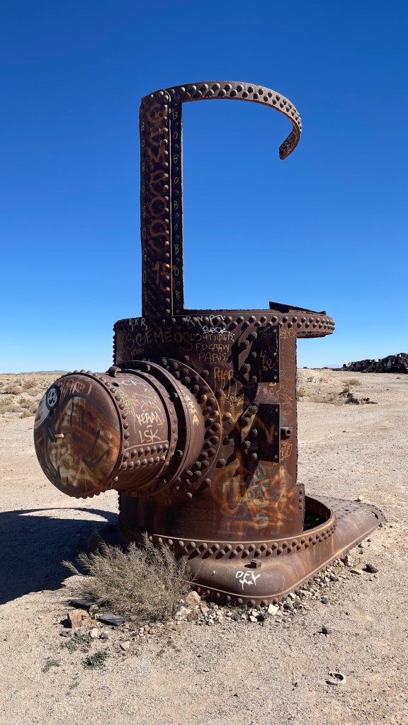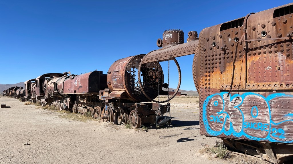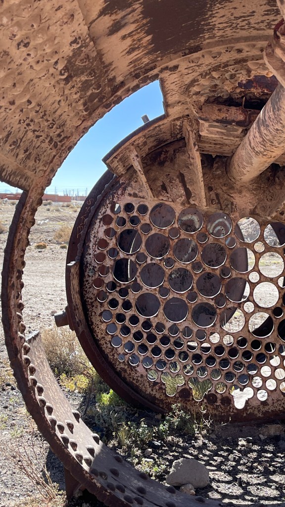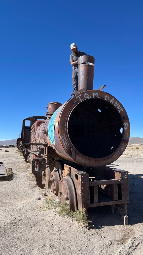 Da ich mich am Freitag nicht ganz so fit fühlte ließen wir auch diesen Tag ruhig angehen. Vermutlich auf Grund der starken Temperaturschwankungen zwischen Tag und Nacht hatte ich mir einen leichten Atemwegsinfekt eingehandelt. Die Nase lief mir irgendwie schon seit „San Pedro“ auf Grund der furchtbar trockenen Luft permanent und nun kratzte auch noch mein Hals ein wenig. 😕 Am Nachmittag schauten wir uns auf dem Eisenbahnfriedhof, dem „Cementerio de Trenes“ um. Dieser gilt als größter seiner Art weltweit und hier rosten, wahrscheinlich noch die nächsten hundert Jahre lang, rund 100 alte Lokomotiven und Wagons vor sich hin. Die ältesten stammen aus dem ausgehenden 19. Jahrhundert und dienten damals dem Transport der wertvollen (Edel-) Metalle aus den umliegenden Mienen, von Bolivien bis nach Antofagasta an der Pazifik-Küste. Im Licht der langsam untergehenden Sonne schimmerten die rostenden Eisenbahnüberreste besonders schön und wir nahmen uns Zeit zwischen diesen herumzuturnen. 🙃
