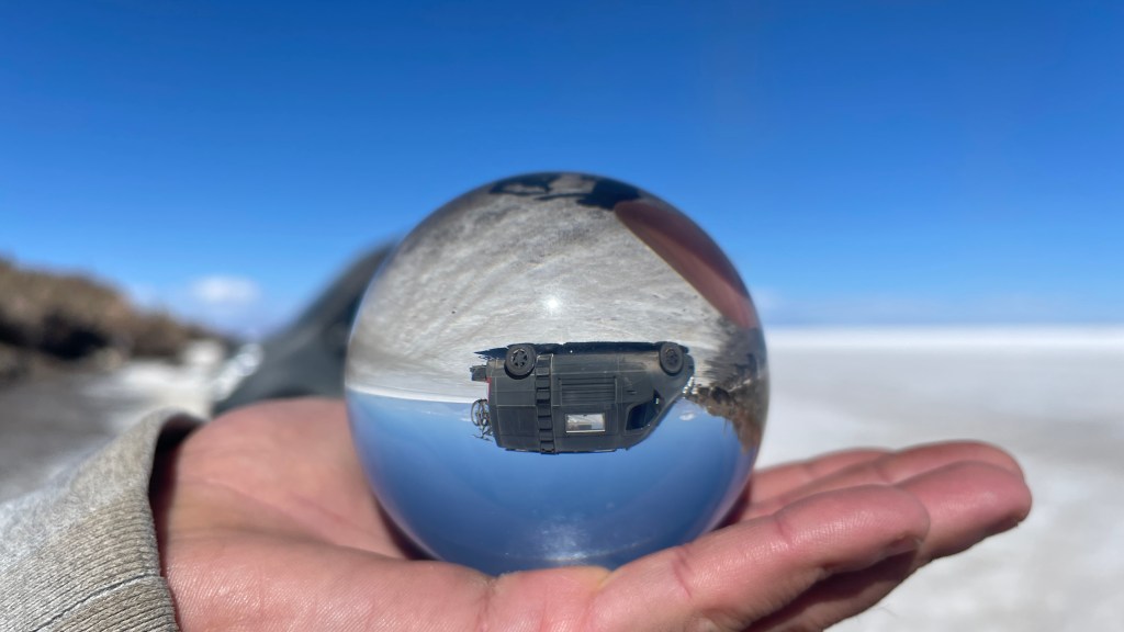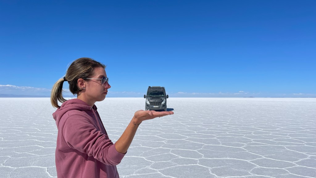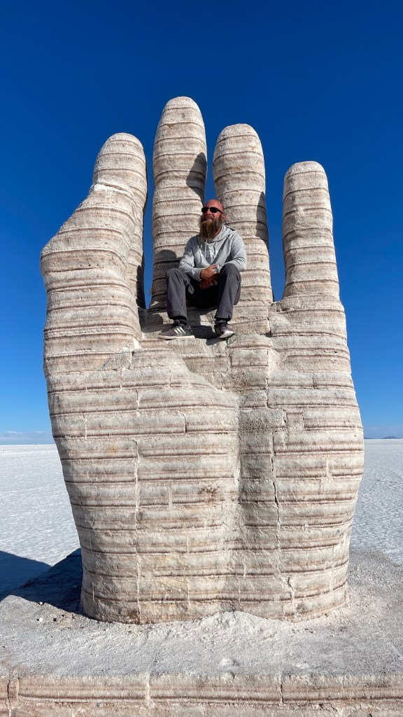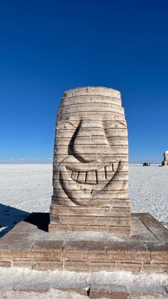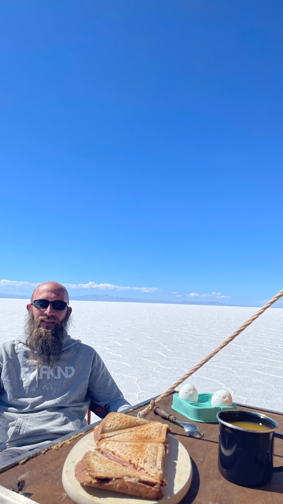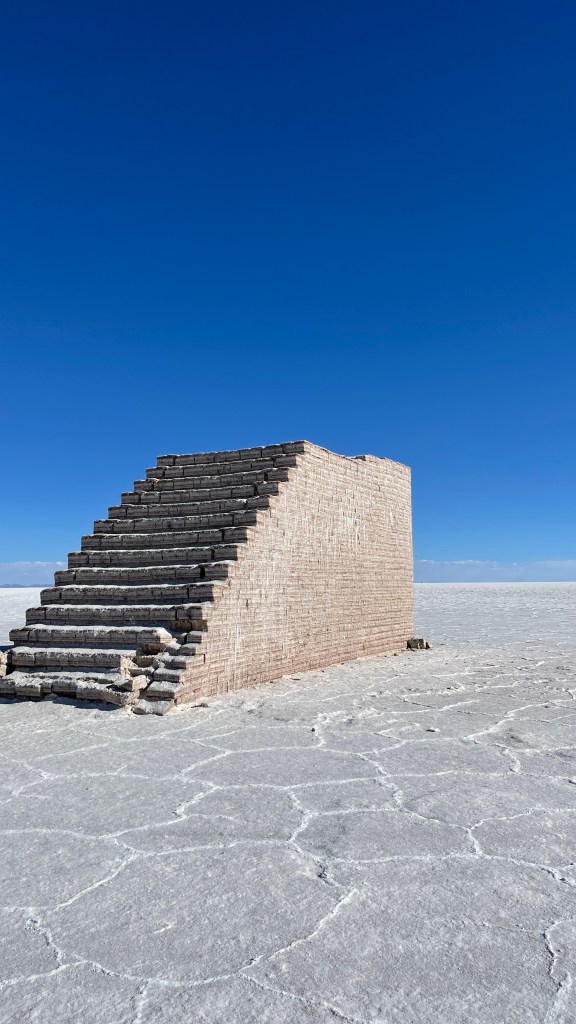 Die Nacht war erwartungsgemäß ruhig und dank der Sonne, die erneut von einem azurblauen Himmel strahlte, wurde es am nächsten Morgen auch relativ schnell wieder warm. ☀😎 Wir verabschiedeten uns von der „Isla Incahuasi“ und fuhren zurück in Richtung Salzhotel. Irgendwo im Nirgendwo, Mitten in der Endlosigkeit, stoppten wir für unsere Frühstückspause. Dass war definitiv einer der coolsten und zugleich surrealsten Frühstücksspots überhaupt. Eine bessere Aussicht kann es fast nicht geben. 🥰 Nach dem wir gemütlich gefrühstückt hatten schossen wir noch einige lustige Fotos was auf dem „Salar“, dank dem einfachen Spiel mit den Perspektiven, selbst uns als Kamera-Laien ganz gut gelang. Als alle Requisiten wieder im Van verstaut waren fuhren wir zurück in Richtung „Colchani“. Bevor wir den Salzsee wieder verließen schauten wir uns noch die wirklich gut gemachten Salzskulpturen sowie den „Stairway to Heaven“ an. Wenn man alle Stufen, die rein aus Salzblöcken bestehen, erklommen hat fühlt man sich dank der Höhe sowie der Fernsicht tatsächlich ein wenig wie im Himmel. 😇 Am späten Nachmittag ging es dann zurück nach „Uyuni“ wo wir unseren Bus neuerdings vor der Militärbasis parkten. Müde von all den vielen Eindrücken, aber auch von dem blendend hellen Weiß, beschlossen wir ein letztes Mal im Restaurant „Tacurú“ einzukehren da wir auf Kochen so rein gar keine Lust mehr hatten. 😋