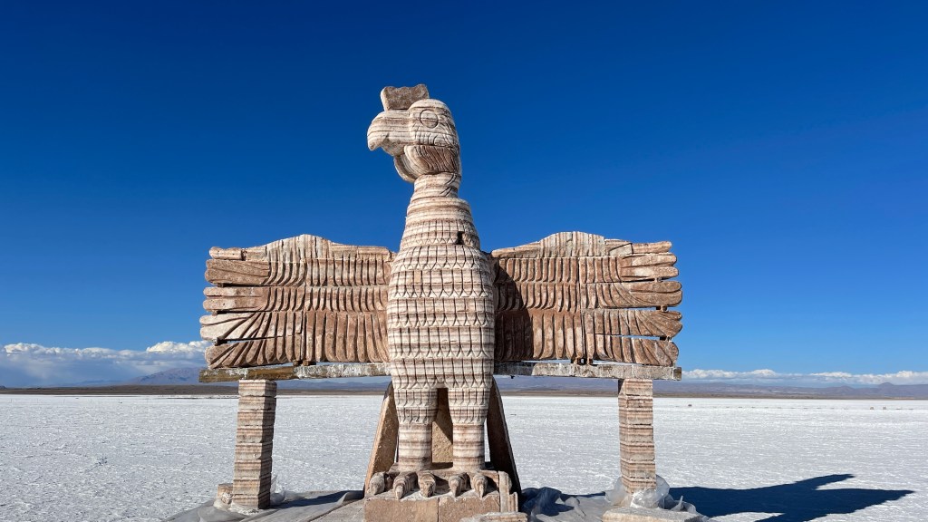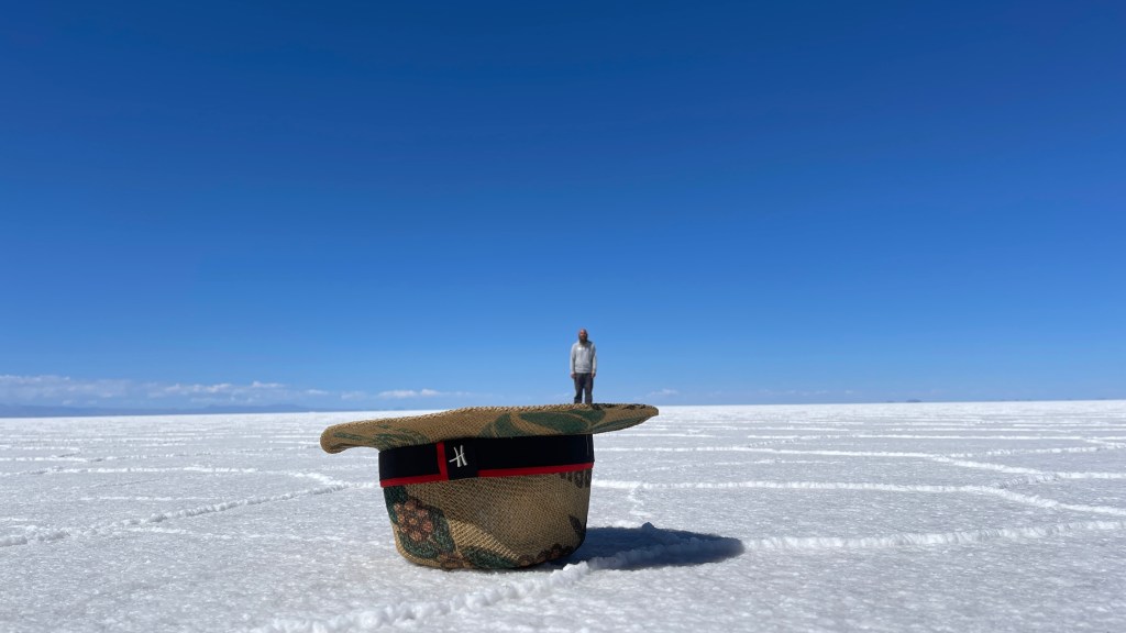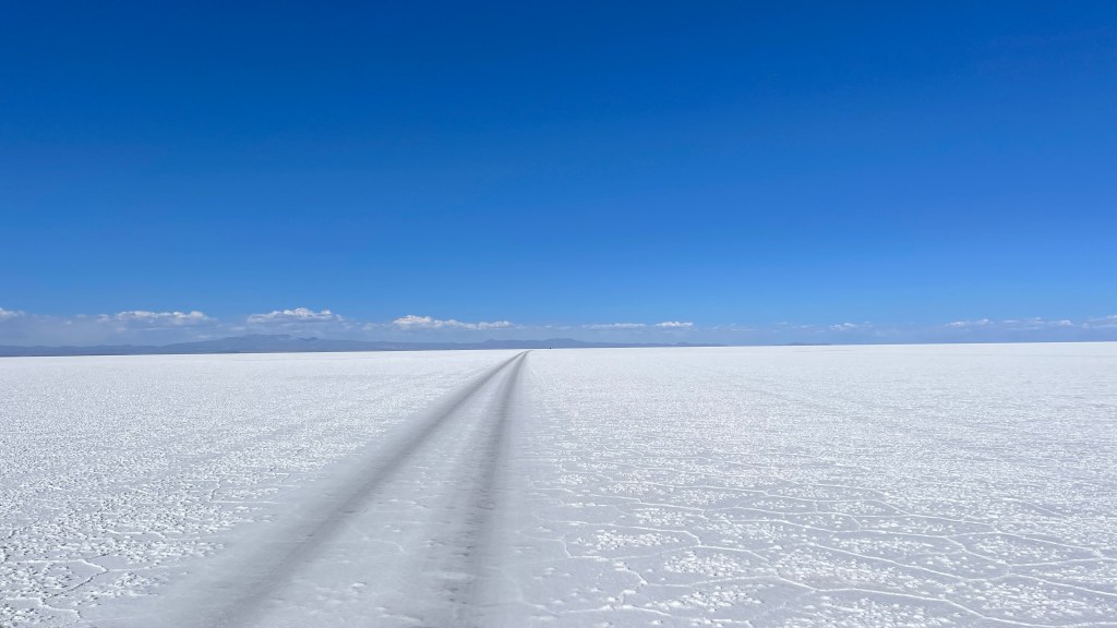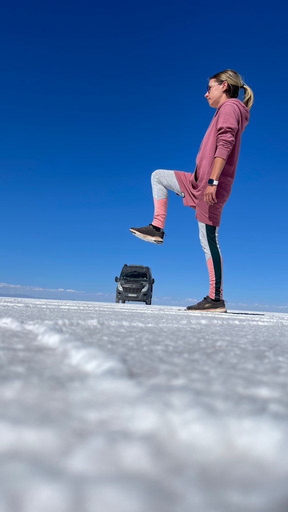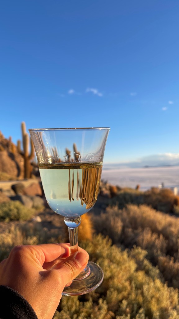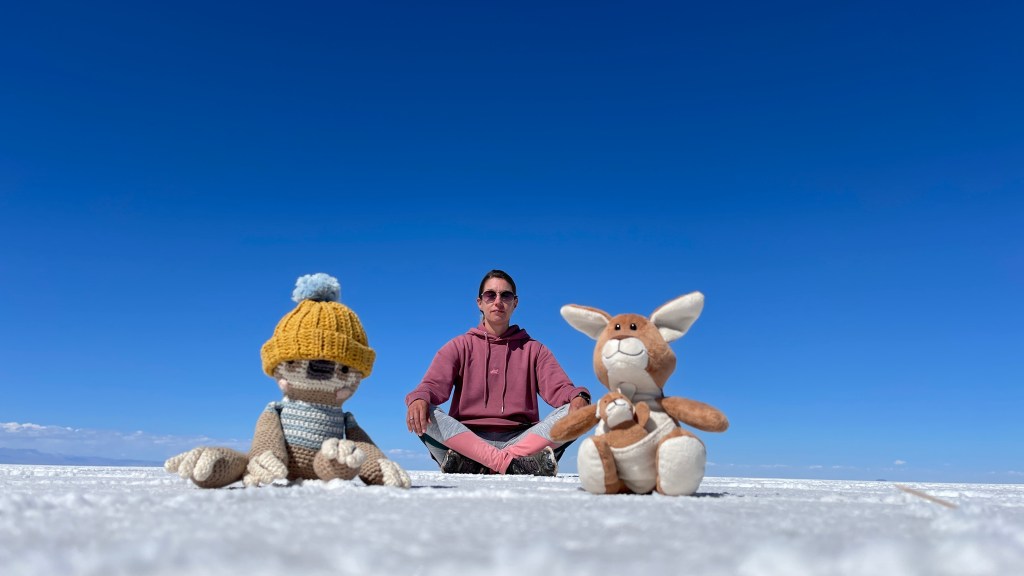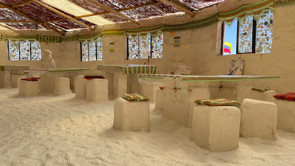 Die Nacht war erwartungsgemäß ruhig und dank der Sonne, die erneut von einem azurblauen Himmel strahlte, wurde es am nächsten Morgen auch relativ schnell wieder warm. ☀😎 Wir verabschiedeten uns von der „Isla Incahuasi“ und fuhren zurück in Richtung Salzhotel. Irgendwo im Nirgendwo, Mitten in der Endlosigkeit, stoppten wir für unsere Frühstückspause. Dass war definitiv einer der coolsten und zugleich surrealsten Frühstücksspots überhaupt. Eine bessere Aussicht kann es fast nicht geben. 🥰 Nach dem wir gemütlich gefrühstückt hatten schossen wir noch einige lustige Fotos was auf dem „Salar“, dank dem einfachen Spiel mit den Perspektiven, selbst uns als Kamera-Laien ganz gut gelang. Als alle Requisiten wieder im Van verstaut waren fuhren wir zurück in Richtung „Colchani“. Bevor wir den Salzsee wieder verließen schauten wir uns noch die wirklich gut gemachten Salzskulpturen sowie den „Stairway to Heaven“ an. Wenn man alle Stufen, die rein aus Salzblöcken bestehen, erklommen hat fühlt man sich dank der Höhe sowie der Fernsicht tatsächlich ein wenig wie im Himmel. 😇 Am späten Nachmittag ging es dann zurück nach „Uyuni“ wo wir unseren Bus neuerdings vor der Militärbasis parkten. Müde von all den vielen Eindrücken, aber auch von dem blendend hellen Weiß, beschlossen wir ein letztes Mal im Restaurant „Tacurú“ einzukehren da wir auf Kochen so rein gar keine Lust mehr hatten. 😋