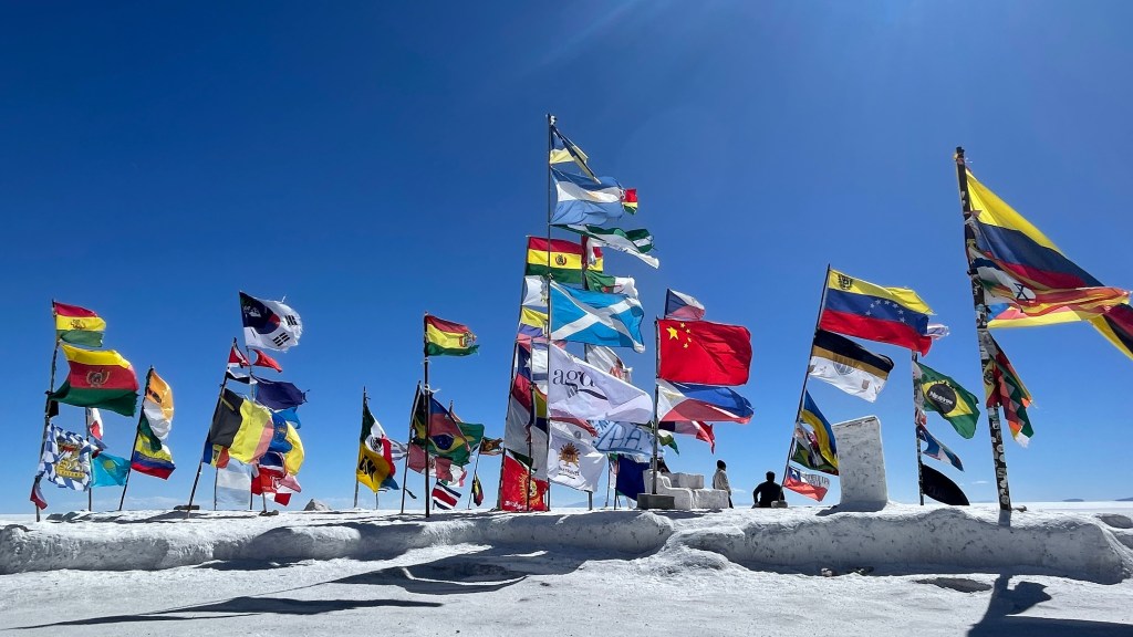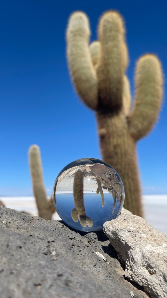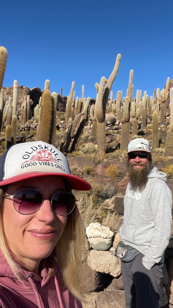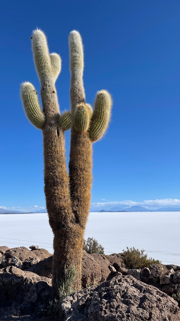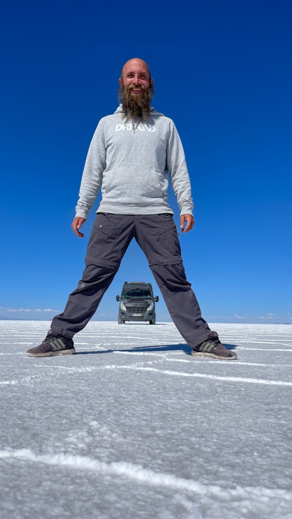 Am Sonntagmorgen starteten wir dann endlich das Abenteuer „Salar de Uyuni“. In „Colchani“ bogen wir auf die größte Salzpfanne der Erde ein welche sich über sagenhafte 10.000 km² erstreckt was einer Länge von 140 km und einer Breite von 110 km entspricht. 😮 Auf Grund der unglaublichen Fernsicht, man sieht eigentlich nur Weiß und Blau, sieht man jedoch stetig die umliegenden Berge welche den Salzsee einrahmen. Anfangs war es etwas gewöhnungsbedürftig so ganz ohne Straßen oder richtige Wege zu navigieren aber nach dem wir uns daran gewöhnt hatten, den dunkleren Fahrspuren (auf Grund des Gummiabriebs) auf der weißen Salzfläche zu folgen ging es eigentlich ganz gut. Als erstes stoppten wir an dem der Rallye Dakar gewidmeten Monument hinter welchem sich auch das bunte Fahnenmeer befindet. 😍 Zuletzt donnerten die Rallyefahrer wohl im Jahr 2016 über das endlose Weiß. Nach dem wir uns noch kurz im Salzhotel umgeschaut hatten, in dem vom Boden über die Wände bis hin zu Tischen und Stühlen wirklich alles aus Salz besteht, machten wir uns auf die Weiterfahrt zur Kakteeninsel. 🏜 Es ging rund weitere 50 km hinaus in die unendliche Weite bis wir an der „Isla Incahuasi“ angelangten welche sich fast exakt in der Mitte des Sees befindet. Nach dem wir die 30 BS p.P. (ca. 4 €) Eintrittsgebühr entrichtet hatten sahen wir uns auf der wunderschönen Insel, welche hauptsächlich aus Lavagestein besteht, um. Wir bestaunten die mitunter bis zu 6 Meter hohen Säulenkakteen die gerade einmal einen Zentimeter pro Jahr an Höhe gewinnen. Die meisten der Kakteen sind somit bereits viele hundert Jahre alt. 😯 Das Panorama, über die Kakteen hinweg auf den Salzsee, war unbeschreiblich schön und wir genossen den Spaziergang über und um die Insel herum sehr. Nach dem all die vielen Touren-Jeeps von dannen gezogen waren hatten wir den Stellplatz dann auch ganz für uns alleine. 🙃 Wir sahen noch ein Weilchen der untergehenden Sonne zu bevor wir vor der aufkommenden Kälte flüchteten und im Van unsere Standheizung anwarfen.