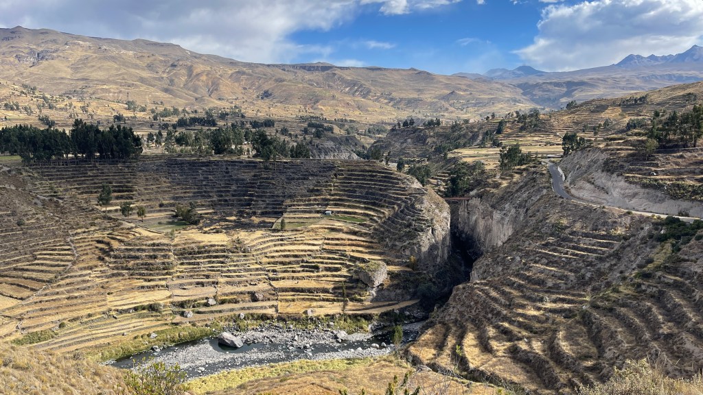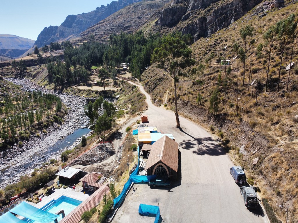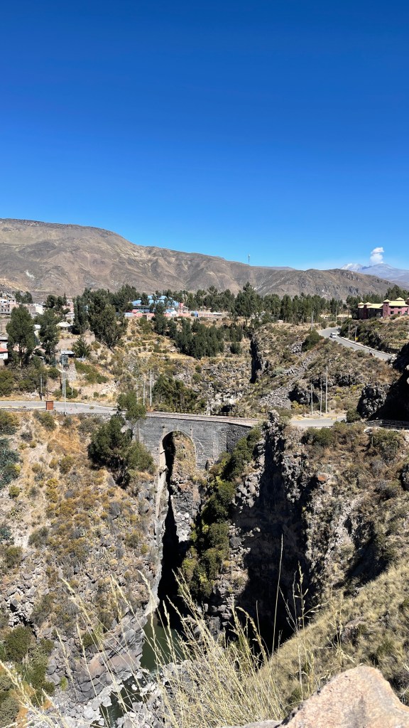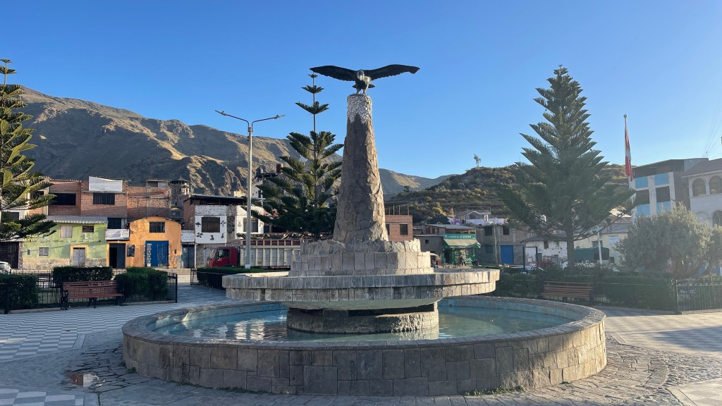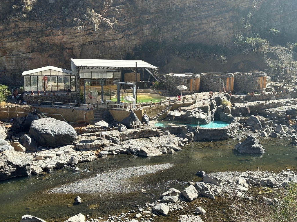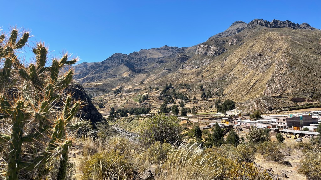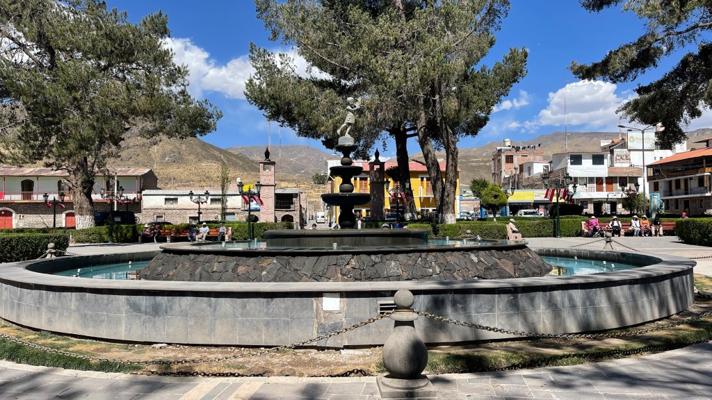 Tags darauf sahen wir uns an der schön gestalteten Plaza von „Chivay“ um in deren Mitte sich ein großer Springbrunnen befand aus dem den ganzen Tag über stimmungsvolle Musik kam. 🎵 Auch die nahegelegenen Markthallen wollten besucht werden und wir fanden dort richtig tolles, exotisches Obst wie z.B. Physalis und Feigen. Das beim Bäcker erworbene Brot ließen wir uns direkt im Van zum Frühstück schmecken bevor wir die Laptops auspackten und uns für einige Stunden an die Arbeit machten. Erstaunlicherweise funktionierte das Internet dort richtig gut, trotz der Lage im zweittiefsten Canyon der Welt. 😀 Am Nachmittag statteten wir dann der Therme, an der wir zuvor übernachtet hatten, einen Besuch ab. Diese befand sich knapp oberhalb des Flussbettes vom „Río Colca“ und bot malerische Ausblicke auf die steilen Felswände, an die sich lediglich ein paar Kakteen krallten. Die drei Becken wurden allesamt von einer natürlichen, heißen Quelle gespeist und waren mit Temperaturen zwischen 36°C und 38°C schon fast zu warm. 😅