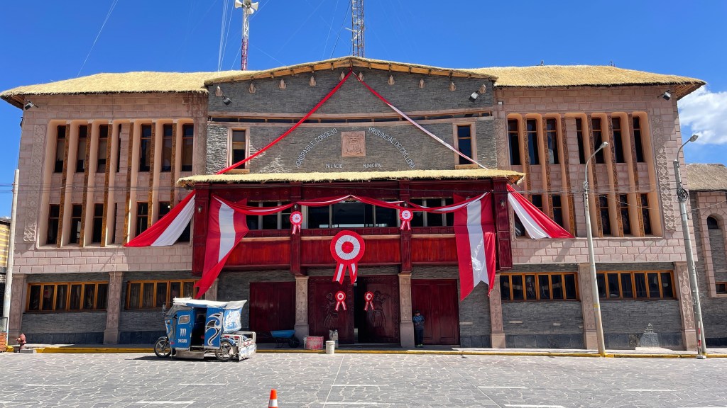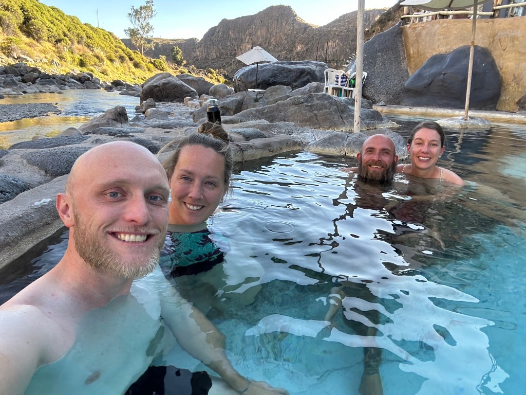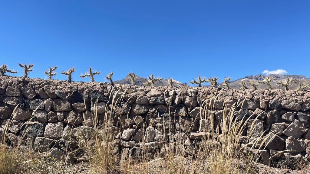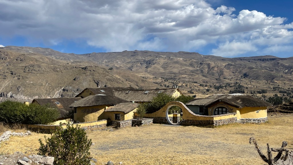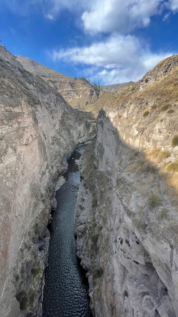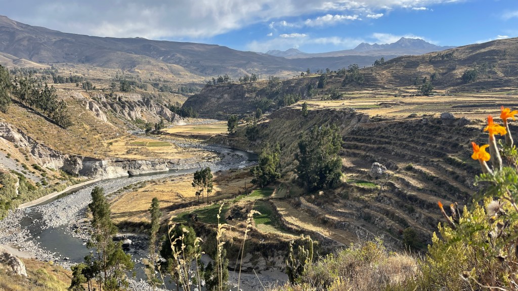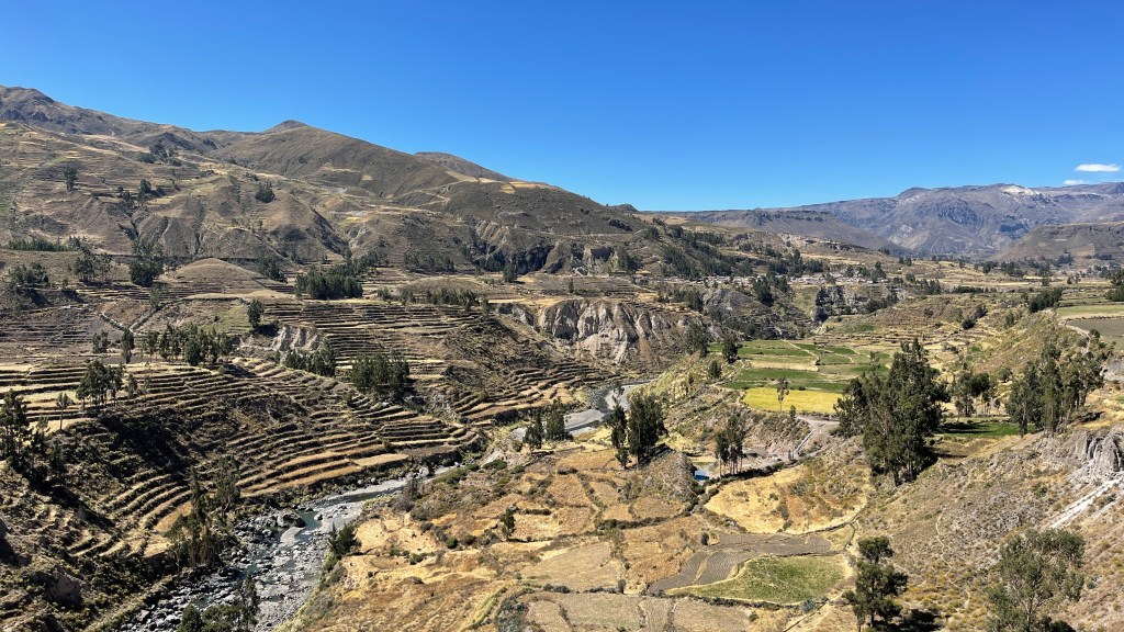 Tags darauf sahen wir uns an der schön gestalteten Plaza von „Chivay“ um in deren Mitte sich ein großer Springbrunnen befand aus dem den ganzen Tag über stimmungsvolle Musik kam. 🎵 Auch die nahegelegenen Markthallen wollten besucht werden und wir fanden dort richtig tolles, exotisches Obst wie z.B. Physalis und Feigen. Das beim Bäcker erworbene Brot ließen wir uns direkt im Van zum Frühstück schmecken bevor wir die Laptops auspackten und uns für einige Stunden an die Arbeit machten. Erstaunlicherweise funktionierte das Internet dort richtig gut, trotz der Lage im zweittiefsten Canyon der Welt. 😀 Am Nachmittag statteten wir dann der Therme, an der wir zuvor übernachtet hatten, einen Besuch ab. Diese befand sich knapp oberhalb des Flussbettes vom „Río Colca“ und bot malerische Ausblicke auf die steilen Felswände, an die sich lediglich ein paar Kakteen krallten. Die drei Becken wurden allesamt von einer natürlichen, heißen Quelle gespeist und waren mit Temperaturen zwischen 36°C und 38°C schon fast zu warm. 😅