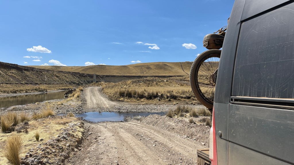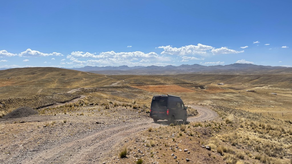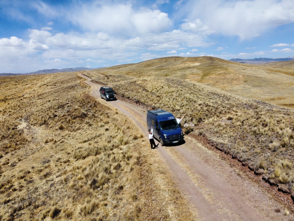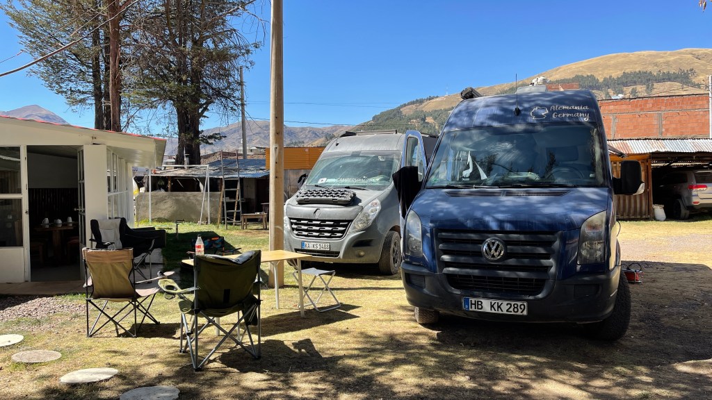 Die Nacht verbrachten wir an dem auf 4.200 Meter Höhe gelegenen Restaurant direkt neben der, glücklicherweise wenig Befahrenen und somit ruhigen, Schnellstraße. Mittlerweile waren wir so gut akklimatisiert als dass wir selbst auf dieser Höhe keine Kopfschmerzen mehr bekamen. 😛 Da unser hinterer Stoßdämpfer, mal wieder, Probleme bereitete bemühte ich mich eine möglichst gute Strecke für die Weiterfahrt herauszusuchen, so dass wir auf möglichst viel Asphalt fahren konnten. Leider erwies sich meine Planung jedoch als fehlerhaft denn die vermeintlich kurze Schotterpiste, welche uns auf die Schnellstraße hätte führen sollen, erwies sich als ziemlich lang. Und noch dazu hatte ich Max und Merle, die eigentlich eine andere Route hätten fahren wollen, zum Mitfahren überredet. 🙈 Zum Glück nahm mir keiner meine Fehlentscheidung krumm! Letzten Endes hatten wir sogar Spaß an der abenteuerlichen Fahrt, während der es immer wieder tiefe Kuhlen sowie einen Bachlauf zu überwinden galt. So kamen wir zwar deutlich später als erwartet, dafür aber wohlbehalten, an unserem Tagesziel an. Wir hatten uns für einen Stellplatz im „Hotel de Turistas“ in „Sicuani“ entschieden. Für gerade einmal 20 Soles (= 5 €) pro Auto durften wir auf dem schönen, weitläufigen Gelände übernachten. Nutzung der sauberen Sanitäranlagen selbstverständlich eingeschlossen. Dort angelangt stießen wir erst einmal auf die just erreichten 1.000 YouTube Follower von Max und Merle an während Simon unter unserem Auto lag und es tatsächlich schaffte, zum dritten Mal unseren hinteren linken Stoßdämpfer zu reparieren. Hungrig und müde nach diesem verrückten, anstrengenden Fahrtag entschieden wir kurzerhand bei einem Lieferdienst Pizza zu ordern und den Abend gemütlich im Hotelgarten ausklingen zu lassen. 🍕🍷