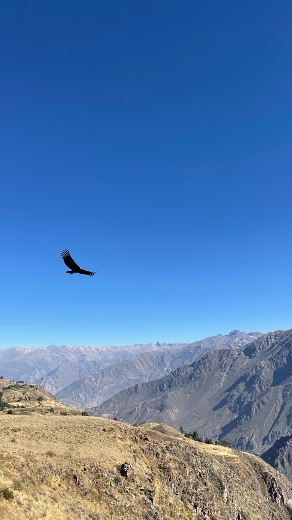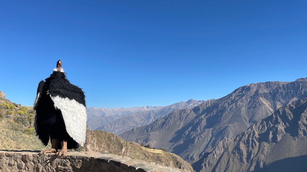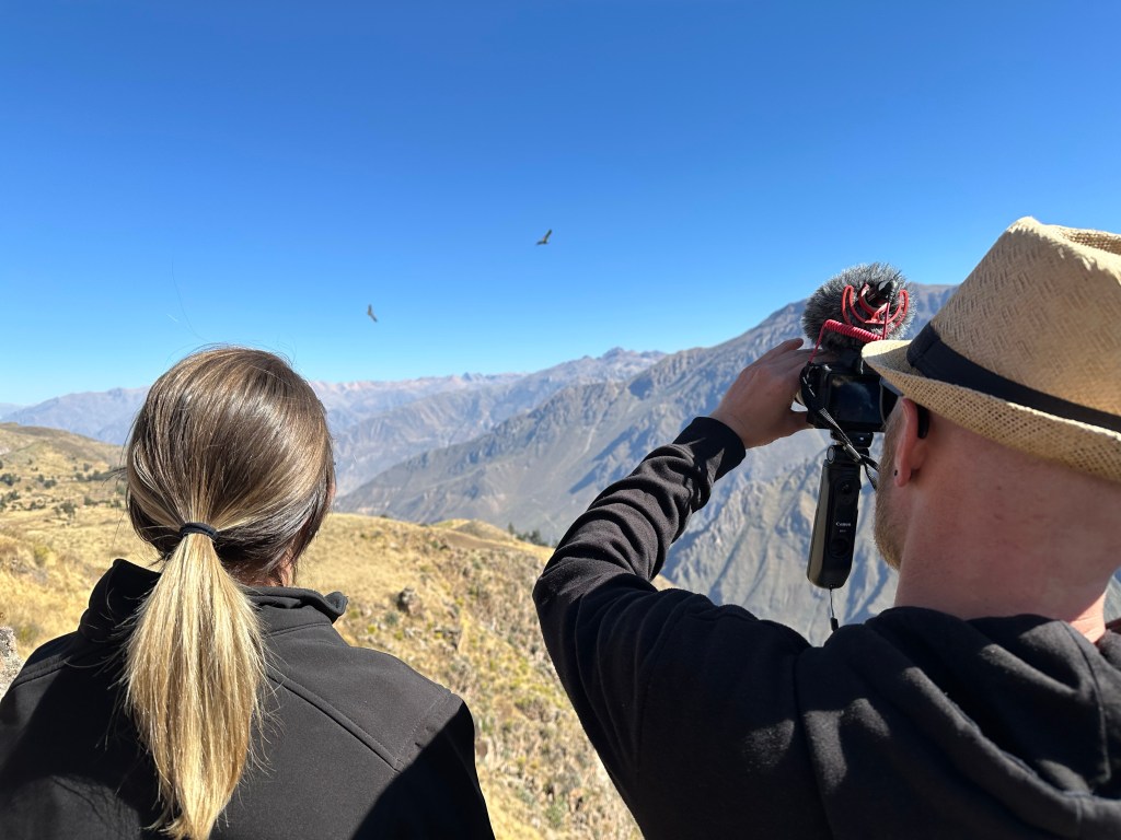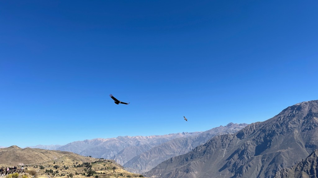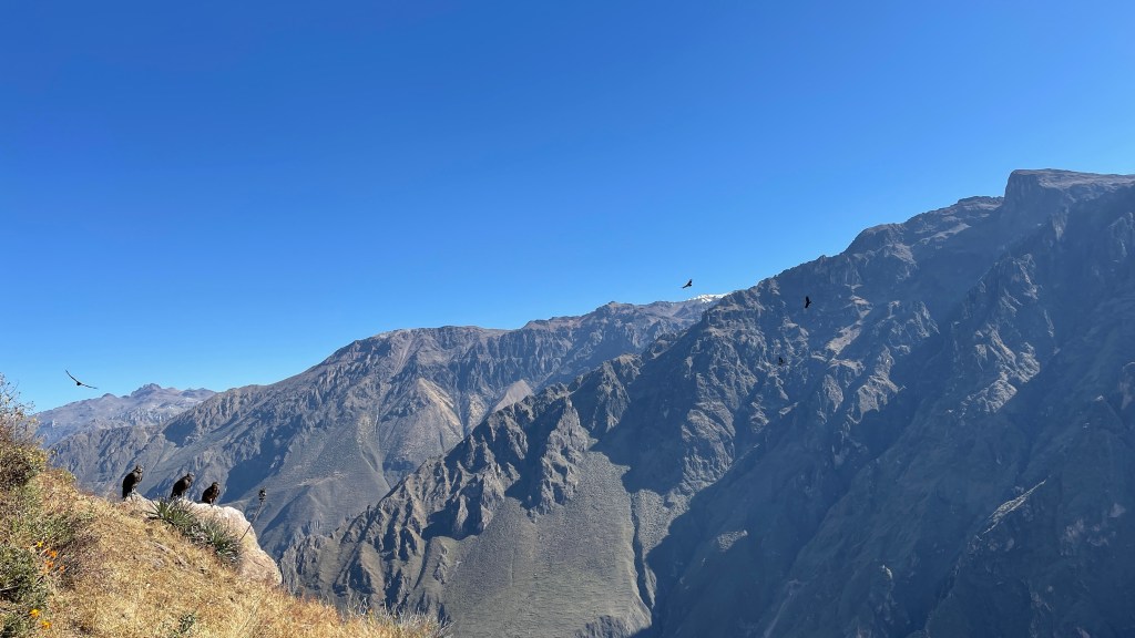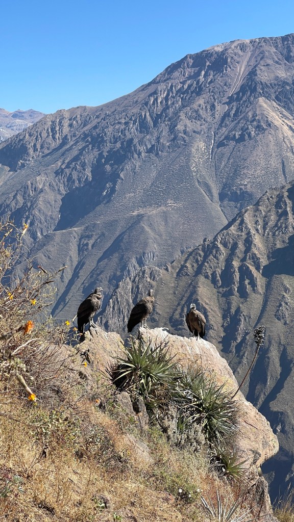 Dank unseres taktisch klugen Stellplatzes hatten wir morgens um 08:30 Uhr nur ein paar wenige Schritte zu laufen, bis wir die erste Aussichtsplattform erreichten, und waren noch dazu vor den Reisebussen dran. 😛 Tatsächlich ließen die majestätischen Kondore nicht lange auf sich warten und begannen kurz darauf, die sich langsam aufwärmende Luft für ihren Aufstieg gen Himmel zu nutzen. Da wir uns fast auf Augenhöhe mit ihren Nestern befanden, hoch oben an den Felswänden, konnten wir die Könige der Lüfte hervorragend aus nächster Nähe beobachten. 😍 Im Sitzen ähneln die Kondore mit ihren nackten Köpfen ein wenig großen Geiern. Aber im Flug erkennt man bei den männlichen Tieren deutlich den weißen Kragen wohingegen das Gefieder der Weibchen eher bräunlich ist. Wir genossen die Flugshow über eine Stunde lang und waren uns einig, dass diese die 40 Soles (= 10 €) Einfahrtsgeld pro Nase in den Canyon definitiv wert waren. Hätten wir jedoch die eigentlichen Kosten in Höhe von 70 Soles (= 17 €) bezahlen müssen dann wäre dies wiederum zu viel gewesen. In Südamerika staffeln sich die Eintrittskosten nämlich häufig nach Herkunft. Peruaner bezahlen für den Canyon beispielsweise nur 20 Soles, Besucher aus anderen Lateinamerikanischen Staaten 40 und „richtige“ Ausländer dann gleich 70 Soles. Man stelle sich das einmal in Europa vor! Was wohl das Antidiskriminierungsgesetz dazu sagen würde?! 🤨 Egal denn wir hatten bei der Einfahrt das Glück, dass die nette Dame an der Kasse augenzwinkernd meinte, Deutschland läge ja wohl eindeutig in Lateinamerika und wir uns so 30 Soles sparen konnten.