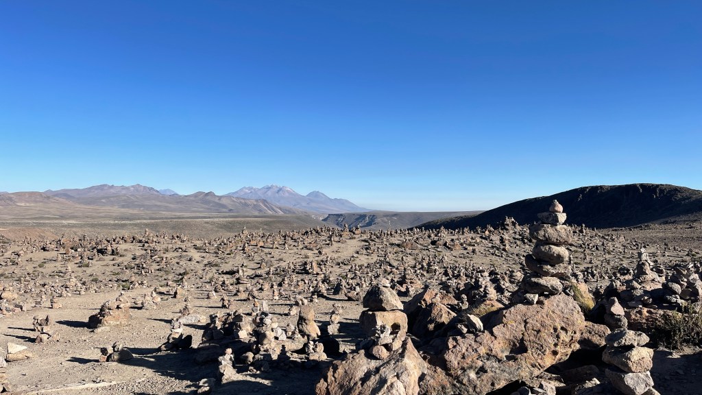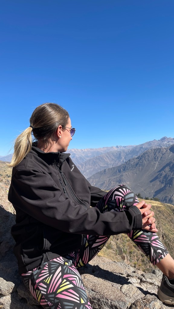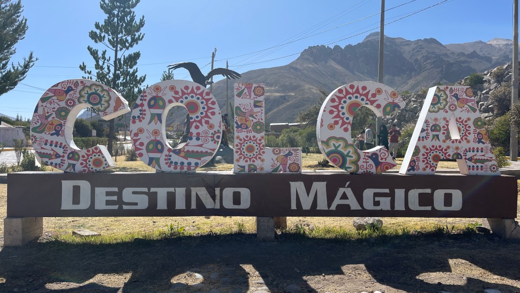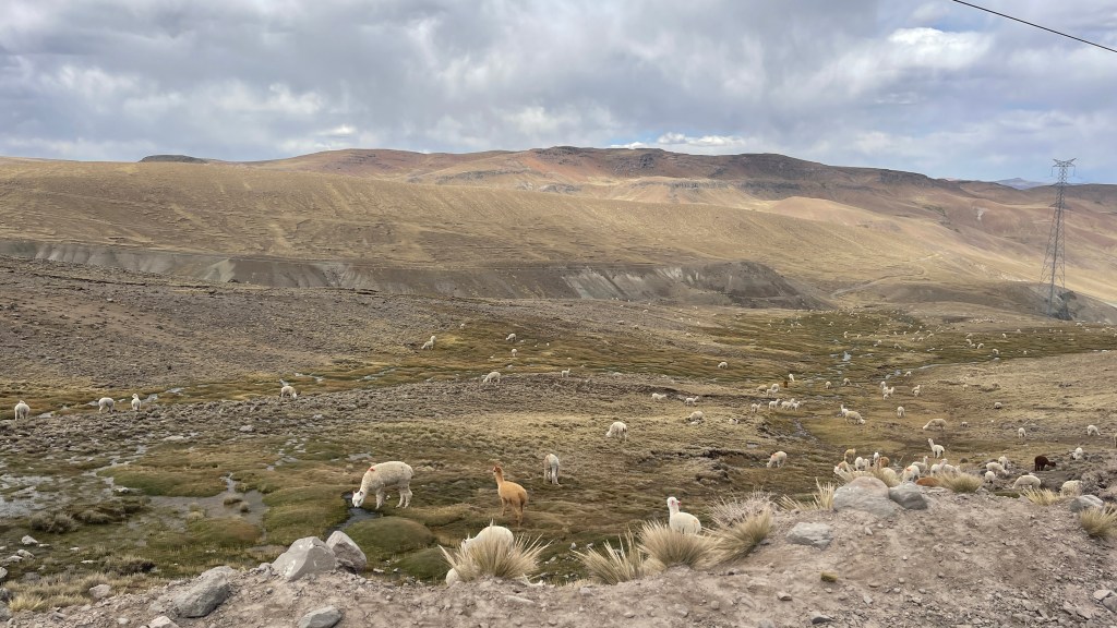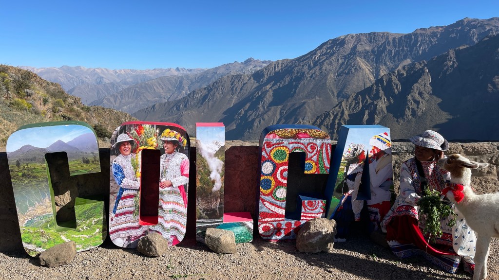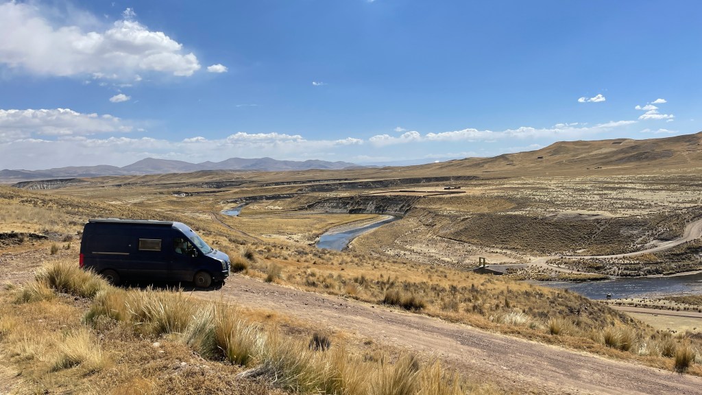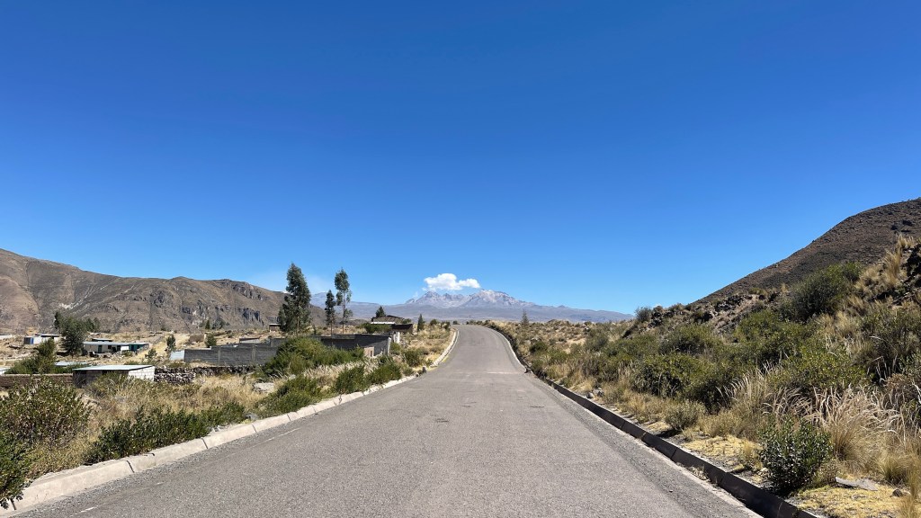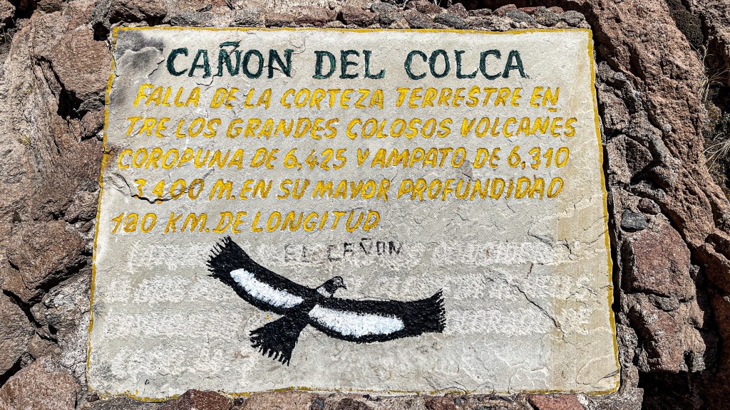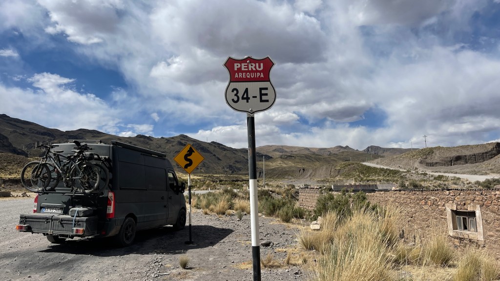 Nach einem leckeren und sehr sättigenden Waffelfrühstück bei „Atomic Waffles“ in „Arequipa“ verließen wir die Stadt nach anderthalb Tagen auch schon wieder. Zum einen, weil wir das kleine, historische Zentrum bereits ausreichend erkundet hatten. Zum anderen, weil für den Folgetag in den größeren Städten Perus wieder Demonstrationen und Straßenblockaden angekündigt waren und wir uns nach Möglichkeit von diesem Geschehen fernhalten wollten. Der Verkehr aus der Stadt hinaus floss nur sehr zäh und so kam uns die kleine Unterbrechung in Form eines Lebensmitteleinkaufs gerade recht. Zu unserem Erstaunen gab es in Peru zahlreiche chilenische Ladenketten, darunter auch den teuren Supermarkt „Metro Cencosud“. Generell fielen uns, im Vergleich zum vorher besuchten Bolivien, so einige Unterschiede auf: Beispielsweise waren die meisten Häuser in Peru verputzt, die Nutztiere auf den Feldern zumeist angeleint und am Straßenrand lag deutlich mehr Müll herum. Außerdem hatte die Leibesfülle der Menschen schlagartig mit Grenzübertritt abgenommen und die Frauen trugen statt Tracht vermehrt enge Jeans. Auch die uns entgegenkommenden LKWs waren nicht nur neuer, sondern häufig auch von gehobenem Fabrikat. Vor allem freute uns aber, dass auf den peruanischen Straßen plötzlich wieder sehr viele Kastenwägen unterwegs waren, darunter auch zahlreiche „Renault Master“. Auf fast 5.000 Metern Höhe stoppten wir an einem Aussichtspunkt oberhalb des „Colca Canyons“, von dem aus wir auf sage und schreibe sechs Vulkane blicken konnten. Darunter befand sich auch der aktive, rauchende „Sabancaya“. 😮 Kurz darauf kamen wir nach vierstündiger Fahrt in dem kleinen Örtchen „Chivay“ an welches sich glücklicherweise in der Talsohle des Canyons befand. Ich hatte schon Sorge, dass wir auf über 4.000 Metern übernachten müssten aber glücklicherweise blieben wir dann doch knapp unter dieser Marke. Gemeinsam mit Max und Merle von @anschnallenabfahrt parkten wir in der Nähe der Thermen von „La Calera“ etwas außerhalb und schliefen dort, trotz der Höhe, super gut. 😴