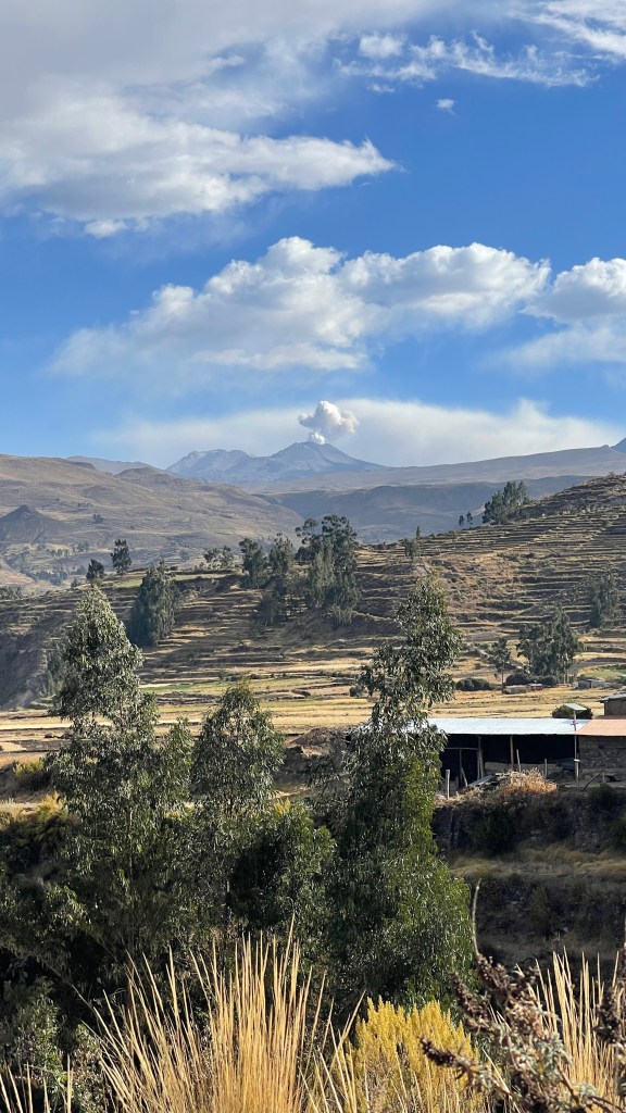 Nach dem bewegungsarmen Vortag wollten wir den Donnerstag mal wieder aktiv gestalten. Gemeinsam mit Max und Merle begaben wir uns auf eine 13 Kilometer lange Wanderung durch das „Colca“ Tal. Wir liefen zwar fast durchgängig auf einer asphaltierten Straße aber da diese so gut wie gar nicht befahren wurde störte uns das herzlich wenig. Stattdessen erfreuten wir uns an der schönen Aussicht auf die Inka Terrassen welche sich durch das gesamte Tal zu ziehen scheinen. Welch Arbeit es einmal gewesen sein muss, diese an all den Steilhängen anzulegen! Auch an niedlichen Alpakas sowie von natürlichem Stacheldraht gesäumten Mauern und Reet gedeckten Häusern kamen wir vorbei. Zuvor hatten wir bereits die Überreste einiger „Chullpas“ (= Grabtürme) erkundet und eine Brücke über die tiefe sowie schmale Schlucht des Canyons überquert. Direkt unter dieser Brücke, etwa in der Mitte der steilen Felswand, befanden sich ebenfalls Gräber der Inka. Bis heute weiß niemand, wie sie diese dort anbringen konnten. 😯 Das absolute Highlight war jedoch neuerdings der Vulkan „Sabancaya“ der abermals eine hohe Aschewolke in die Luft beförderte. In „Yanque“ orderten wir dann gemeinsam ein Taxi, welches uns für ein paar „Soles“ zurück nach „Chivay“ brachte, wo wir uns nach der Anstrengung allesamt erst einmal einen süßen „Oreo Frappé“ gönnten. Und da wir auf Kochen so rein gar keine Lust mehr hatten kehrten wir am Abend in einem bei Einheimischen beliebten Lokal ein, wo wir für schlappe 2 € p.P. ein leckeres Menü in Form einer Hühner-Nudel-Suppe sowie gebratener Forelle mit Reis und Salat orderten. 😋