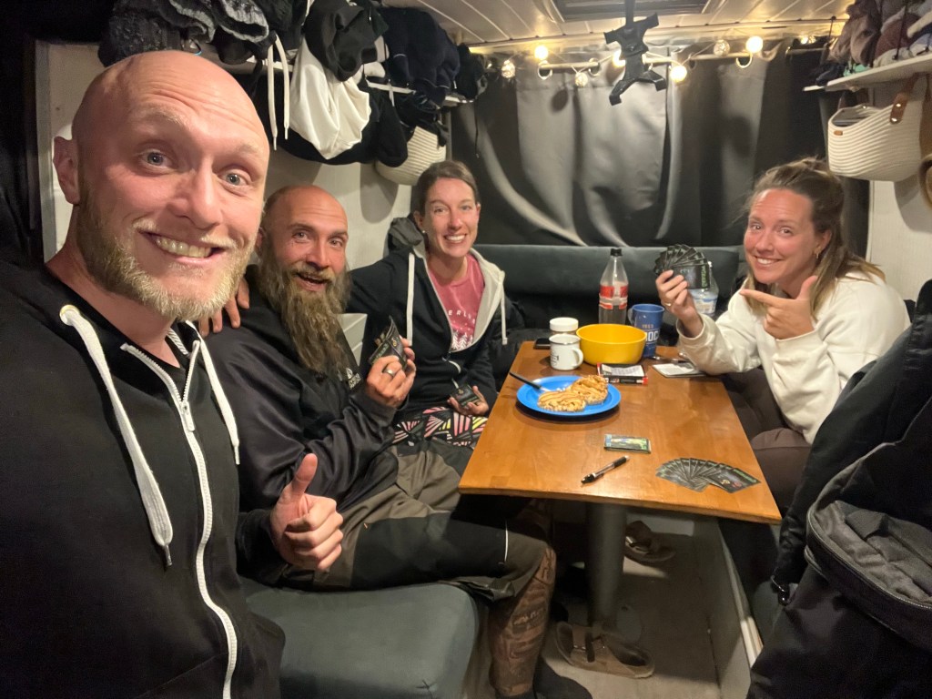 Sonntags traten wir gemeinsam die Weiterreise in Richtung der „Rainbow Mountains“ an. Wir hielten noch einmal kurz an der Plaza in „Chivay“, um uns im Ort noch mit Trinkwasser und ein paar Lebensmitteln einzudecken. Auch das Frühstück wollte vor dem Fahrtag natürlich noch genossen werden und so setzten wir uns mit unseren Müsli Schalen auf eine der vielen Parkbänke. Wir hatten mit Max und Merle einen Übernachtungsspot vereinbart welcher in etwa auf der Hälfte der Strecke lag. So konnte jeder sein eigenes Tempo fahren und als wir dort 130 km und drei Stunden später ankamen waren die beiden Bremer schon vor Ort. 😃 Da sie bereits im Begriff waren, das frühe Abendessen vorzubereiten, und wir ebenfalls hungrig waren luden sie uns netterweise zu sich in den Van ein. 💛 Der Tisch war bereits mit Zutatenschälchen übersäht und, ähnlich wie beim Raclette, konnte so jeder die Füllung für seinen Wrap selbst wählen. 🥙 Nach dem leckeren Essen packten die beiden noch ein für uns neues Kartenspiel aus und nach der zweiten Runde hatte dann auch ich „Wizard“ verstanden. 😅 Das Spiel, bei dem man mitunter ganz schön taktieren muss, machte richtig großen Spaß und falls ihr das tolle Gesellschaftsspiel auch gerne ausprobieren möchtet dann könnt ihr dieses unter nachfolgendem Link bei Amazon erwerben: Link zu Amazon 10% des Kaufpreises kommen dabei unserer Reisekasse zu Gute und somit habt ihr nicht nur bald kurzweilige Spieleabende, sondern gleichzeitig auch uns noch etwas Gutes getan. 😉