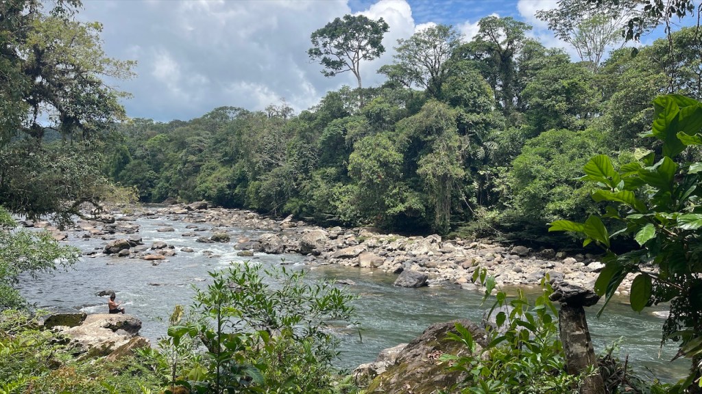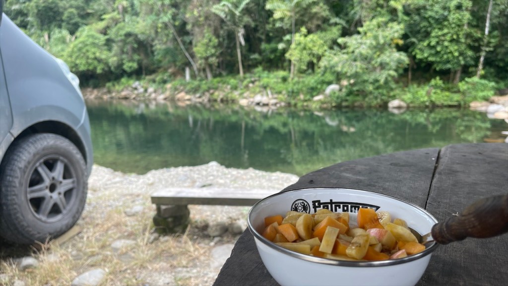 In den tropischen Gefilden, in welchen wir uns befanden, regnete es tatsächlich immer wieder mal kurz. Der Regen bringt hier jedoch keine Abkühlung sondern führt nur noch zu mehr Schwüle welche wiederum zu weiteren Regenschauern führt. So wie es sich für einen ordentlichen Regenwald nun einmal gehört! 😅 Die Yogaeinheit fiel aufgrund dessen aus aber da mich seit dem Vorabend sowieso Unterleibsschmerzen plagten war das möglicherweise auch besser so. Bevor wir uns auf die Weiterreise begaben frühstückten wir noch im Van und führten einige Telefonate. Seit langem auch mal wieder mit allen engen Freunden auf einmal was richtig schön war. 😍 80 Kilometer später erreichten wir am frühen Abend das „Balneario Indilliama“. Das Naturbad liegt direkt am „Río Puyo“ welcher hier zum Baden zu einem kleinen Becken aufgestaut wird. Zu diesem gehört neben einem großen Restaurant (mit sehr lauter Musik) auch ein Sanitärbereich mit Toiletten und kalten Duschen. Ähnlich wie in dem Bad in „Bonito“ in Brasilien gab es hier ebenfalls die großen Strohsonnenschirme inklusive Tisch und Stühlen. Wir parkten unseren Van direkt neben einem dieser Schirme und kamen schnell mit den zwei ecuadorianischen Familien am Nachbartisch ins Gespräch nachdem sie uns netterweise eine Dose kaltes Bier sowie Banane und Fleisch vom Grill offerierten. Welch nette Geste! Wir fühlten uns unweigerlich an die vielen, schönen Begegnungen in Argentinien zurückerinnert und zum ersten Mal konnte ich eine richtig lange sowie sehr flüssige Unterhaltung auf Spanisch führen. 😃 Zum einen, weil das Spanisch in Lateinamerika besser wird je weiter nördlich man kommt aber auch, weil nach über einem Jahr Reise meine Kenntnisse ganz passabel sind. Als unsere Bekanntschaft sich verabschiedet hatte nutzten wir noch die letzte Glut auf dem von ihnen verwendeten Grill, um darauf unser restliches Ofengemüse zu wärmen sowie zwei unserer Chorizos zu grillen. 🔥