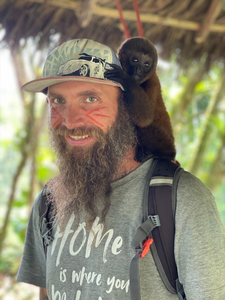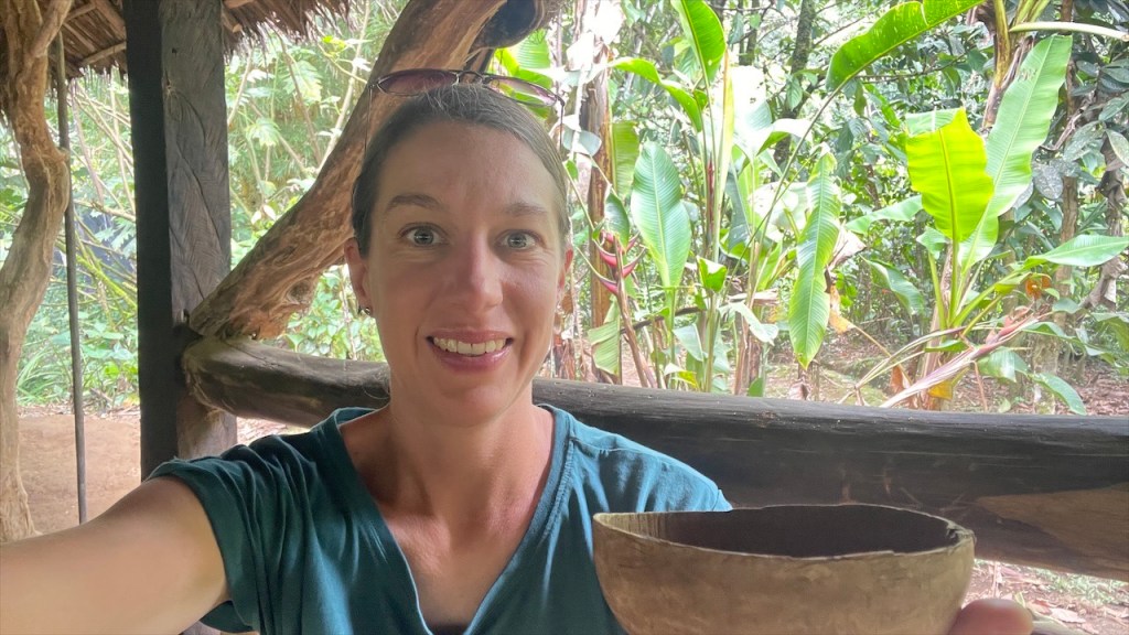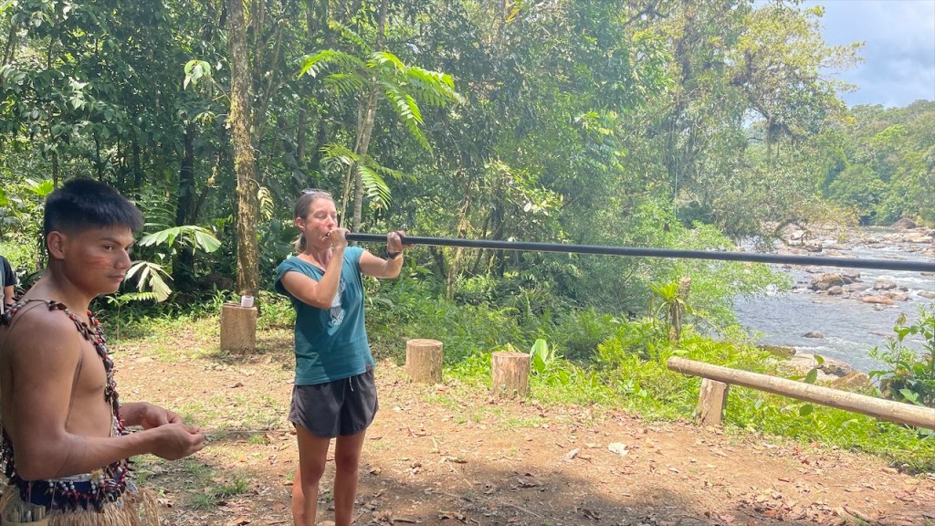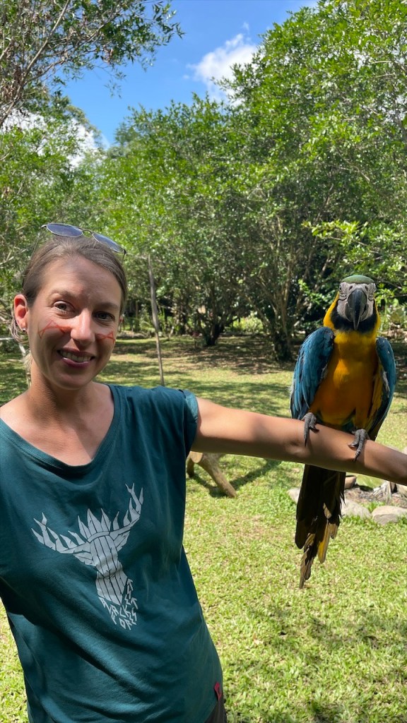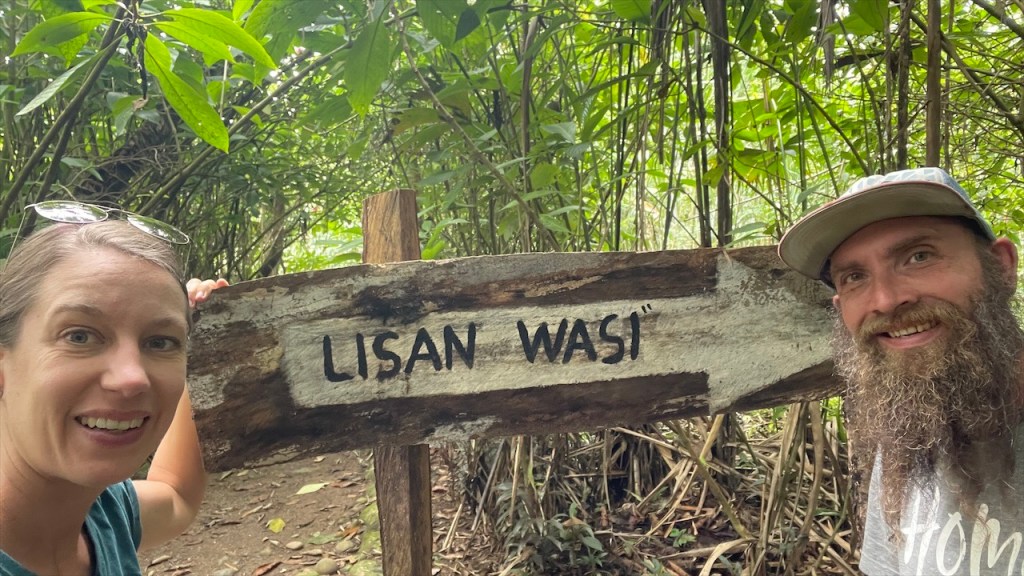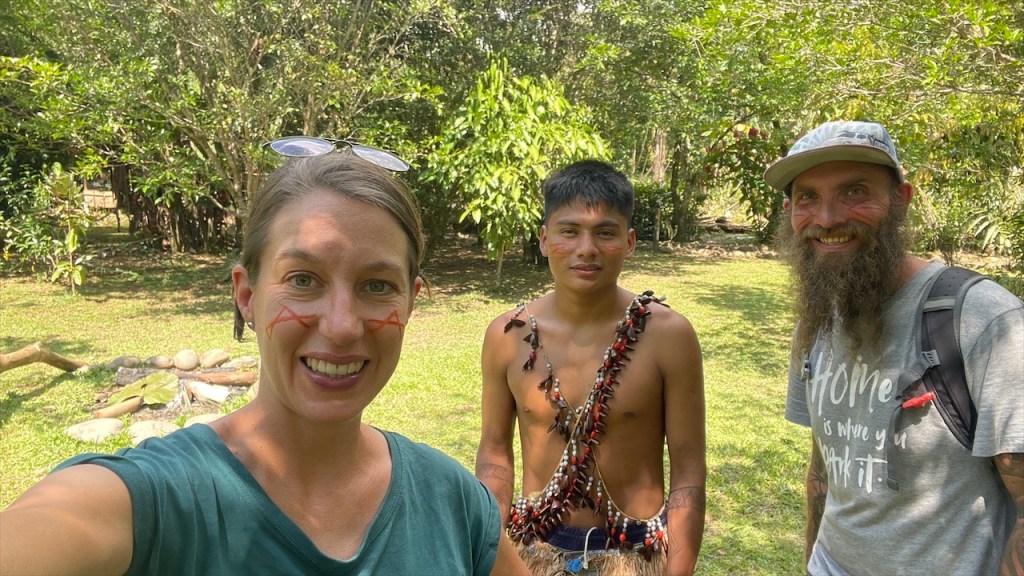 Sonntagvormittags war auf dem Gelände kaum etwas los so dass wir in aller Seelenruhe im Freien mit Blick aufs Wasser und den dahinterliegenden Urwald frühstücken konnten. Selbst das WLAN-Passwort des Restaurants wurde uns, wie alles andere, kostenfrei zur Verfügung gestellt so dass wir sogar noch ein paar Nachrichten auf den Smartphones abrufen konnten. Gegen Mittag begaben wir uns dann zu Fuß, zusammen mit einer fünfköpfigen Familie aus Chile welche ebenfalls in einem Wohnmobil unterwegs war, zur nahegelegenen indigenen Gemeinde „Lisan Wasi“. Nach dem wir die lange Hängebrücke überquert und ca. einen Kilometer durch den Regenwald gelaufen waren erreichten wir das kleine, abgeschiedene Paradies. In der seit acht Jahren existierenden Kommune leben sechs Familien, die sich dem nachhaltigen Tourismus verschrieben haben. Hier kann man einige Tage in schönen Bambushütten mitten in der Natur verbringen oder, so wie wir, auf eine Stippvisite vorbei schauen. Der junge „Ariel“ empfing uns mit einer Schale Kräutertee und nach dem er uns einiges über den Ort erzählt hatte wurden unsere Gesichter Stammestypisch bemalt. 😅 Anschließend führte er uns über das hübsche Gelände, erläuterte uns zahlreiche Heilpflanzen, zeigte uns die Kunst des Pfeilgiftschießens welches auch wir ausprobieren durften. Es ist gar nicht so schwer wie man vielleicht denkt und mit ein wenig Übung hat man den Dreh sicher schnell raus. Auch eine kleine Tarzan Schaukel durften wir nutzen bevor er und „Sophia“ uns noch ein traditionelles Lied vorsangen. Unübertroffenes Highlight war jedoch das kleine Affen Mädchen „Lisa“. Das kleine Äffchen klammerte sich bereitwillig an einen und krallte sich mit Vorlieben an den Haaren fest. 🥰 Wobei ich es tatsächlich fragwürdig finde ein Tier als Magnet für Touristen zu verwenden aber funktionieren tut es ohne Zweifel. Wer kann schon einem solch süßen Tierbaby widerstehen! Auch zwei zahme, blau gelbe „Macau“ leben auf dem Gelände und posieren ganz selbstverständlich für Fotos mit einem… Die Einwohner bauen nebenbei auch Nutzpflanzen an, darunter Kakao aus welchem sie sehr feine, völlig naturbelassene Schokolade herstellen. Nachdem wir diese verkostet und als gut befunden hatten kauften wir für 2$ eine Tafel und auch die 5$ pro Kopf für die etwa eineinhalbstündige Tour fanden wir sehr fair. 👍 Wieder am „Balneario“ angelangt gönnten wir uns im Restaurant ein erfrischendes Eis denn seit geraumer Zeit ließ sich auch die Sonne blicken welche die Temperatur gefühlt um ein Vielfaches in die Höhe schnellen ließ. Entsprechend viele, lokale Ausflügler hatten sich an diesem Sonntag mittlerweile für ein erfrischendes Bad eingefunden aber auch der Regen ließ nicht lange auf sich warten. Diesmal regnete es nicht nur länger sondern auch heftiger was tatsächlich ein wenig Abkühlung mit sich brachte. Während Simon nach dem Schauer einen Sprung ins Wasser wagte wusch ich meine Haare unter der Dusche. Das Wasser war zwar wie schon gesagt kalt aber bei den Außentemperaturen war dies nicht weiter tragisch. Und am Spätnachmittag schenkte man uns erneut diverse Leckereien vom Grill welche wir uns später am Abend neuerdings auf der restlichen Glut wärmen konnten. 🙃