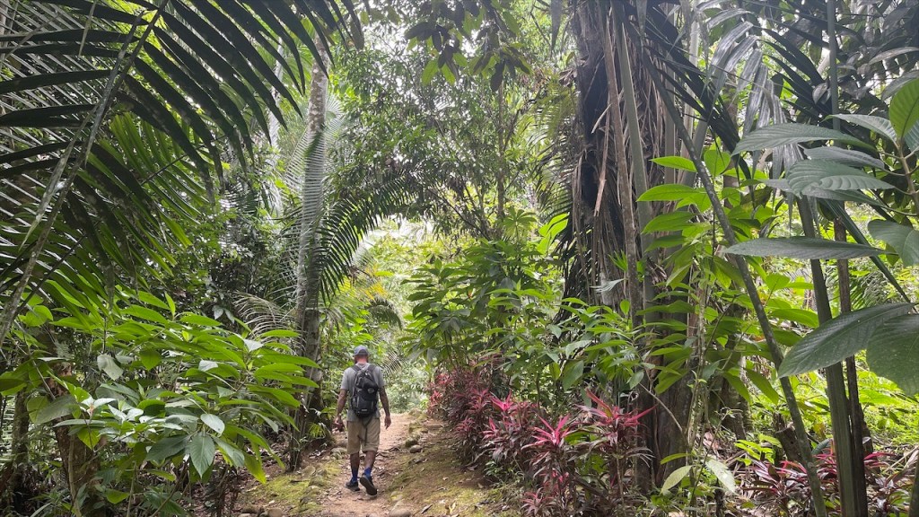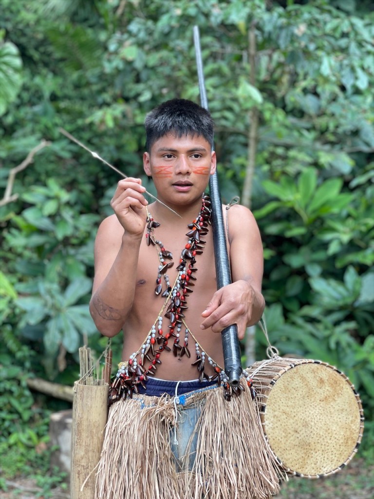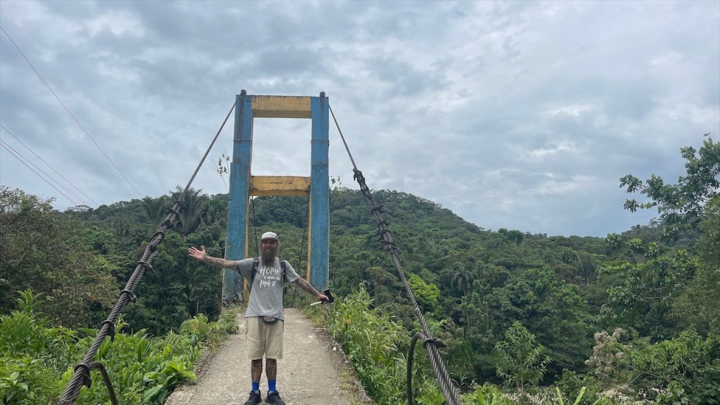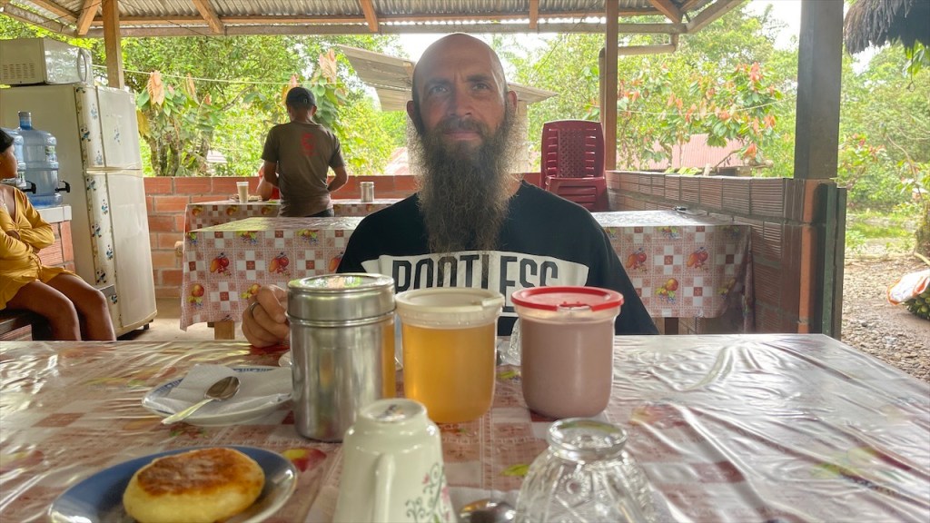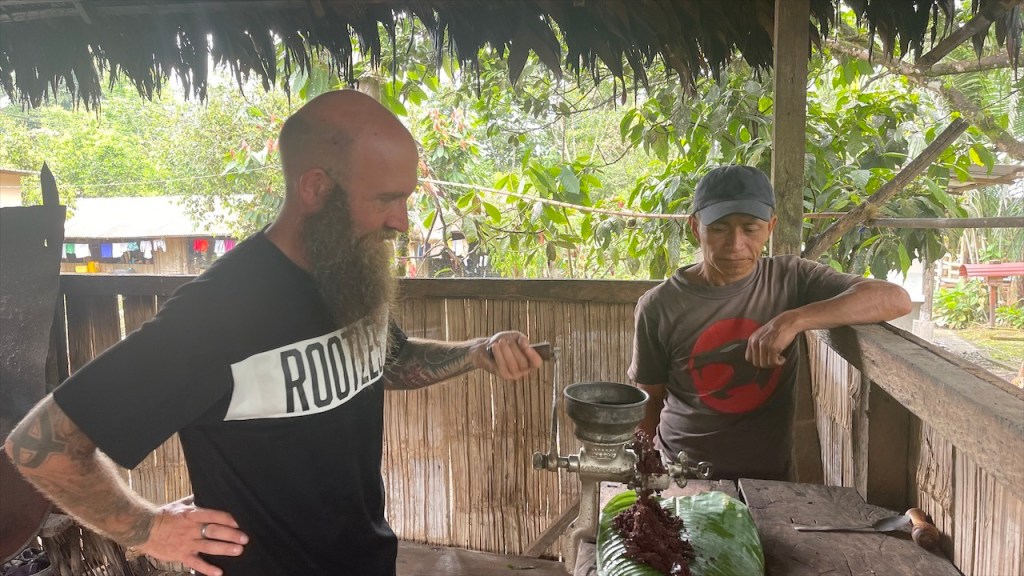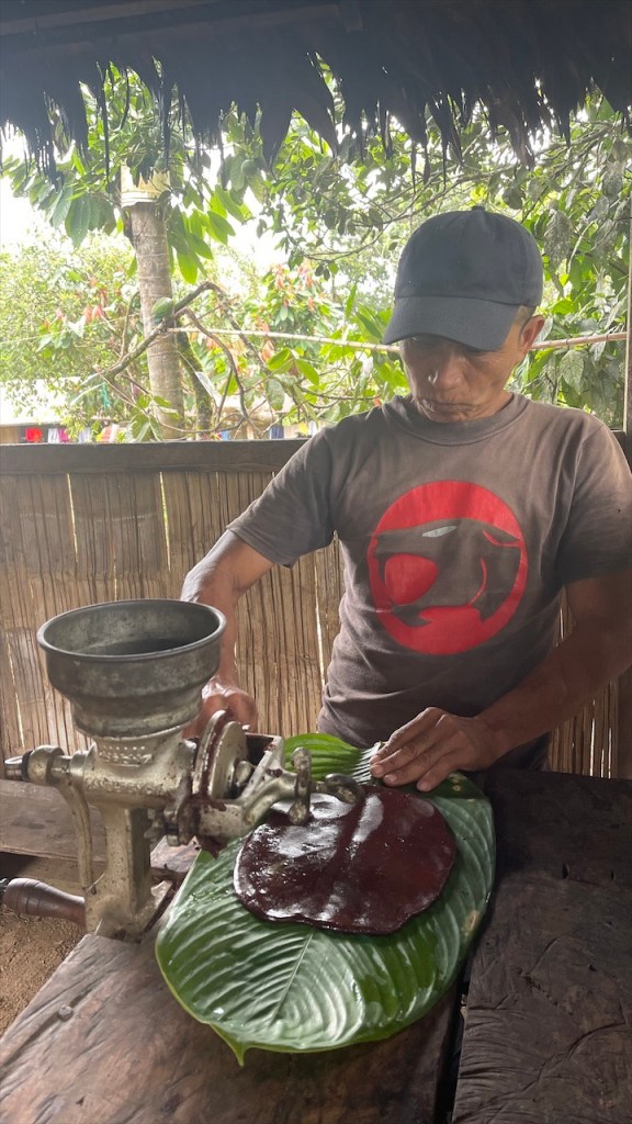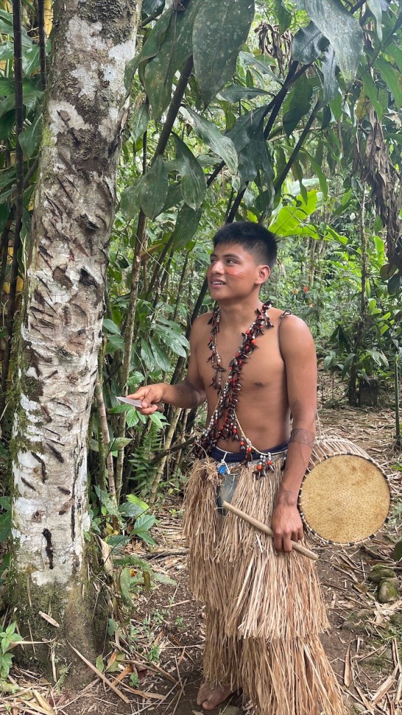 Sonntagvormittags war auf dem Gelände kaum etwas los so dass wir in aller Seelenruhe im Freien mit Blick aufs Wasser und den dahinterliegenden Urwald frühstücken konnten. Selbst das WLAN-Passwort des Restaurants wurde uns, wie alles andere, kostenfrei zur Verfügung gestellt so dass wir sogar noch ein paar Nachrichten auf den Smartphones abrufen konnten. Gegen Mittag begaben wir uns dann zu Fuß, zusammen mit einer fünfköpfigen Familie aus Chile welche ebenfalls in einem Wohnmobil unterwegs war, zur nahegelegenen indigenen Gemeinde „Lisan Wasi“. Nach dem wir die lange Hängebrücke überquert und ca. einen Kilometer durch den Regenwald gelaufen waren erreichten wir das kleine, abgeschiedene Paradies. In der seit acht Jahren existierenden Kommune leben sechs Familien, die sich dem nachhaltigen Tourismus verschrieben haben. Hier kann man einige Tage in schönen Bambushütten mitten in der Natur verbringen oder, so wie wir, auf eine Stippvisite vorbei schauen. Der junge „Ariel“ empfing uns mit einer Schale Kräutertee und nach dem er uns einiges über den Ort erzählt hatte wurden unsere Gesichter Stammestypisch bemalt. 😅 Anschließend führte er uns über das hübsche Gelände, erläuterte uns zahlreiche Heilpflanzen, zeigte uns die Kunst des Pfeilgiftschießens welches auch wir ausprobieren durften. Es ist gar nicht so schwer wie man vielleicht denkt und mit ein wenig Übung hat man den Dreh sicher schnell raus. Auch eine kleine Tarzan Schaukel durften wir nutzen bevor er und „Sophia“ uns noch ein traditionelles Lied vorsangen. Unübertroffenes Highlight war jedoch das kleine Affen Mädchen „Lisa“. Das kleine Äffchen klammerte sich bereitwillig an einen und krallte sich mit Vorlieben an den Haaren fest. 🥰 Wobei ich es tatsächlich fragwürdig finde ein Tier als Magnet für Touristen zu verwenden aber funktionieren tut es ohne Zweifel. Wer kann schon einem solch süßen Tierbaby widerstehen! Auch zwei zahme, blau gelbe „Macau“ leben auf dem Gelände und posieren ganz selbstverständlich für Fotos mit einem… Die Einwohner bauen nebenbei auch Nutzpflanzen an, darunter Kakao aus welchem sie sehr feine, völlig naturbelassene Schokolade herstellen. Nachdem wir diese verkostet und als gut befunden hatten kauften wir für 2$ eine Tafel und auch die 5$ pro Kopf für die etwa eineinhalbstündige Tour fanden wir sehr fair. 👍 Wieder am „Balneario“ angelangt gönnten wir uns im Restaurant ein erfrischendes Eis denn seit geraumer Zeit ließ sich auch die Sonne blicken welche die Temperatur gefühlt um ein Vielfaches in die Höhe schnellen ließ. Entsprechend viele, lokale Ausflügler hatten sich an diesem Sonntag mittlerweile für ein erfrischendes Bad eingefunden aber auch der Regen ließ nicht lange auf sich warten. Diesmal regnete es nicht nur länger sondern auch heftiger was tatsächlich ein wenig Abkühlung mit sich brachte. Während Simon nach dem Schauer einen Sprung ins Wasser wagte wusch ich meine Haare unter der Dusche. Das Wasser war zwar wie schon gesagt kalt aber bei den Außentemperaturen war dies nicht weiter tragisch. Und am Spätnachmittag schenkte man uns erneut diverse Leckereien vom Grill welche wir uns später am Abend neuerdings auf der restlichen Glut wärmen konnten. 🙃