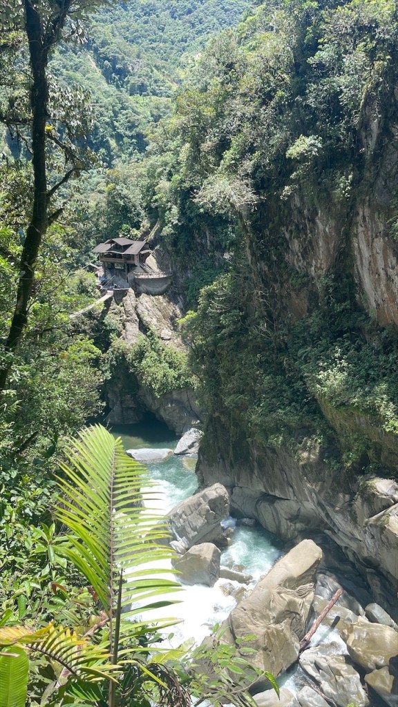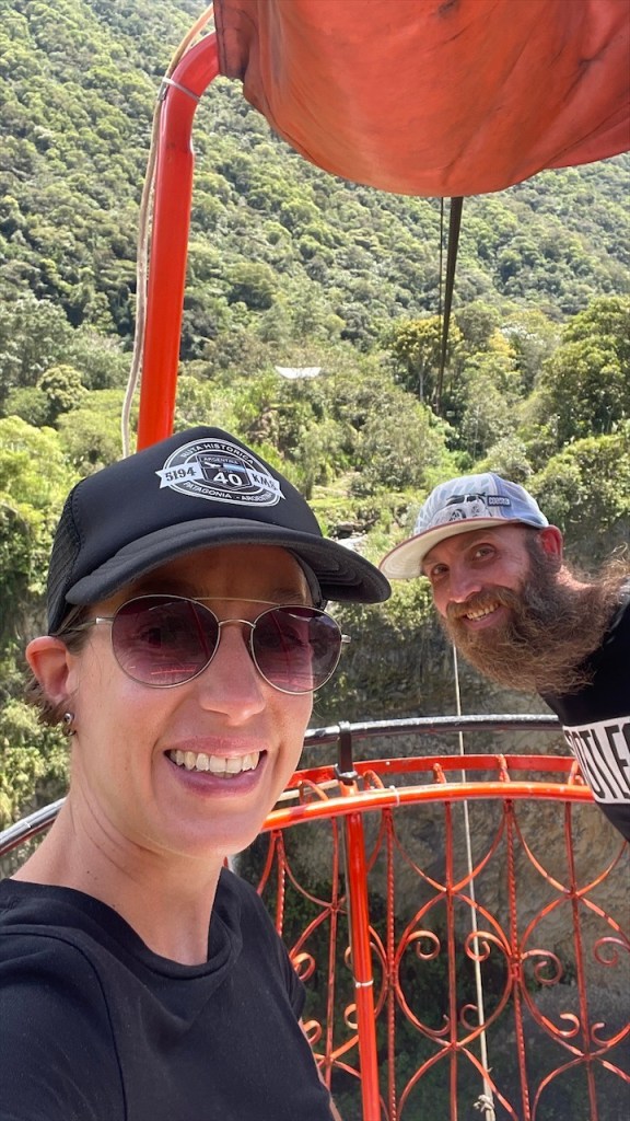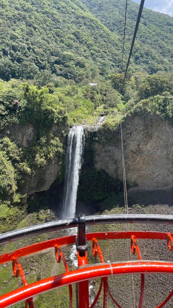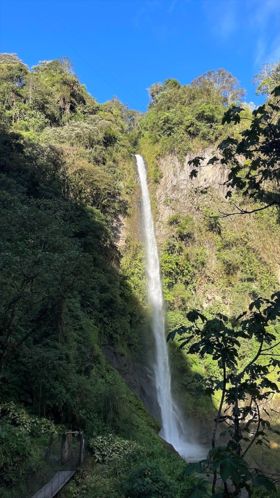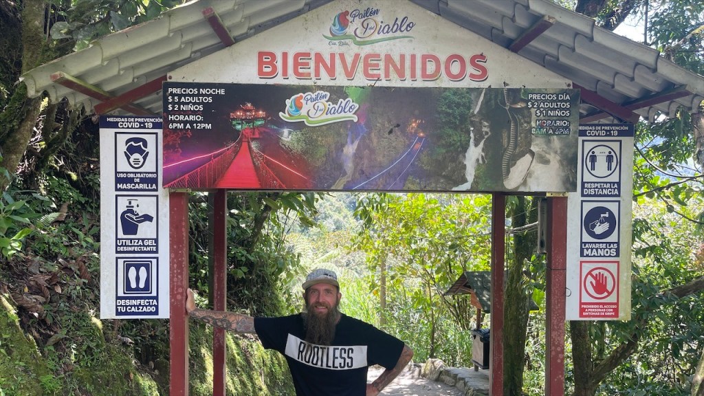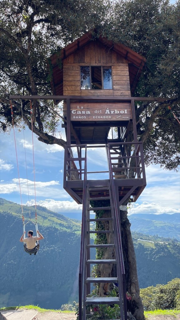 Wir schliefen richtig gut auf dem Wanderparkplatz und hatten das Gefühl, dass die Temperaturen etwas angenehmer da weniger schwül als zuvor im Amazonasbecken waren. Am nächsten Tag lachte sogar seit längerem mal wieder die Sonne von einem azurblauen Himmel. 😎 Nach dem Frühstück verließen wir den angenehmen Stellplatz um nur wenige Kilometer weiter, am Eingang zu einem der berühmtesten Wasserfälle rund um Baños, bereits wieder anzuhalten. Der Weg hinunter zum „Pailón del Diablo“ war bestens angelegt und so erreichten wir kurz darauf das Tickethäuschen. Nach dem wir pro Person 2 USD entrichtet hatten bogen wir um die Ecke von wo aus das Donnern des 80 Meter hohen Wasserfalls bereits deutlich hörbar war. Simon Adlerauge entdeckte auf dem Weg dorthin sogar noch eine hervorragend als Ast getarnte Stabschrecke. 😃 Wir näherten uns den Wassermassen und die Gischt erzeugte einen schönen Regenbogen. Auf allen Vieren krabbelten wir durch eine schmale Öffnung in der Felswand und plötzlich standen wir direkt vor dem gewaltigen Vorhang aus Wasser. 😮 Nach kurzer Überlegung entschloss ich mich, als Erste hinter diesem durchzugehen. Wohl wissend, dass ich dabei sicherlich nass werden würde. Da wir jedoch auf der anderen Seite Leute sehen konnten schlussfolgerten wir, dass sich der Weg fortsetzen und wir an einem anderen Ausgang herauskommen würden. Dies erwies sich allerdings als Trugschluss! Kaum hatte ich mich hinter dem Wasserfall durchgezwängt stand ich vor einer Wand aus Fels – es gab kein Weiterkommen! Blitzschnell machte ich kehrt und schaffte es, nur leicht nass wieder zu Simon zurückzukehren. 😅 Somit liefen wir denselben Weg, den wir gekommen waren, wieder zurück zum Auto. Der nächste Stopp war nur ein Katzensprung entfernt, natürlich wieder an einem Wasserfall! Das Highlight war nicht die Kaskade selbst sondern der Weg dorthin. Diesmal ging es mit einem „cable car“ in Form eines großen Korbes aus rotem Stahl hinüber auf die andere Seite zur „Cascada Manto de la Novia“. Am Stahlseil hängend überquerten wir die Schlucht und flogen über den unten im Canyon fließenden Fluss hinweg auf den Wasserfall zu. Wie cool war das denn bitte! Fast ein bisschen wie Zip Line. 🙃 Auf der anderen Seite angelangt gab es nicht wirklich viel zu sehen so dass wir nach einem kurzen Abstecher an den Fluss auf gleichem Wege zum Parkplatz zurückschwebten. Kurz vorm Ortseingang nach Baños bogen wir links ab und fuhren fast 800 Höhenmeter hinauf zur „Casa del Arbol“. Dort gab es erst einmal einen kleinen Mittagssnack um uns gut für die weiteren Abenteuer des Tages zu rüsten. Für den grandiosen Park verlangte man nur einen Dollar Eintritt und dafür bekam man so einiges geboten! Vor unseren Augen breitete sich ein wunderschön angelegter Garten mit herrlichen Blumen aus. Die Aussicht auf die grünen Berge sowie hinunter ins Tal setzten dem Ganzen die Krone auf. Und als wäre das nicht schon schön genug gab es noch einige coole Schaukeln, mit denen wir weit über die Bergkanten hinaus schwingen konnten. Auch das namensgebende Baumhaus war ein Schmuckstück und an den beiden Seilrutschen hatten wir vor Verlassen der Anlage noch unseren Spaß. 🤩 Auf der Rückfahrt hinab ins Tal breitete sich dann noch ein richtig schöner Regenbogen vor uns aus. Viel besser kann ein Tag wohl kaum sein. 💛 Am Ziel angelangt fanden wir, unweit vom Zentrum, einen geeigneten Stellplatz vor einem der vielen Thermalbäder in Baños. Vermutlich verhalfen diese dem Ort auch zu seinem Namen. 😉