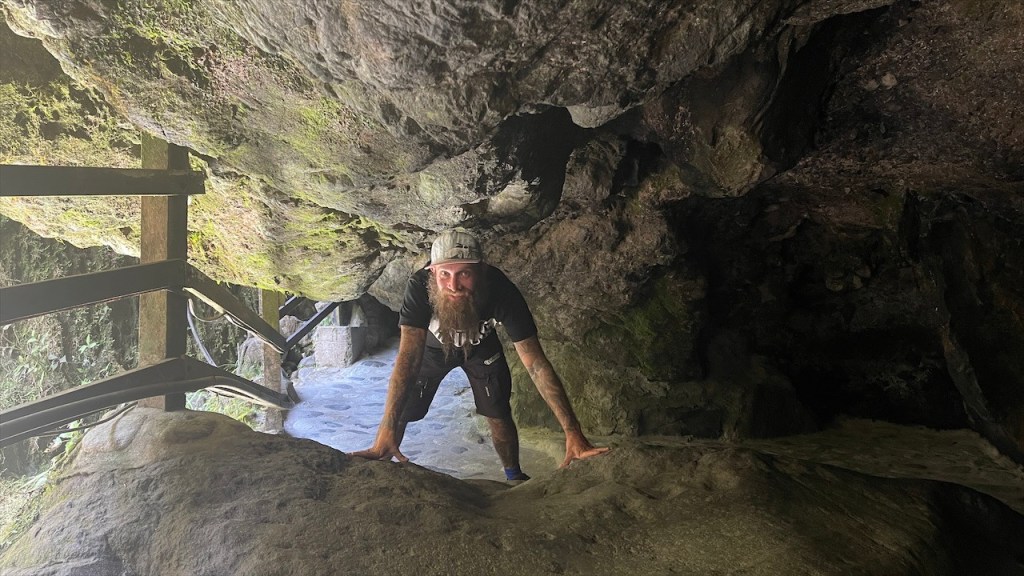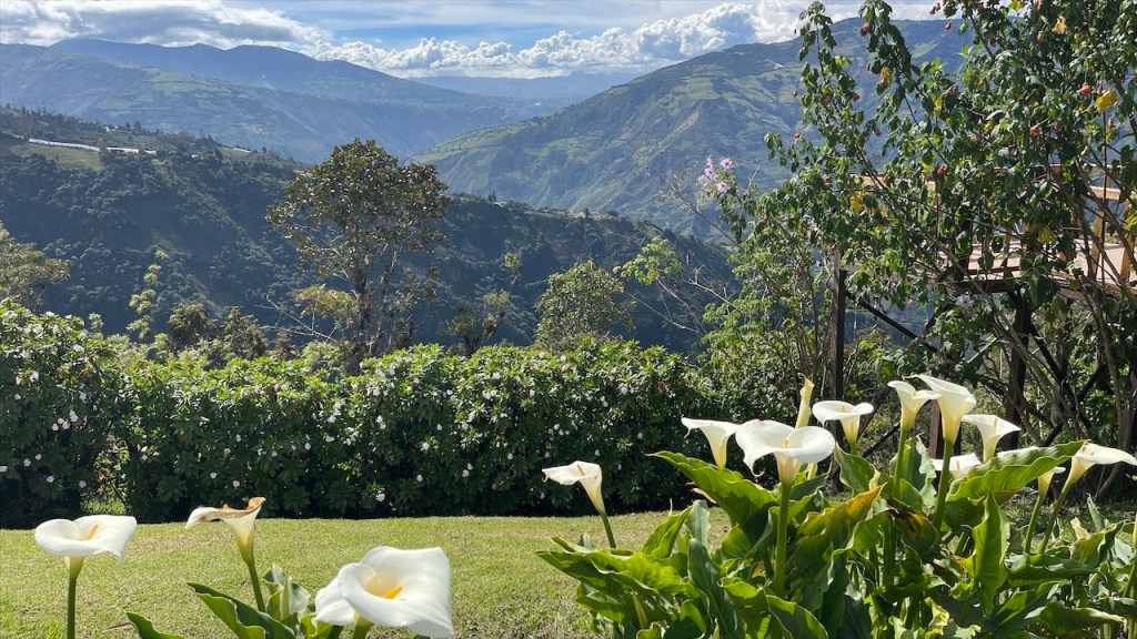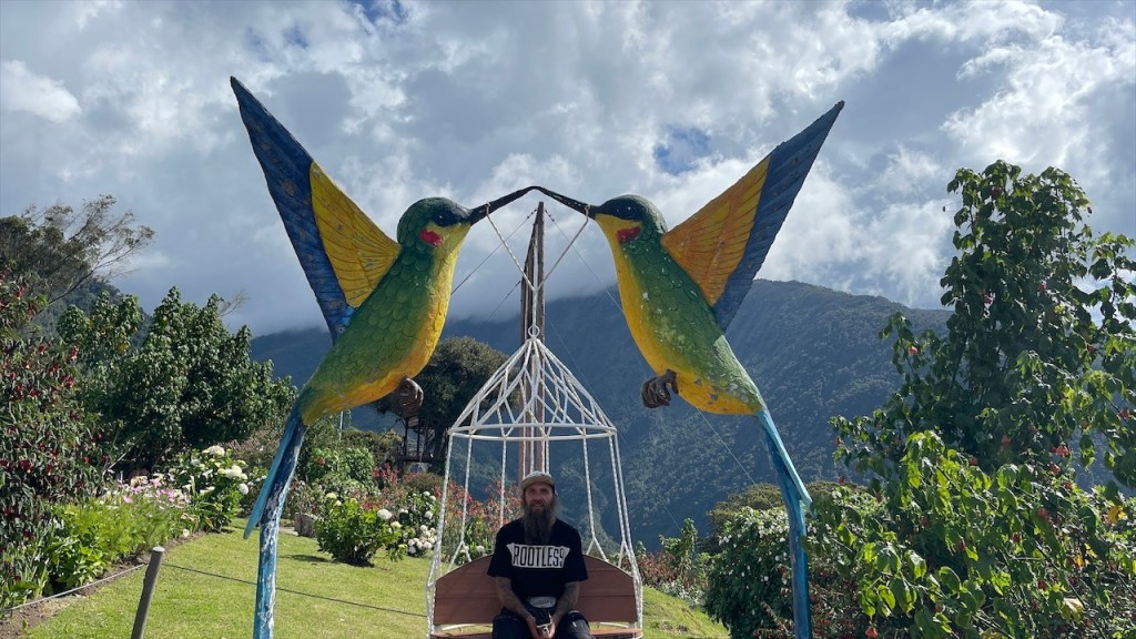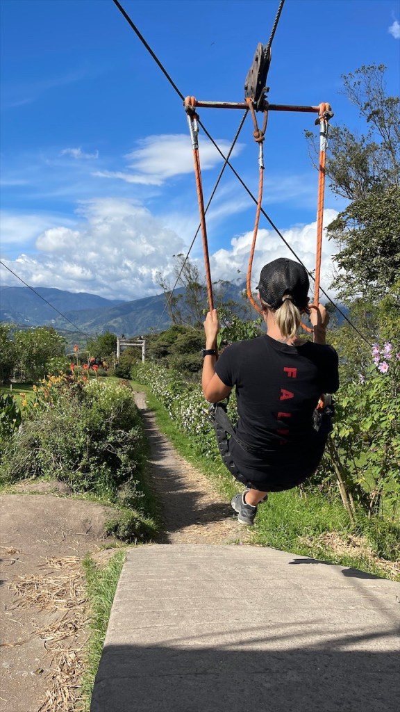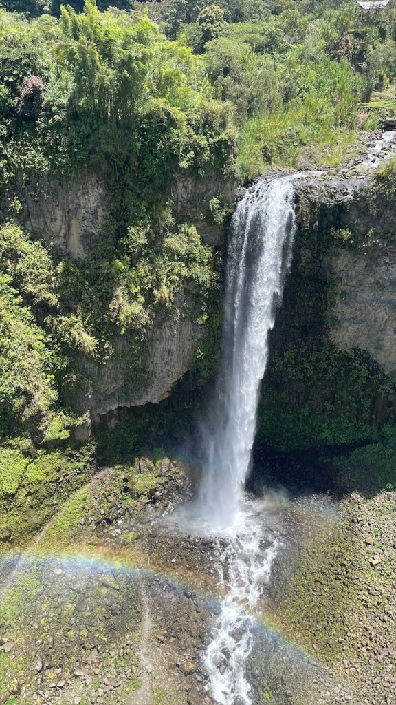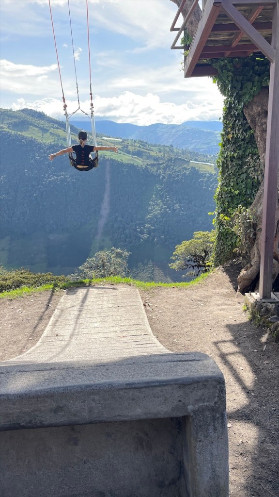 Wir schliefen richtig gut auf dem Wanderparkplatz und hatten das Gefühl, dass die Temperaturen etwas angenehmer da weniger schwül als zuvor im Amazonasbecken waren. Am nächsten Tag lachte sogar seit längerem mal wieder die Sonne von einem azurblauen Himmel. 😎 Nach dem Frühstück verließen wir den angenehmen Stellplatz um nur wenige Kilometer weiter, am Eingang zu einem der berühmtesten Wasserfälle rund um Baños, bereits wieder anzuhalten. Der Weg hinunter zum „Pailón del Diablo“ war bestens angelegt und so erreichten wir kurz darauf das Tickethäuschen. Nach dem wir pro Person 2 USD entrichtet hatten bogen wir um die Ecke von wo aus das Donnern des 80 Meter hohen Wasserfalls bereits deutlich hörbar war. Simon Adlerauge entdeckte auf dem Weg dorthin sogar noch eine hervorragend als Ast getarnte Stabschrecke. 😃 Wir näherten uns den Wassermassen und die Gischt erzeugte einen schönen Regenbogen. Auf allen Vieren krabbelten wir durch eine schmale Öffnung in der Felswand und plötzlich standen wir direkt vor dem gewaltigen Vorhang aus Wasser. 😮 Nach kurzer Überlegung entschloss ich mich, als Erste hinter diesem durchzugehen. Wohl wissend, dass ich dabei sicherlich nass werden würde. Da wir jedoch auf der anderen Seite Leute sehen konnten schlussfolgerten wir, dass sich der Weg fortsetzen und wir an einem anderen Ausgang herauskommen würden. Dies erwies sich allerdings als Trugschluss! Kaum hatte ich mich hinter dem Wasserfall durchgezwängt stand ich vor einer Wand aus Fels – es gab kein Weiterkommen! Blitzschnell machte ich kehrt und schaffte es, nur leicht nass wieder zu Simon zurückzukehren. 😅 Somit liefen wir denselben Weg, den wir gekommen waren, wieder zurück zum Auto. Der nächste Stopp war nur ein Katzensprung entfernt, natürlich wieder an einem Wasserfall! Das Highlight war nicht die Kaskade selbst sondern der Weg dorthin. Diesmal ging es mit einem „cable car“ in Form eines großen Korbes aus rotem Stahl hinüber auf die andere Seite zur „Cascada Manto de la Novia“. Am Stahlseil hängend überquerten wir die Schlucht und flogen über den unten im Canyon fließenden Fluss hinweg auf den Wasserfall zu. Wie cool war das denn bitte! Fast ein bisschen wie Zip Line. 🙃 Auf der anderen Seite angelangt gab es nicht wirklich viel zu sehen so dass wir nach einem kurzen Abstecher an den Fluss auf gleichem Wege zum Parkplatz zurückschwebten. Kurz vorm Ortseingang nach Baños bogen wir links ab und fuhren fast 800 Höhenmeter hinauf zur „Casa del Arbol“. Dort gab es erst einmal einen kleinen Mittagssnack um uns gut für die weiteren Abenteuer des Tages zu rüsten. Für den grandiosen Park verlangte man nur einen Dollar Eintritt und dafür bekam man so einiges geboten! Vor unseren Augen breitete sich ein wunderschön angelegter Garten mit herrlichen Blumen aus. Die Aussicht auf die grünen Berge sowie hinunter ins Tal setzten dem Ganzen die Krone auf. Und als wäre das nicht schon schön genug gab es noch einige coole Schaukeln, mit denen wir weit über die Bergkanten hinaus schwingen konnten. Auch das namensgebende Baumhaus war ein Schmuckstück und an den beiden Seilrutschen hatten wir vor Verlassen der Anlage noch unseren Spaß. 🤩 Auf der Rückfahrt hinab ins Tal breitete sich dann noch ein richtig schöner Regenbogen vor uns aus. Viel besser kann ein Tag wohl kaum sein. 💛 Am Ziel angelangt fanden wir, unweit vom Zentrum, einen geeigneten Stellplatz vor einem der vielen Thermalbäder in Baños. Vermutlich verhalfen diese dem Ort auch zu seinem Namen. 😉