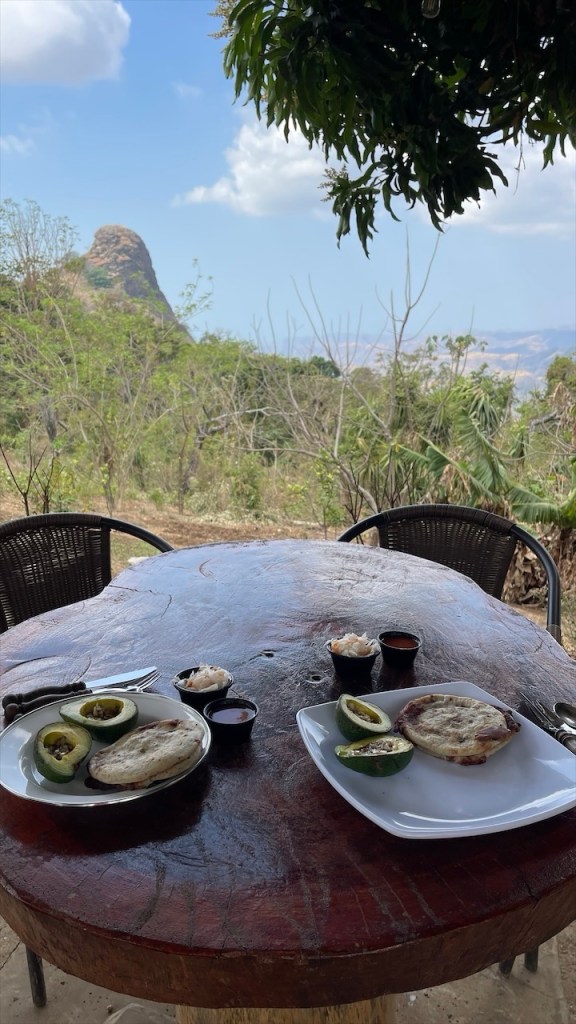 Wir wurden von den beiden Salvadorianern herzlich begrüßt und erhielten sofort einen Stellplatz auf dem kleinen, aber gemütlichen Parkplatz. Für einen kleinen Obolus von 10$ pro Nacht durften wir nicht nur den Stellplatz nutzen, sondern auch die Sitzgelegenheiten auf der Aussichtsterrasse, die Hängematten und die erfrischende Dusche. 🚿 Als besondere Geste der Gastfreundschaft schenkten sie uns reichlich Mangos und Avocados von ihrem Grundstück und überraschten uns nach Einbruch der Dunkelheit mit einer kostenlosen Portion Pupusas direkt in unserem Van. 🥭🥑🌮