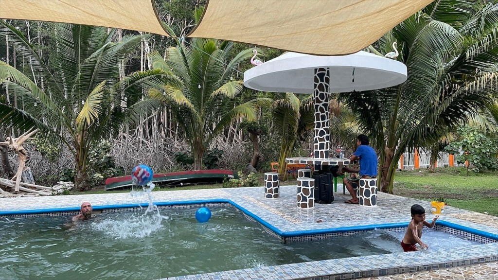 Am Mittwoch wurden Simon und ich dann erneut von Hector und Mayra überredet noch etwas länger zu bleiben. Uns fiel neuerdings auf, wie wenig die Menschen hier auf ihre Ernährung achten. Während wir unser Müsli mit Obst frühstückten konnten wir gut beobachten, wie die befreundeten Familien bereits früh am Morgen Coca-Cola tranken sowie Kuchen und Eiscreme förmlich in sich hineinstopften. 😯 Ich bin mir nicht sicher, ob man sich hier einfach keine Gedanken über die konsumierten Lebensmittel macht oder ob ihnen Gesundheit und Figur schlichtweg völlig egal sind. Auch wir bekamen am frühen Vormittag noch ein großes Eis spendiert, das der fliegende Händler mit seinem Quad samt Kühlbox und Waffeln bis zur Haustür der Familie lieferte, bevor sich die befreundete Familie von uns verabschiedete. Den Nachmittag verbrachten wir dann gemeinsam mit Mayra und ihren zwei Kindern in ihrem schönen Strandhaus. 😍 Es war ein echtes Paradies, mit einem überdachten Süßwasserpool und gemütlichen Hängematten zum Ausruhen. Nur wenige hundert Meter vom Strand entfernt befand sich das dritte Haus der Familie, das uns regelrecht die Augen aus dem Kopf fallen ließ: Ein modernes Anwesen mit einem weiteren Süßwasserpool. Ein Ort, den wir uns perfekt als Camping- oder Overlander-Platz vorstellen konnten. 😀 Wir empfahlen den beiden nachdrücklich, diese Oase auch anderen Reisenden zugänglich zu machen um nicht nur ihre Gastfreundschaft zu teilen, sondern künftig auch ein zusätzliches Standbein zu haben und sich so eine weitere Einnahmequelle zu erschließen.
