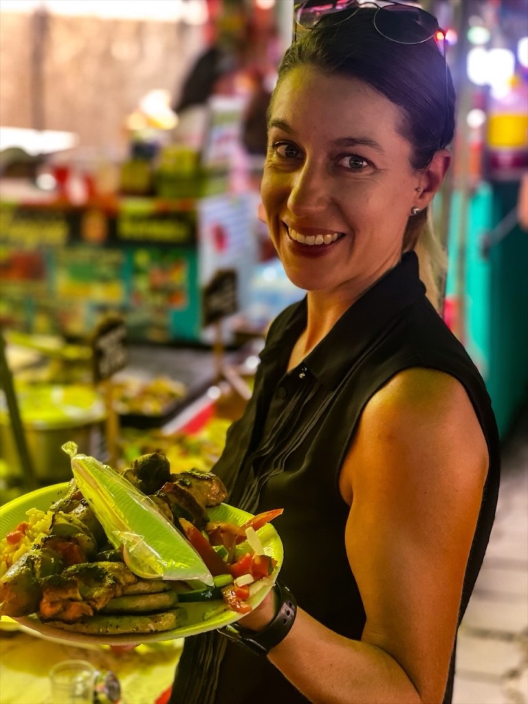 Als sich der Hunger meldete konnten wir den vielen, verlockenden Angeboten um uns herum nicht widerstehen. Wir entschieden uns für einen üppig beladenen Grillteller: Neben zwei saftigen Hähnchenspießen gab es reichlich Beilagen wie Tortillas, Gemüse und Reis – zum Glück hatten wir von vorneherein entschieden uns das Essen zu teilen.