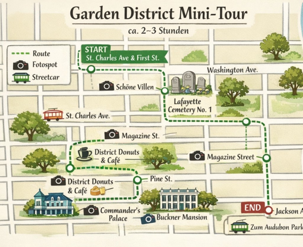 Unser Ausgangspunkt war, ganz pragmatisch, der Walmart-Parkplatz 📍 29.926371, -90.069262 zu dem wir am Morgen vom Übernachtungsparkplatz gewechselt waren. Ideal gelegen für einen Spaziergang durch den Garden District und gleichzeitig perfekt für einen Einkauf. Dort patrouillierten sogar Polizei und private Security, aber selbst ohne diese Präsenz hätten wir unseren Van guten Gewissens stehen lassen. Die Gegend wirkte ruhig, gepflegt und sehr sicher.